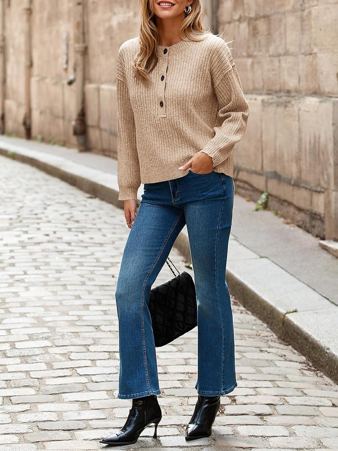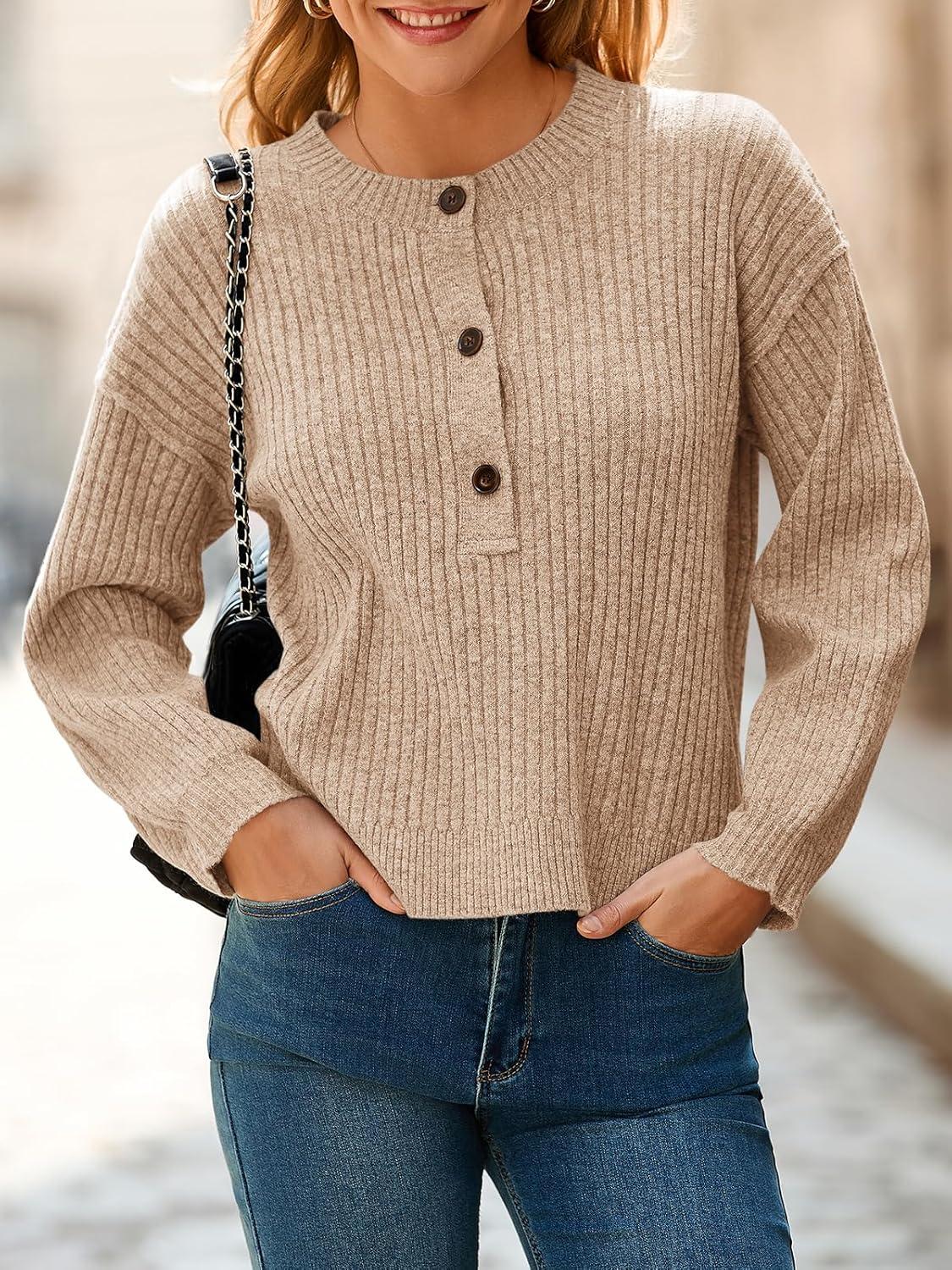 Saodimallsu Womens Henley Sweater Tops Fall Button Crew Neck Long Sleeve Trendy Loose Ribbed Knit Pullover Sweaters(Camel)
