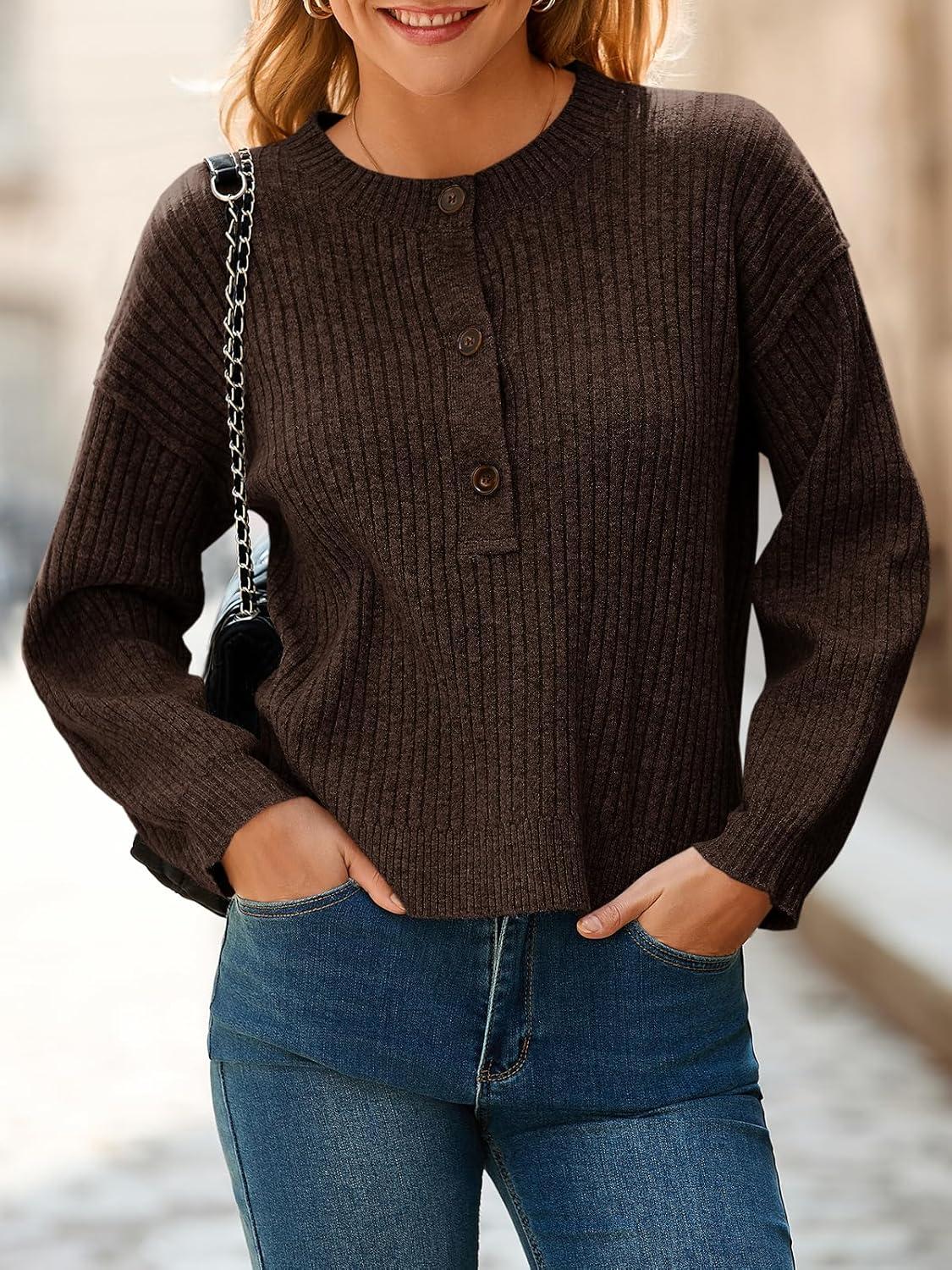 Saodimallsu Womens Henley Sweater Tops Fall Button Crew Neck Long Sleeve Trendy Loose Ribbed Knit Pullover Sweaters(Coffee)