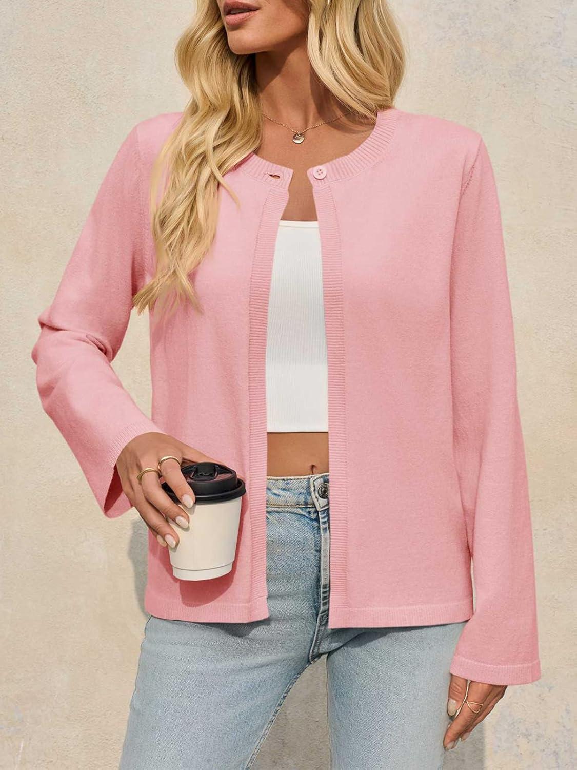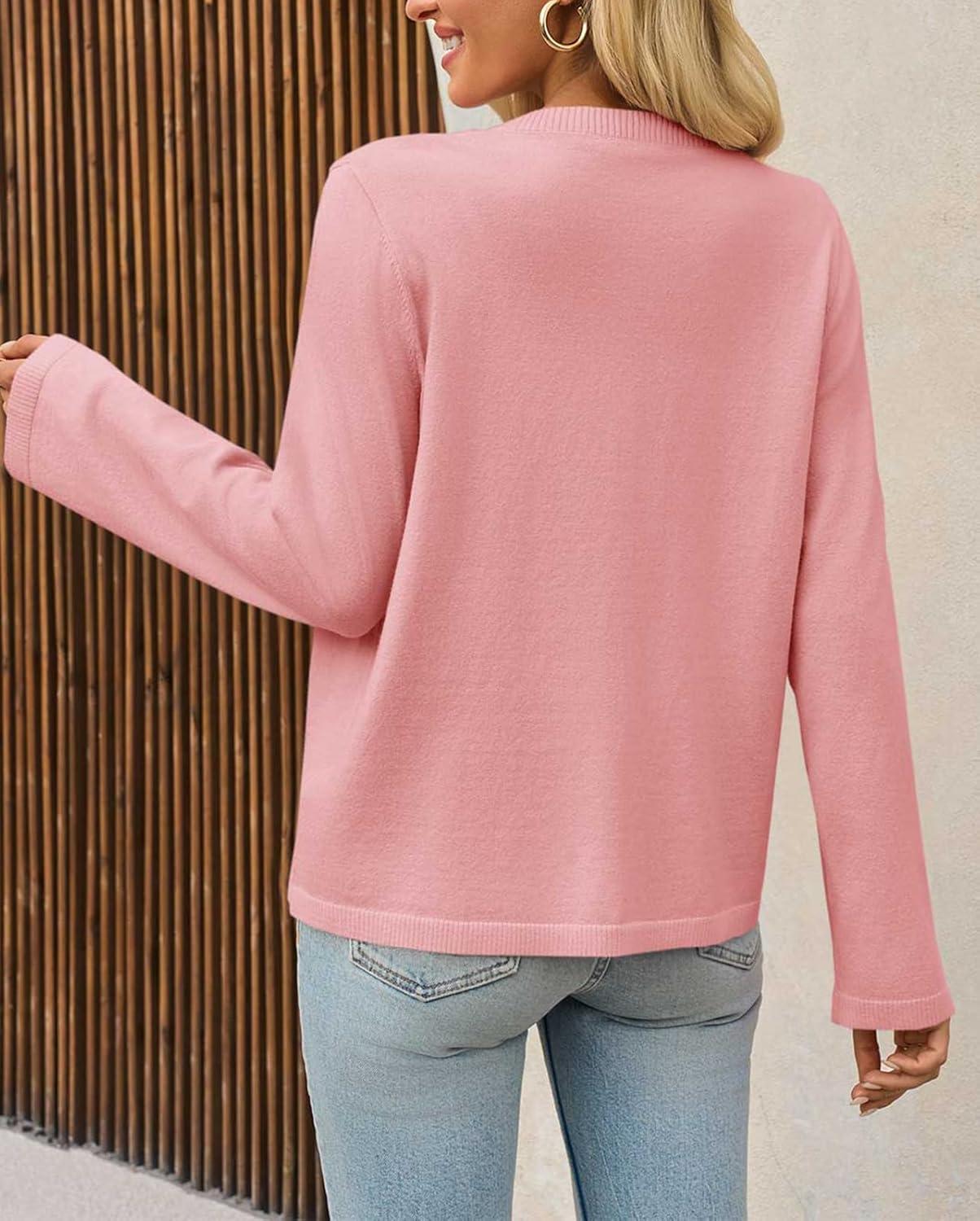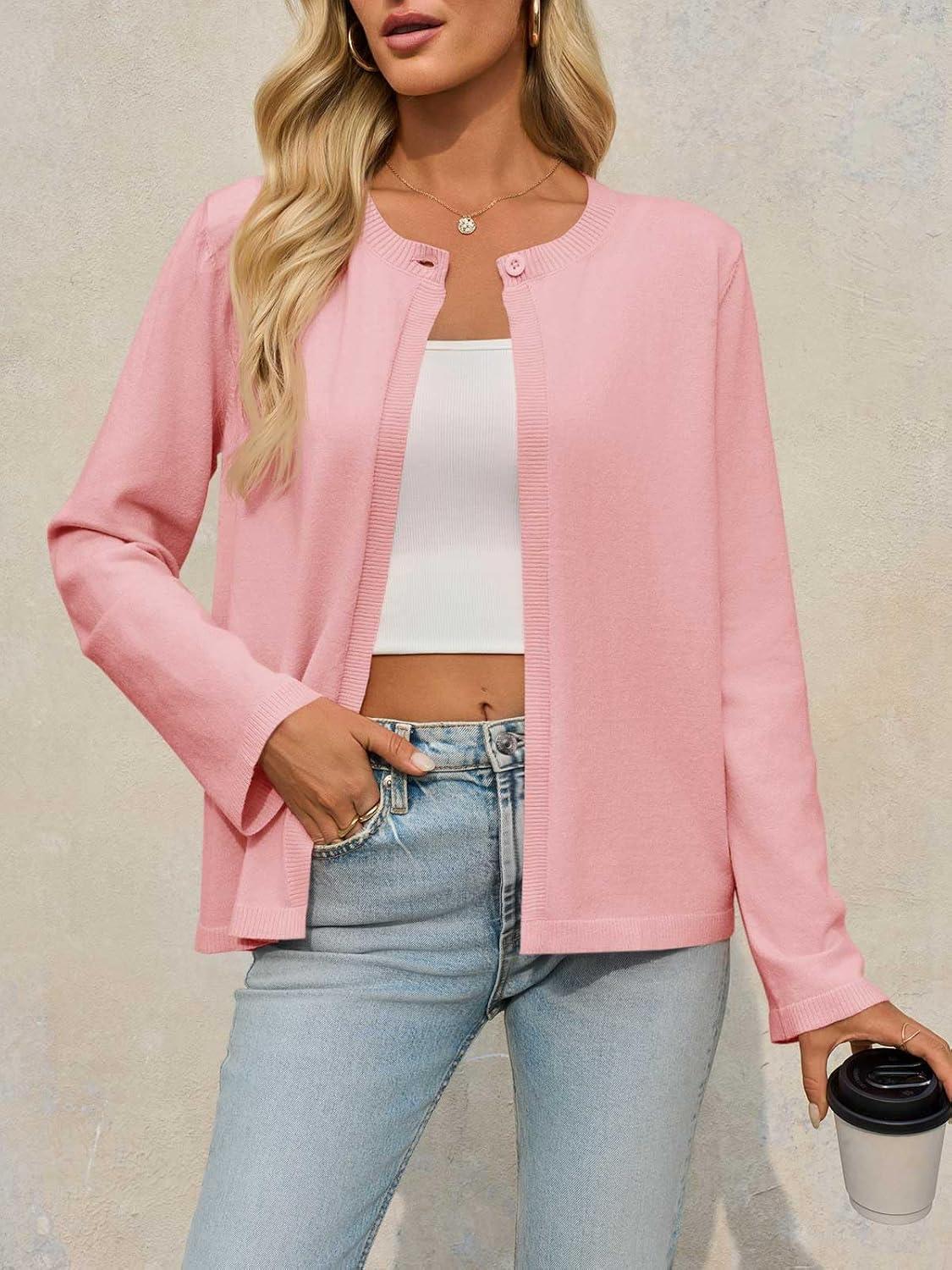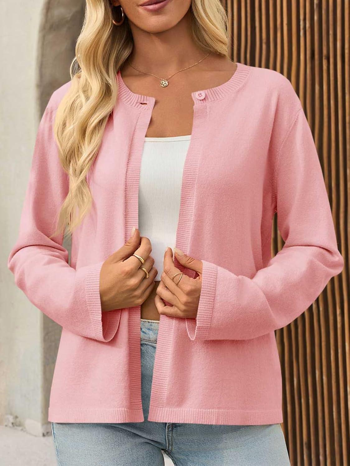Saodimallsu Womens Lightweight Cardigans Open Front Long Sleeve One Button Casual Crewneck Loose Knit Shrug Sweater(Pink)