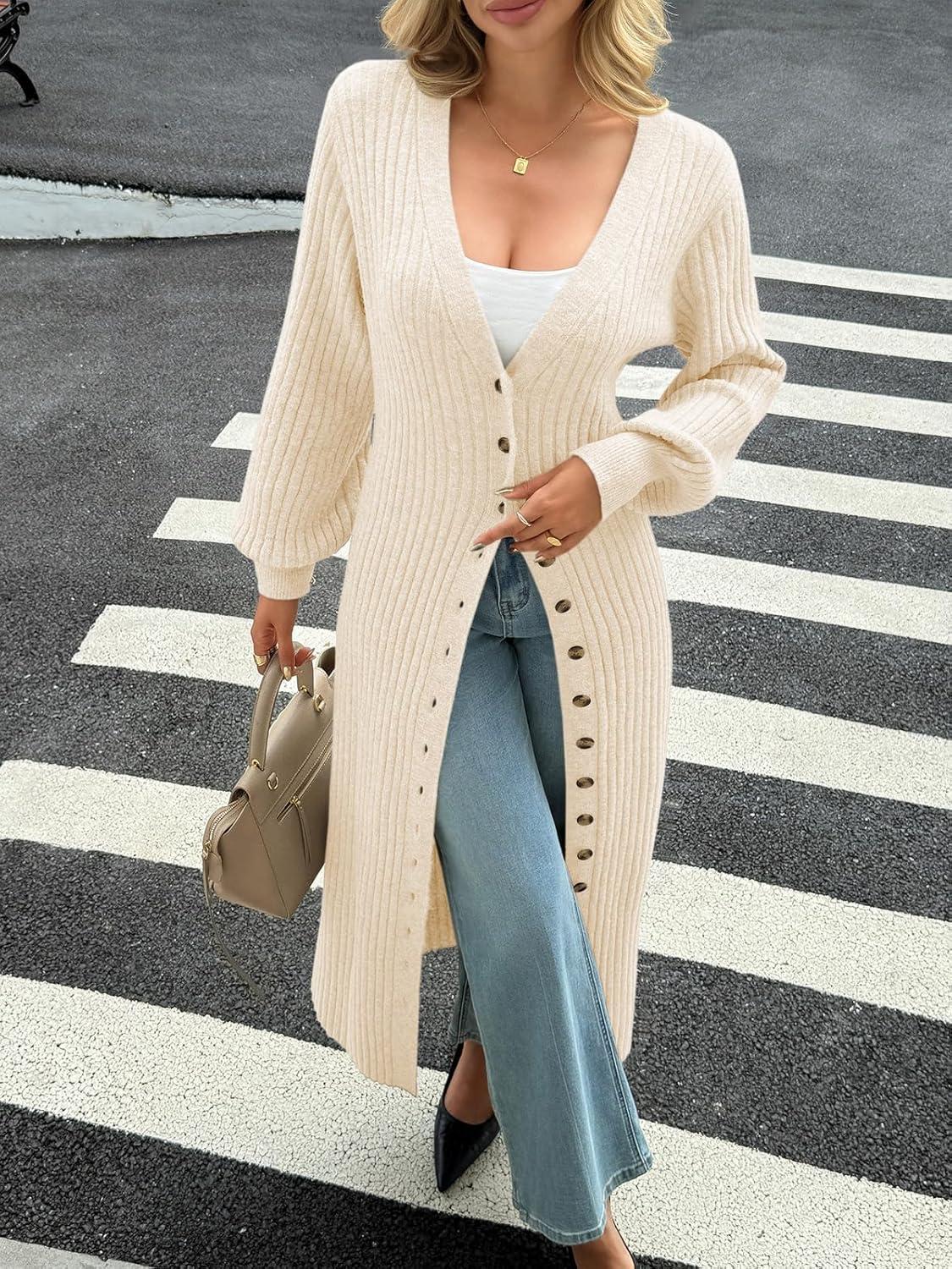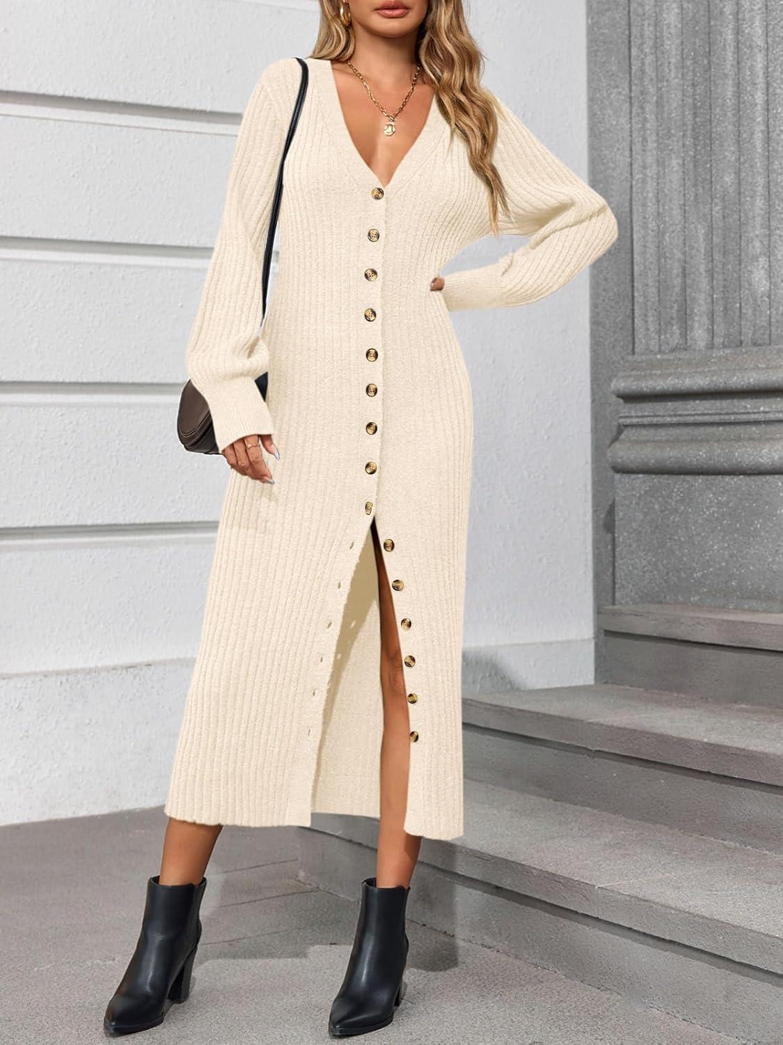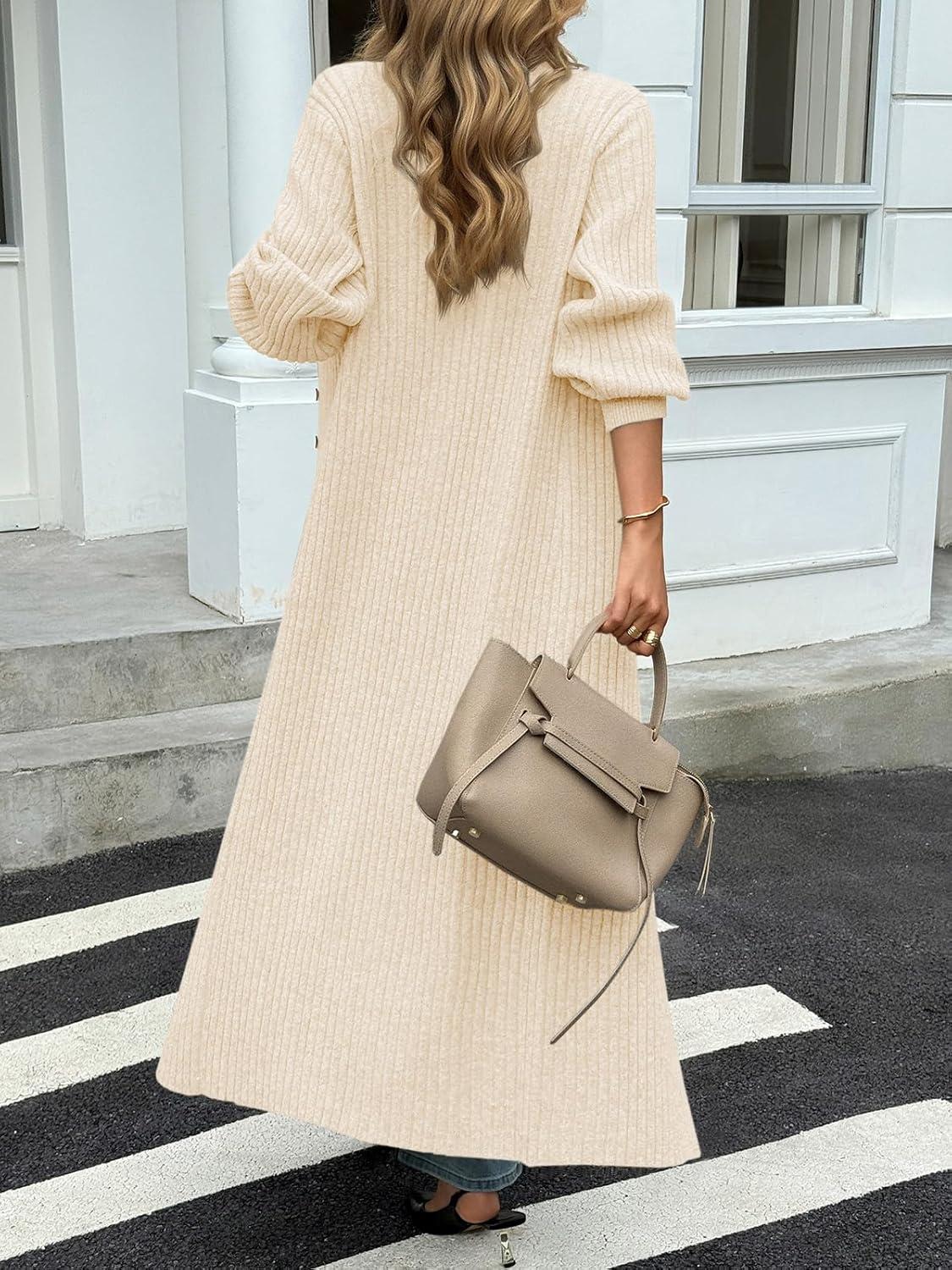 Saodimallsu Womens Long Cardigans V Neck Button Down Chunky Knit Dusters Sweater Coat Fall Trendy Maxi Sweater Dress(Beige)