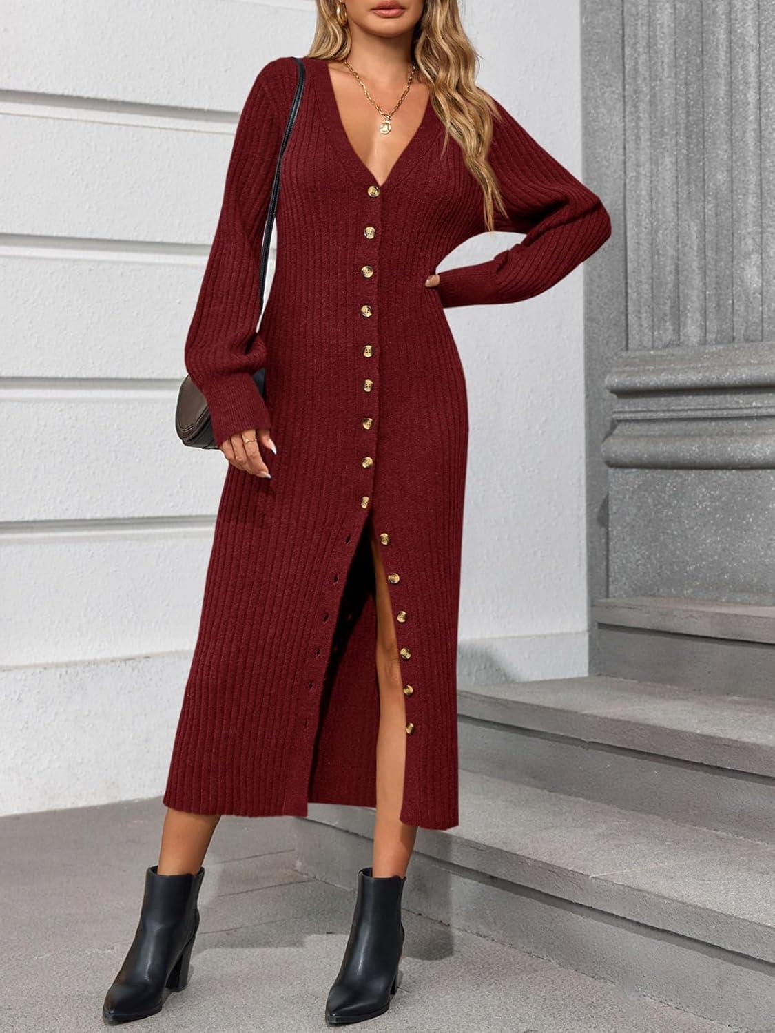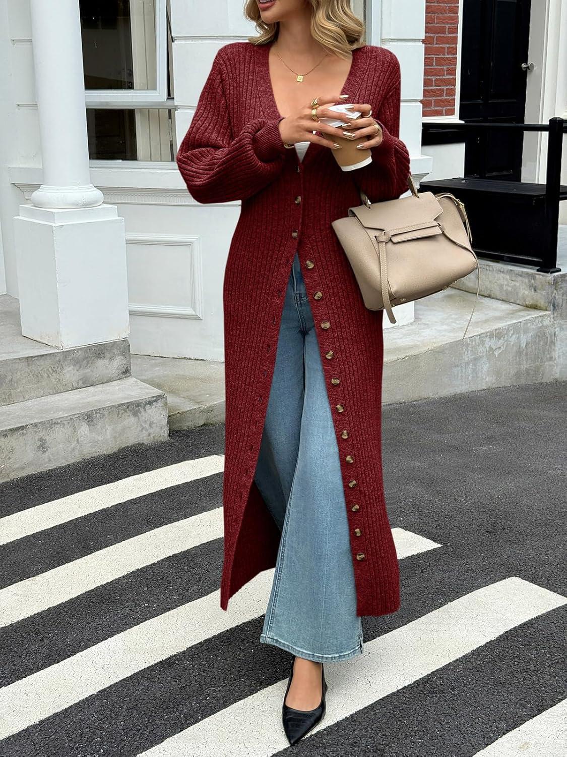 Saodimallsu Womens Long Cardigans V Neck Button Down Chunky Knit Dusters Sweater Coat Fall Trendy Maxi Sweater Dress(Burgundy)