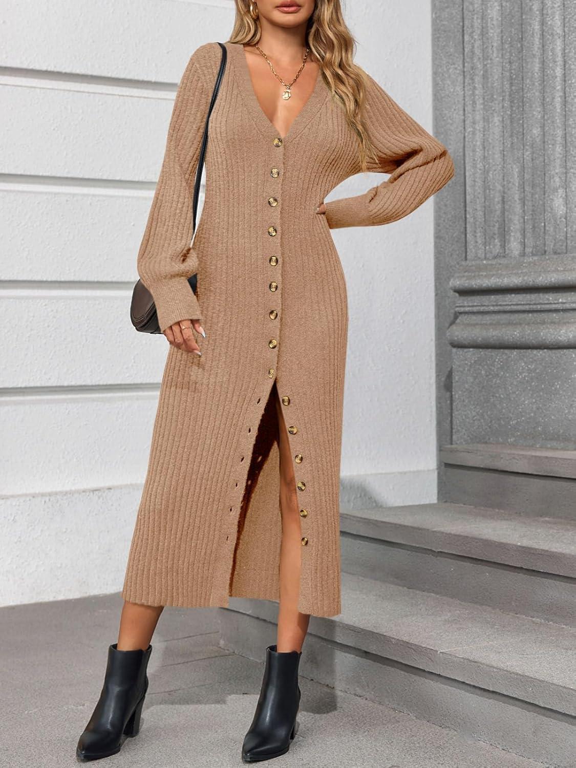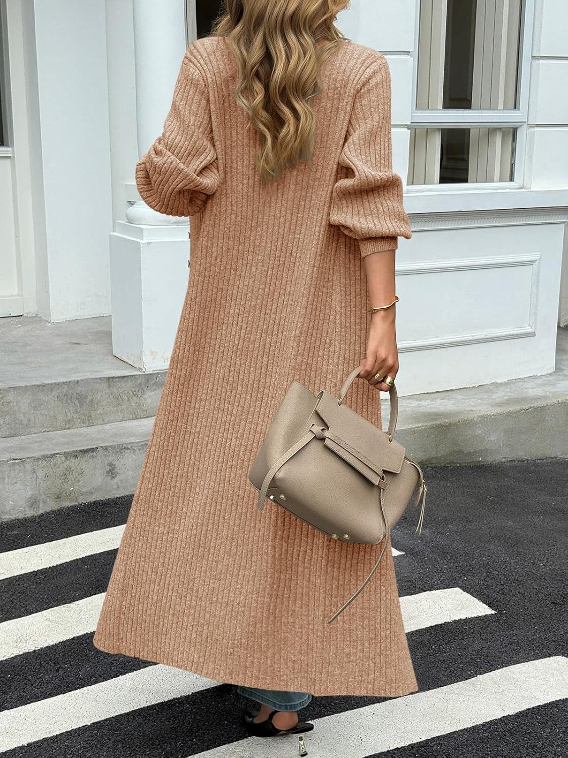Saodimallsu Womens Long Cardigans V Neck Button Down Chunky Knit Dusters Sweater Coat Fall Trendy Maxi Sweater Dress(Camel)