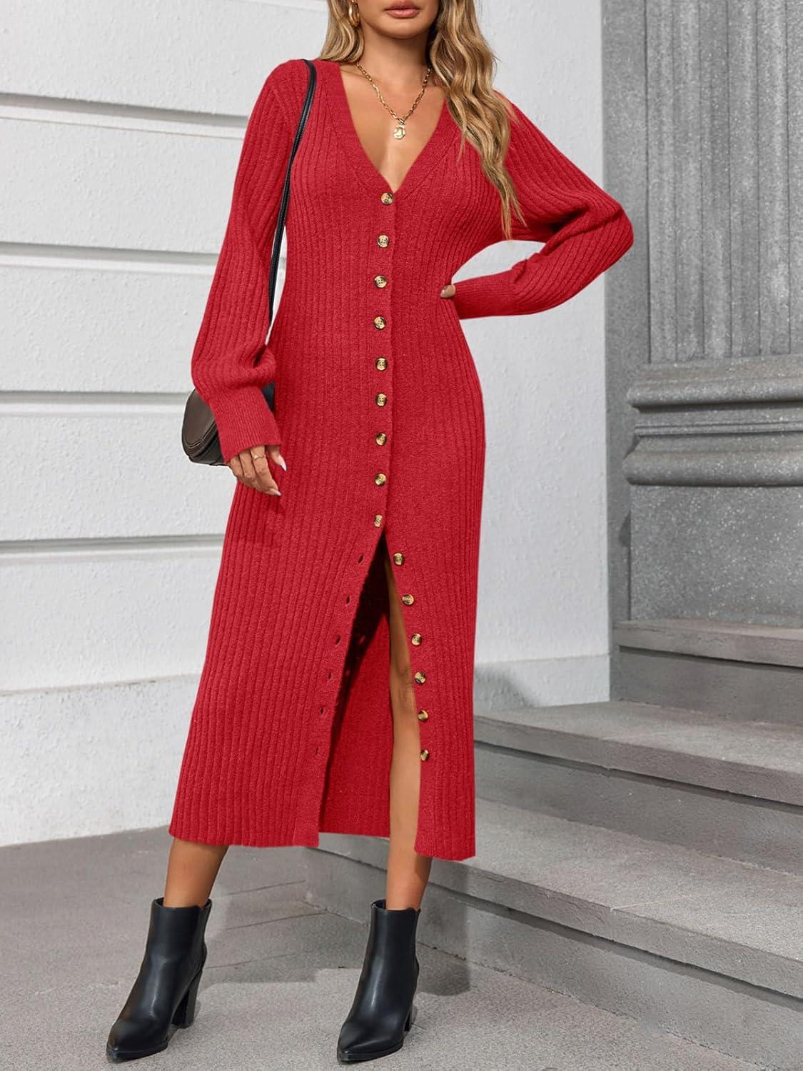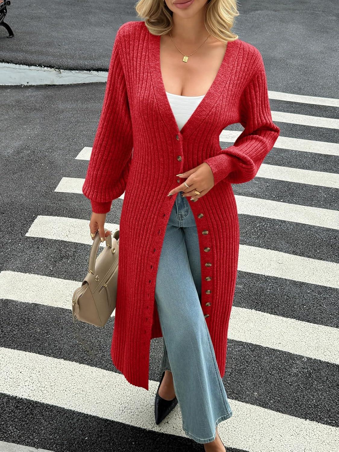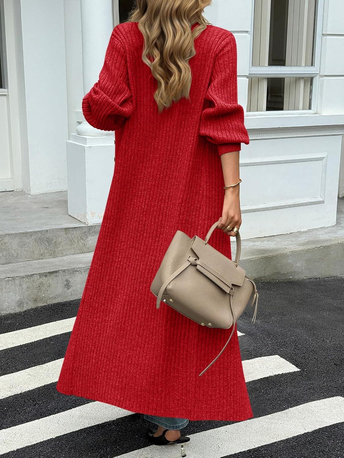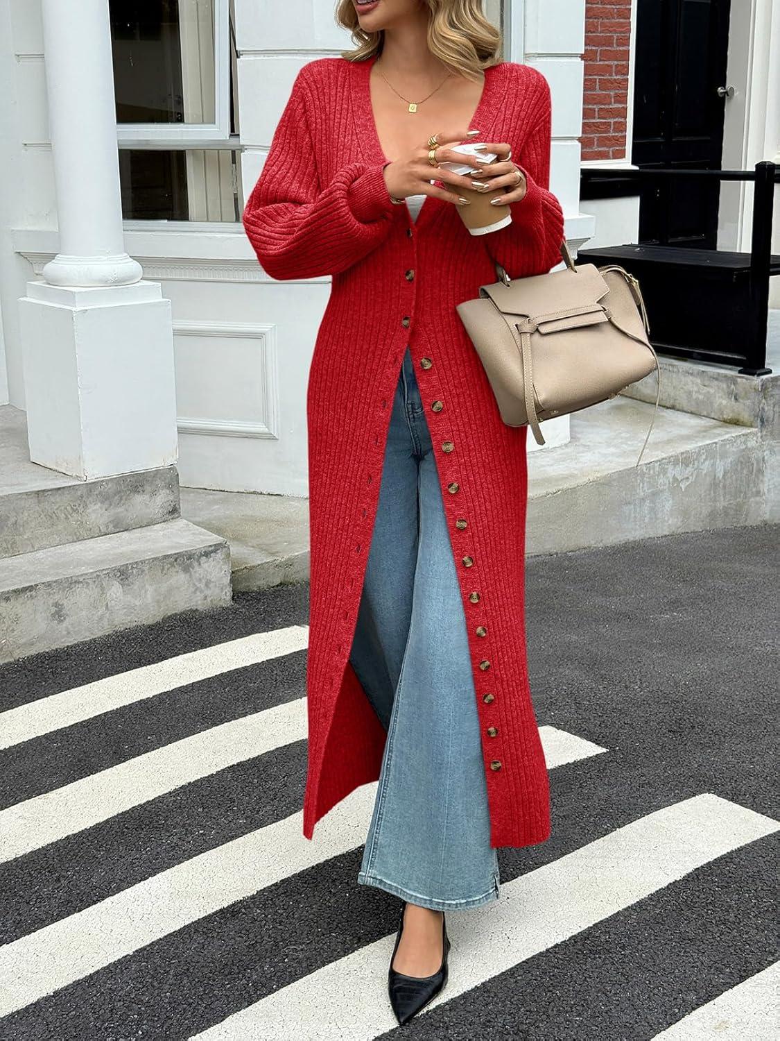 Saodimallsu Womens Long Cardigans V Neck Button Down Chunky Knit Dusters Sweater Coat Fall Trendy Maxi Sweater Dress(Red)