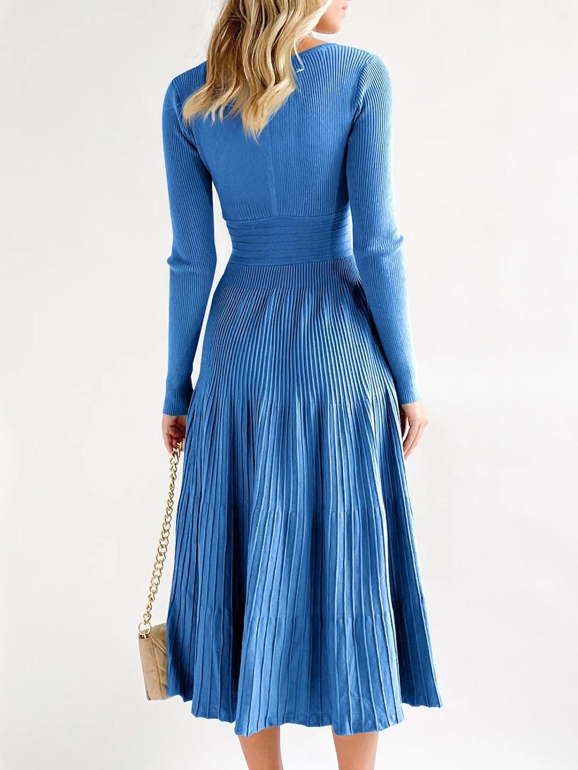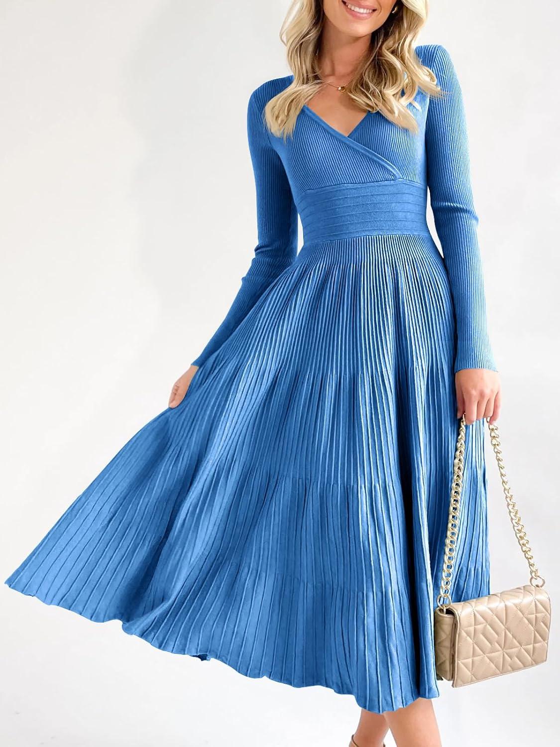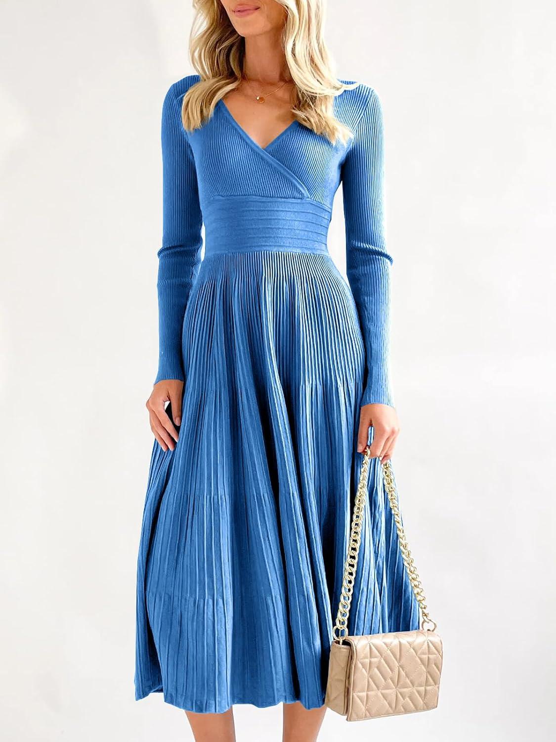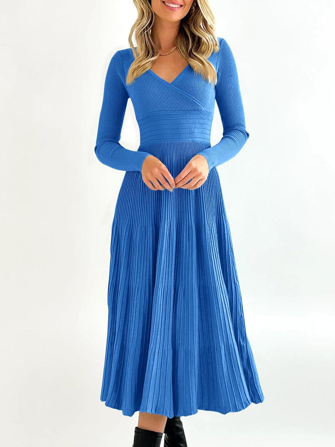 Saodimallsu Womens Long Sleeve Midi Sweater Dress Wrap V Neck Pleated A Line Fit Flare Elegant Knit Maxi Dress(Blue)
