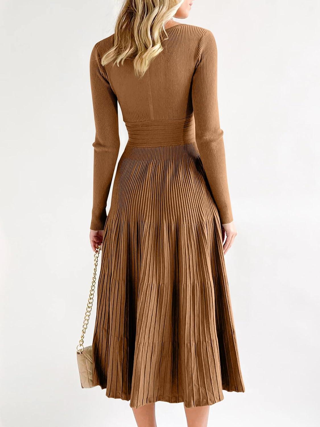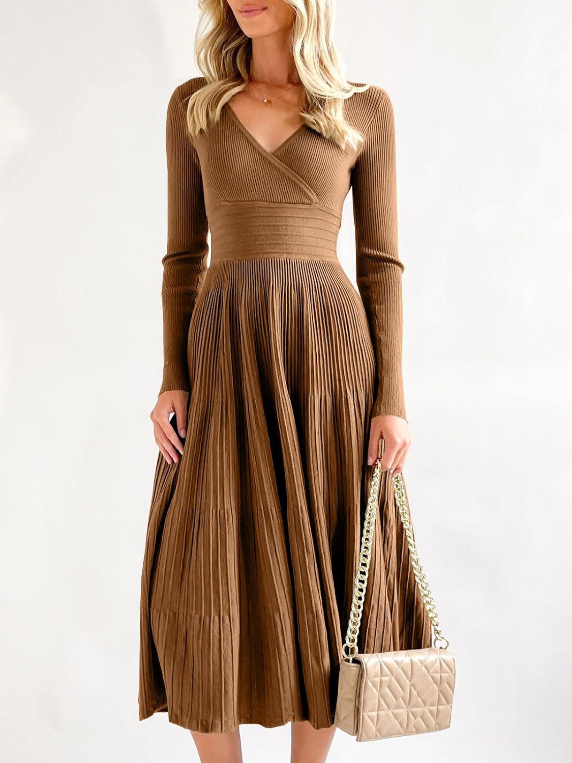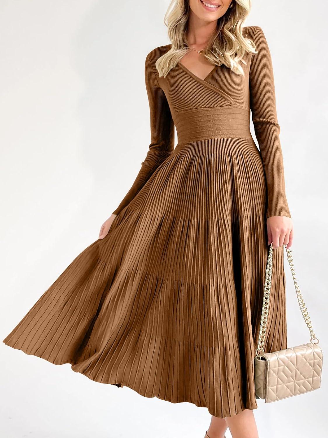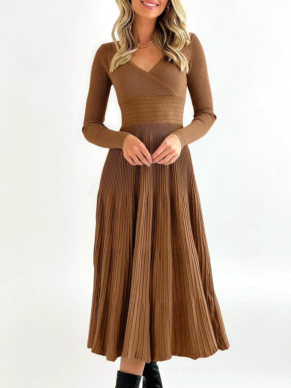 Saodimallsu Womens Long Sleeve Midi Sweater Dress Wrap V Neck Pleated A Line Fit Flare Elegant Knit Maxi Dress(Brown)
