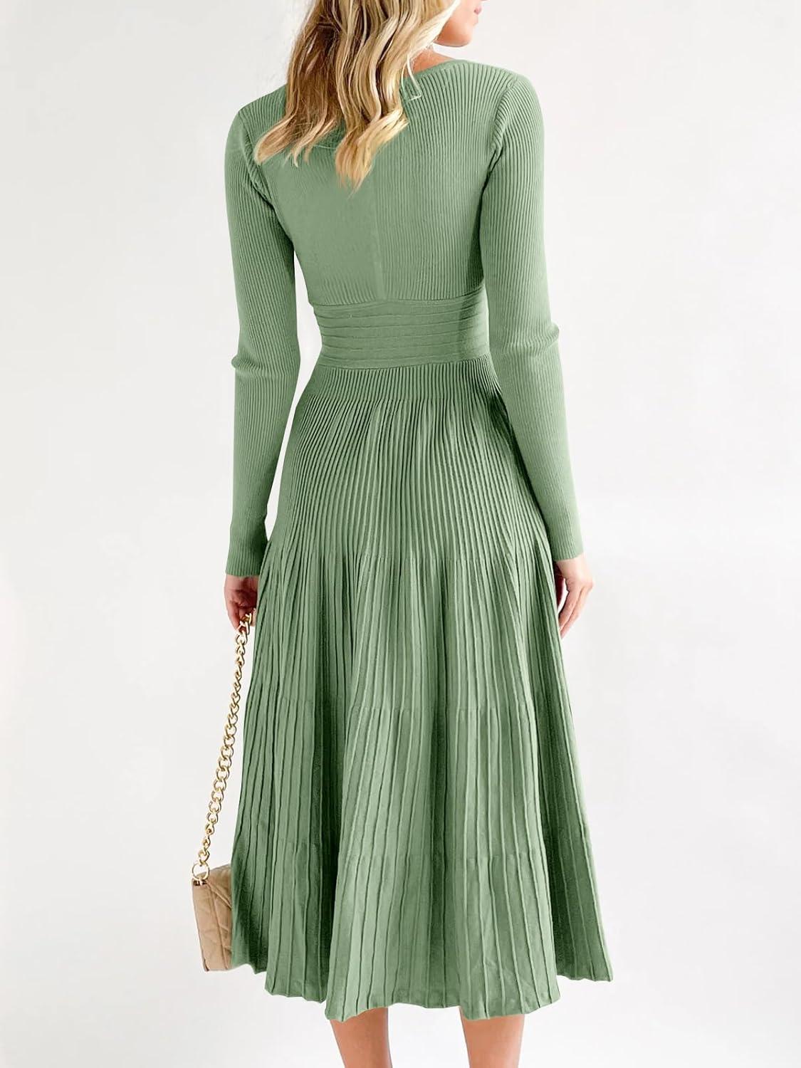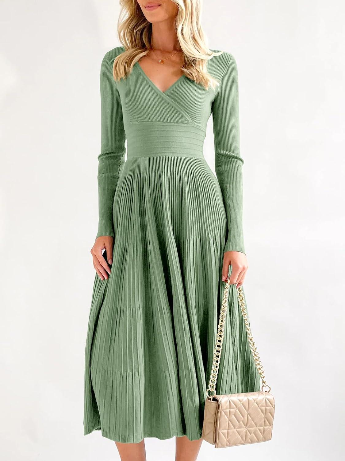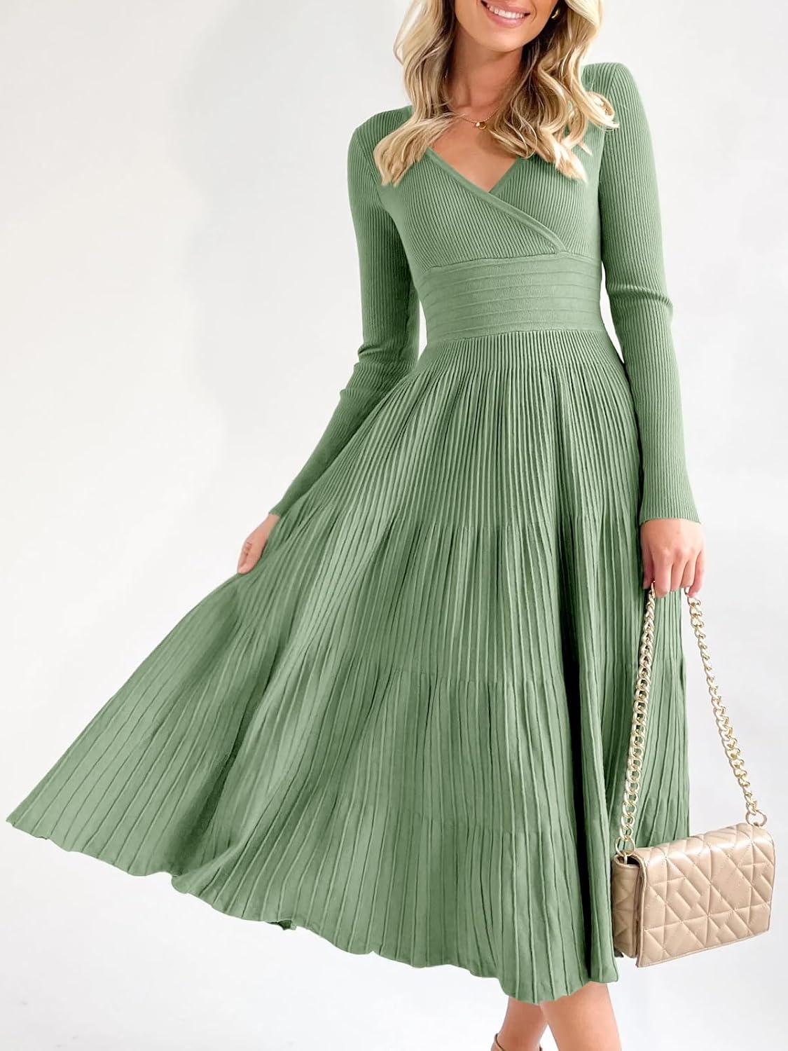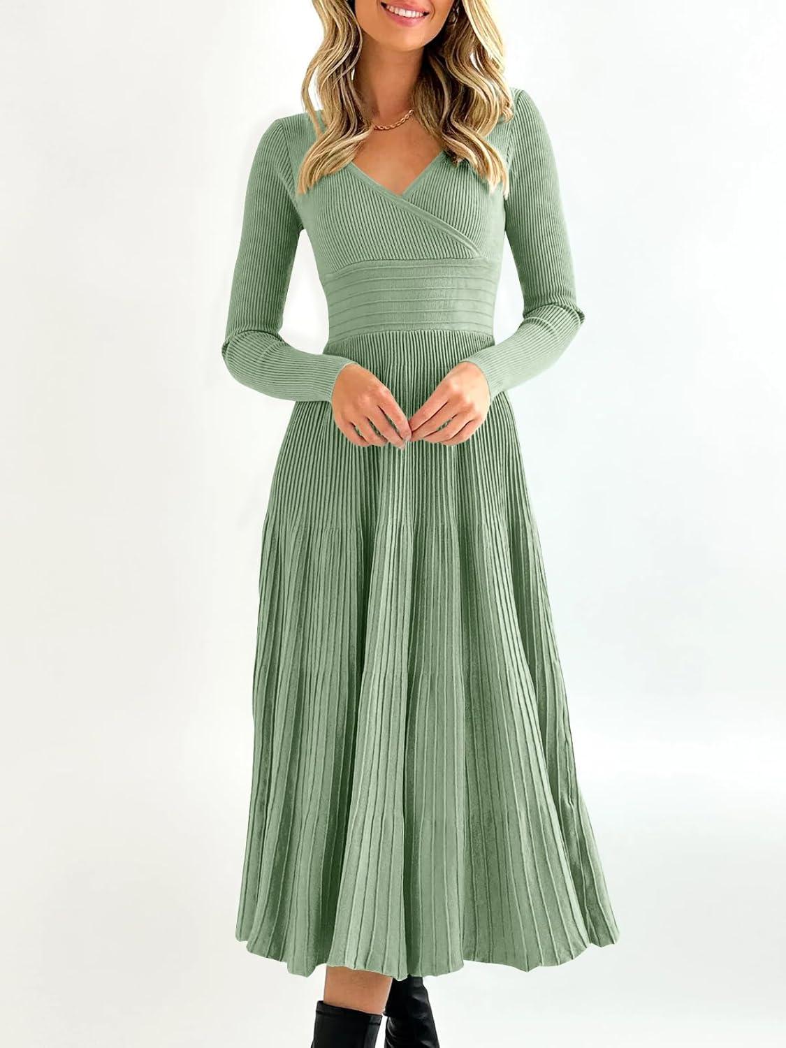 Saodimallsu Womens Long Sleeve Midi Sweater Dress Wrap V Neck Pleated A Line Fit Flare Elegant Knit Maxi Dress(Light Green)