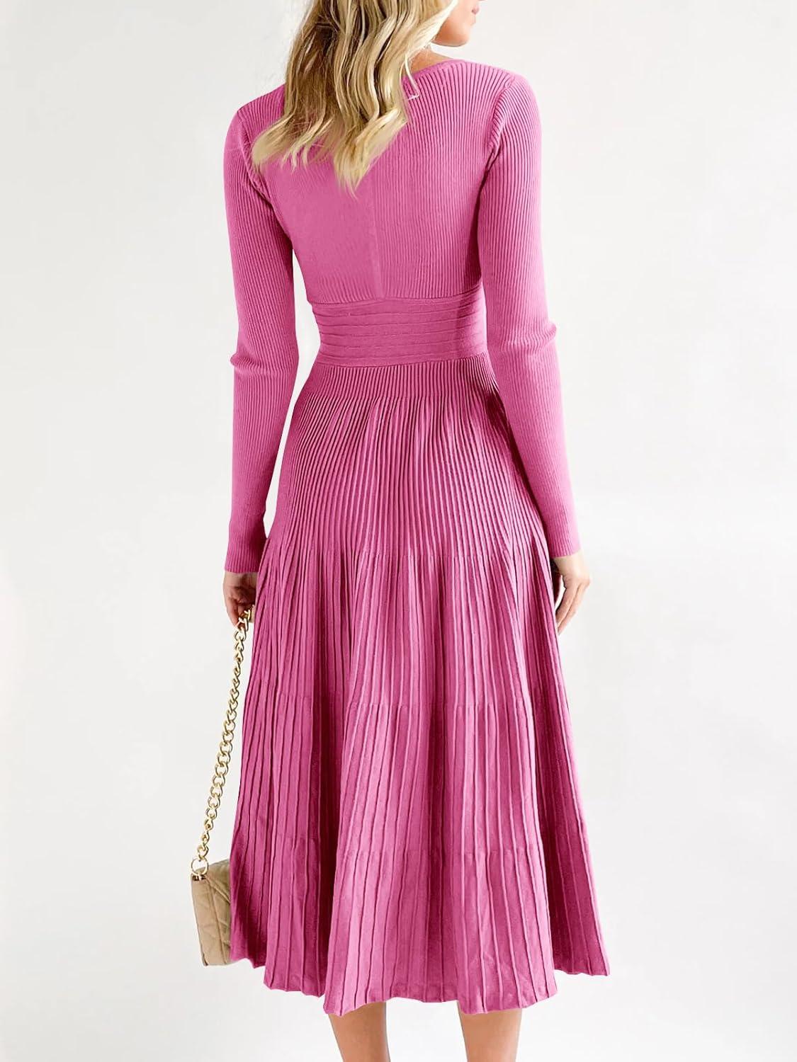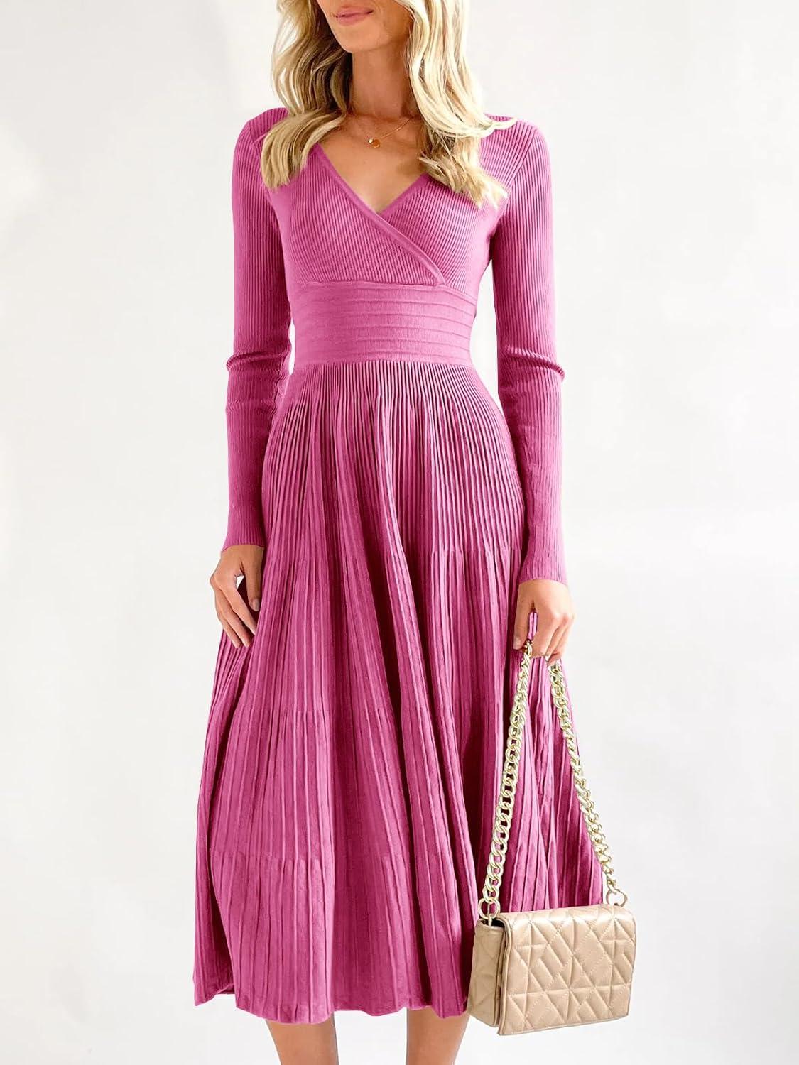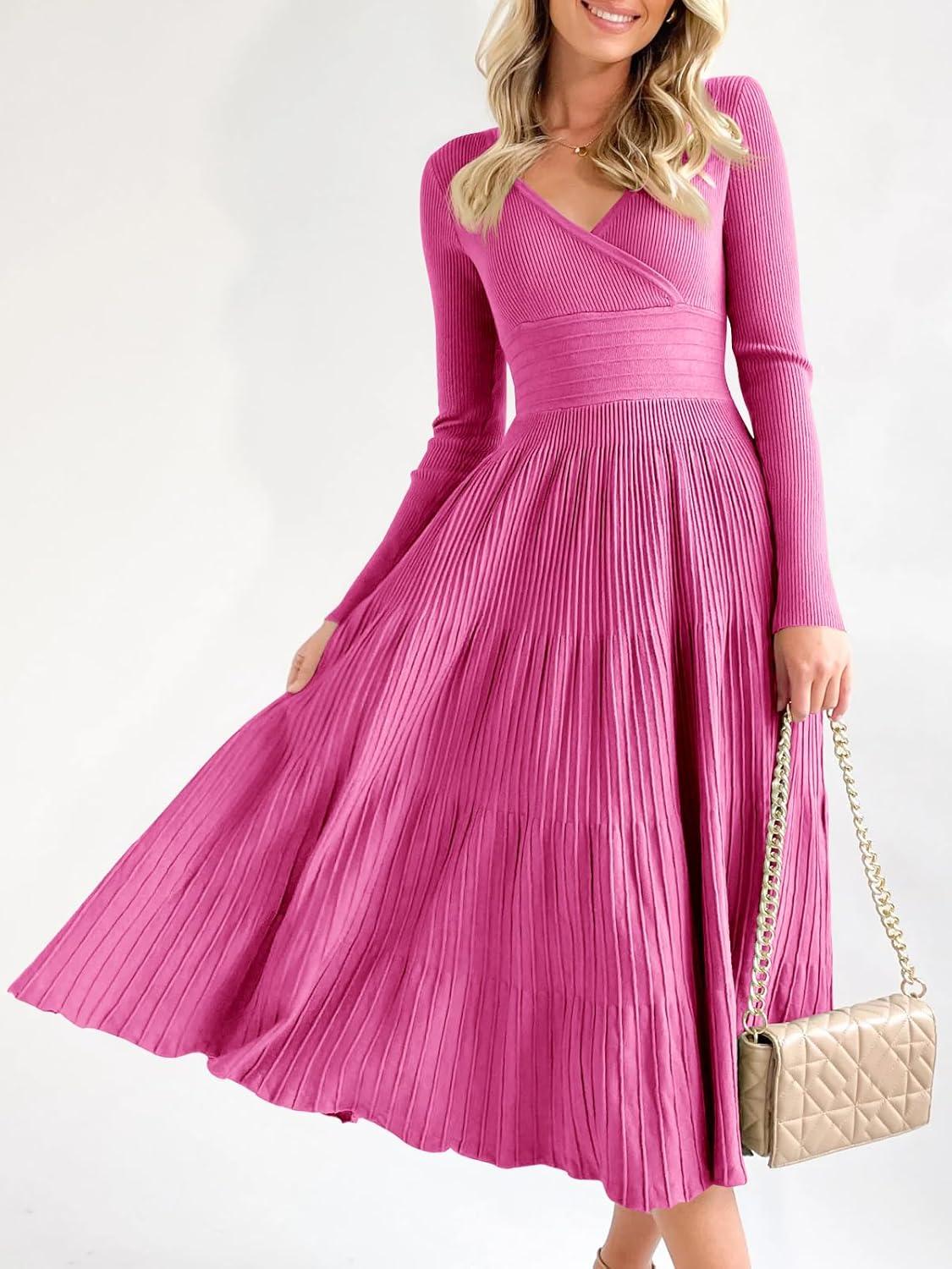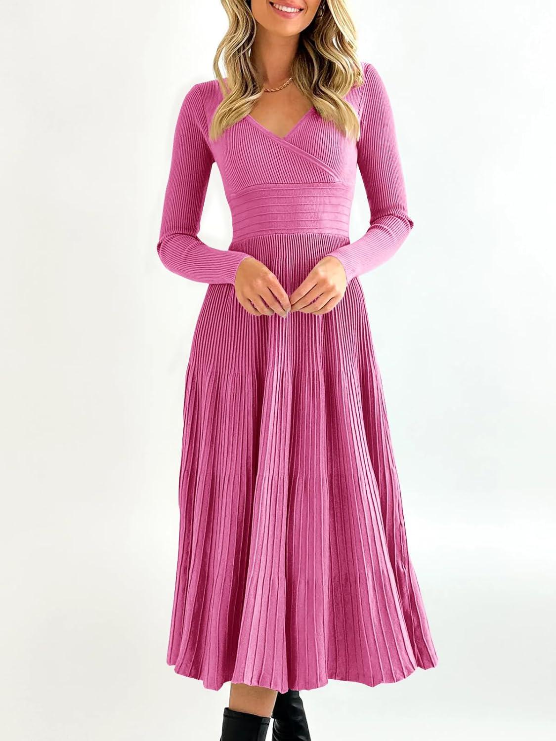 Saodimallsu Womens Long Sleeve Midi Sweater Dress Wrap V Neck Pleated A Line Fit Flare Elegant Knit Maxi Dress(Rose Red)