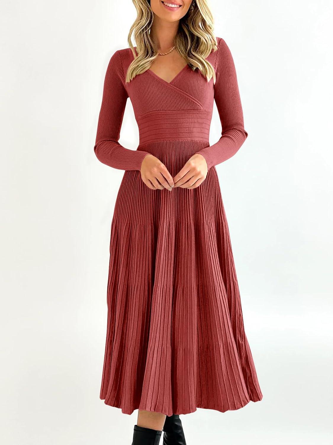 Saodimallsu Womens Long Sleeve Midi Sweater Dress Wrap V Neck Pleated A Line Fit Flare Elegant Knit Maxi Dress(Wine Red)