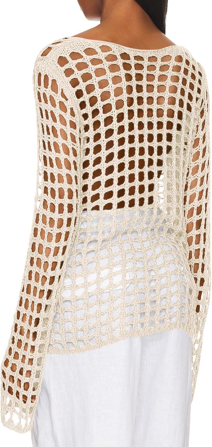 Saodimallsu Womens Long Sleeve Swimsuit Coverup Crochet Hollow Out Tie Front Swim Cover Up Knit Cardigan(Creamy-white)