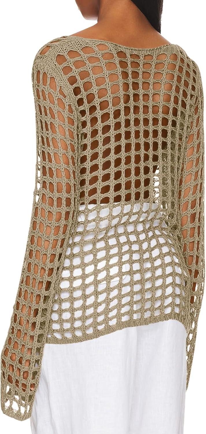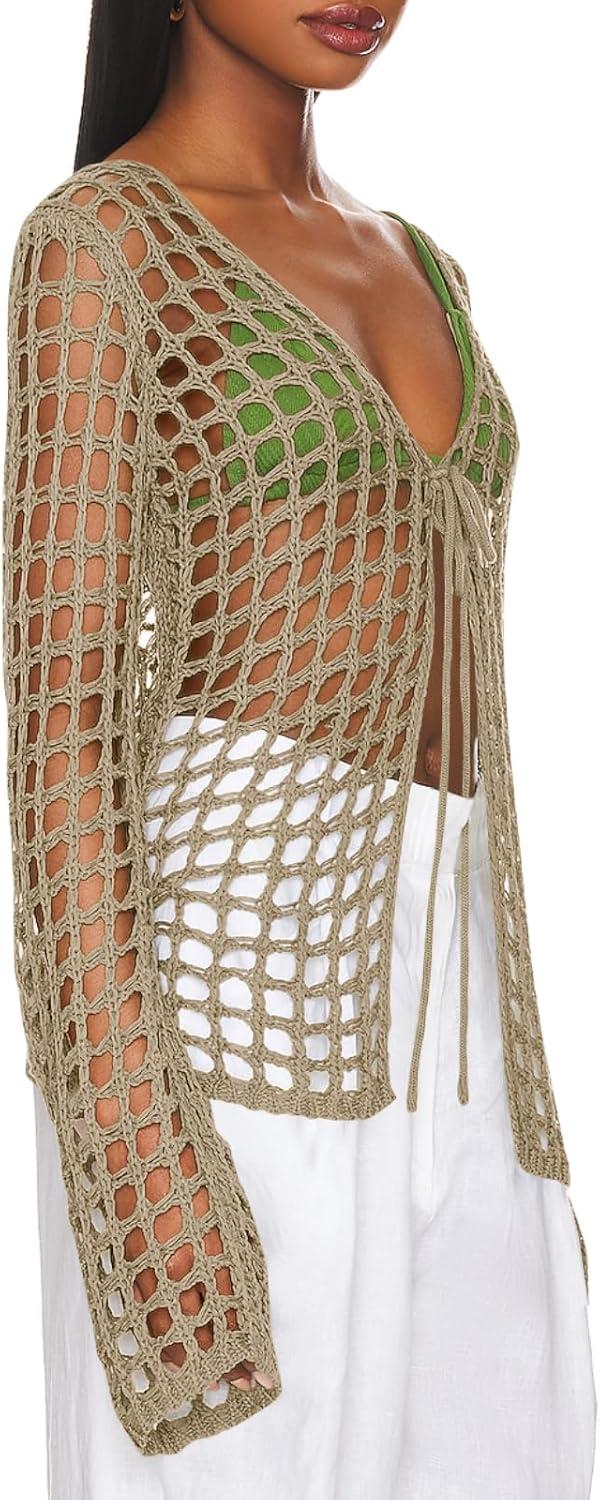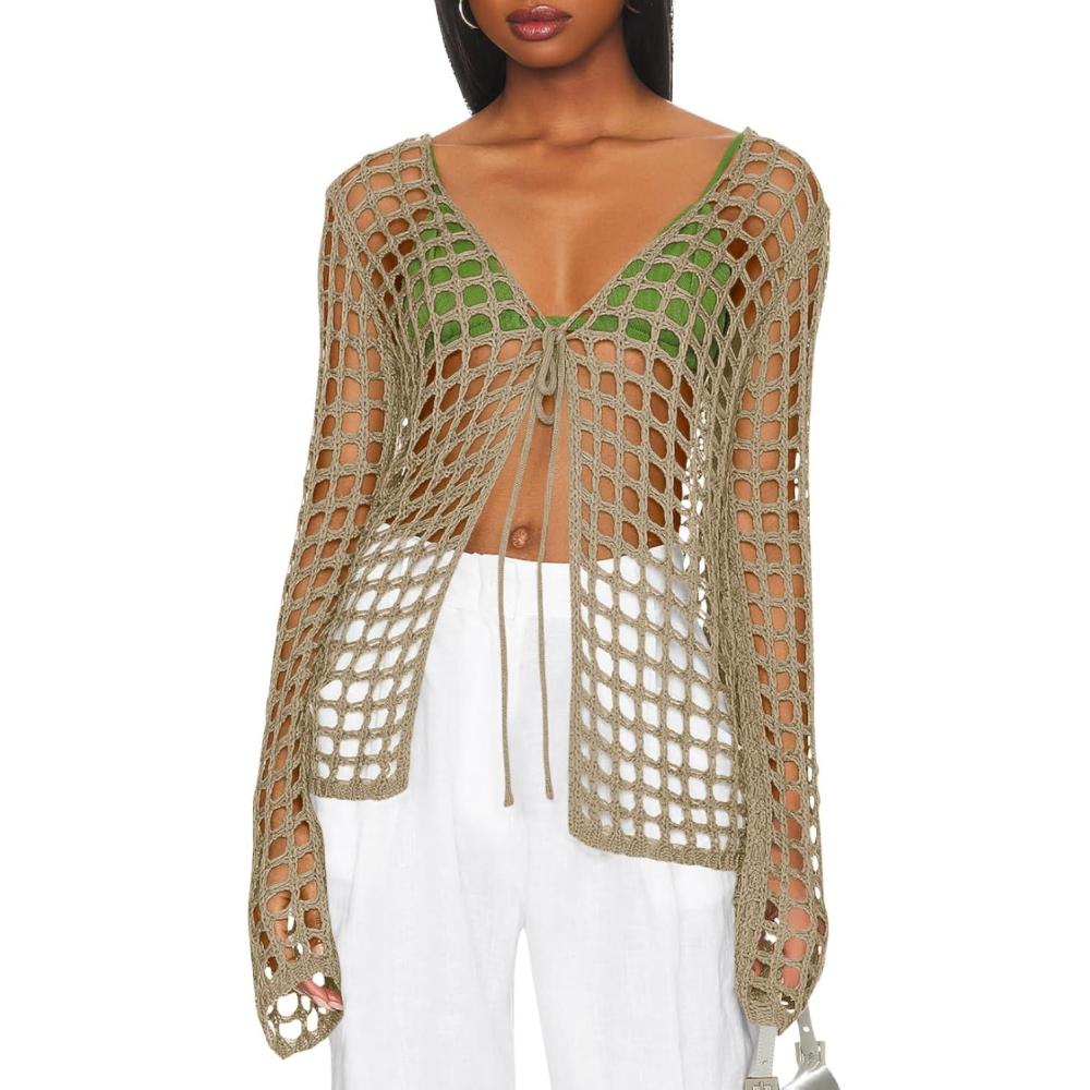 Saodimallsu Womens Long Sleeve Swimsuit Coverup Crochet Hollow Out Tie Front Swim Cover Up Knit Cardigan(Khaki)