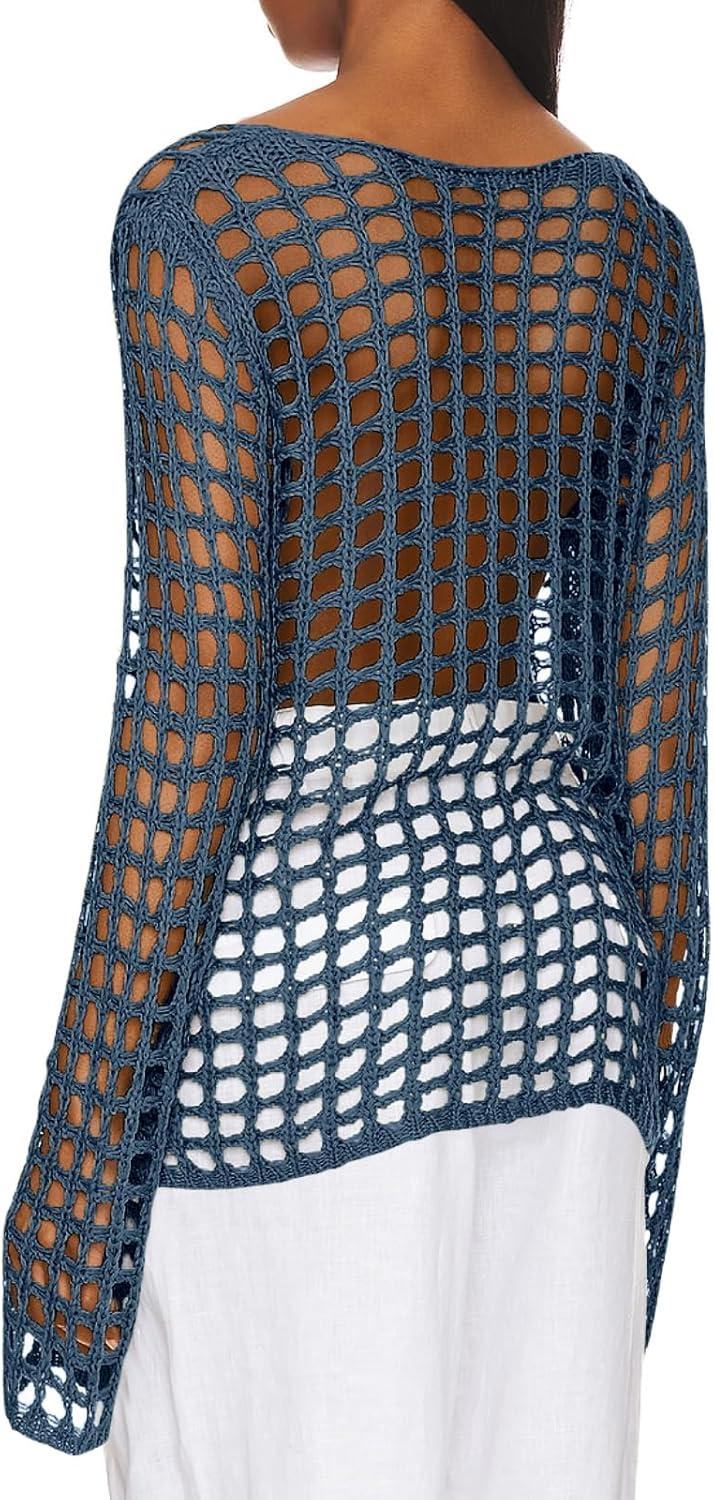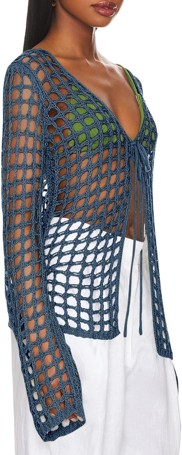 Saodimallsu Womens Long Sleeve Swimsuit Coverup Crochet Hollow Out Tie Front Swim Cover Up Knit Cardigan(Navy)