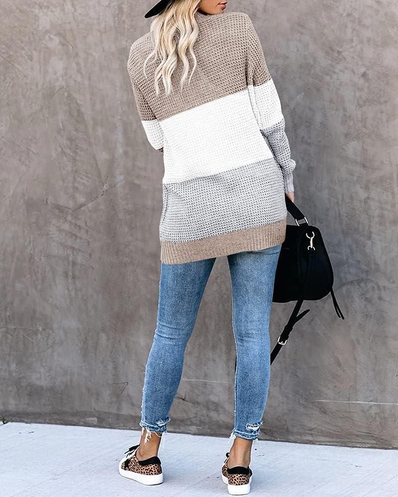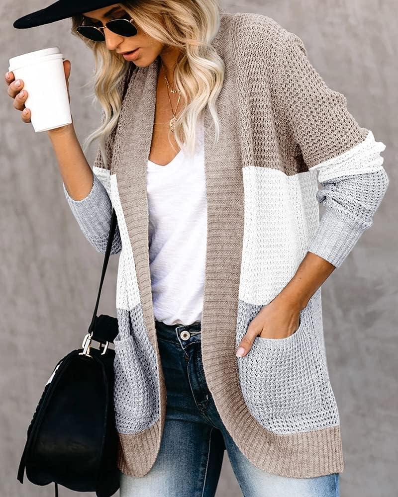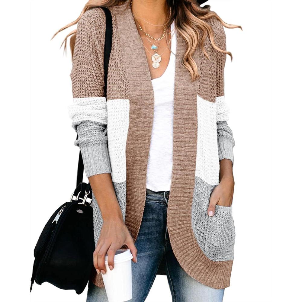 Saodimallsu Womens Loose Open Front Cardigan Long Sleeve Casual Lightweight Soft Knit Sweaters Coat with Pockets(Z Colorblock Khaki)