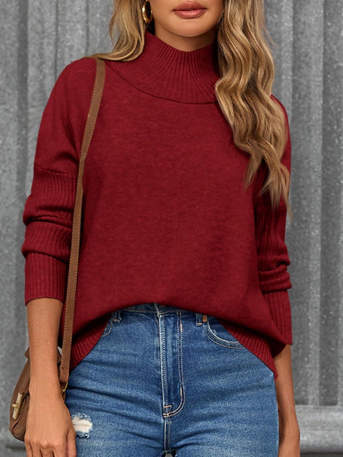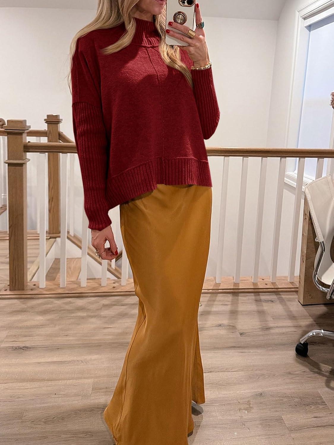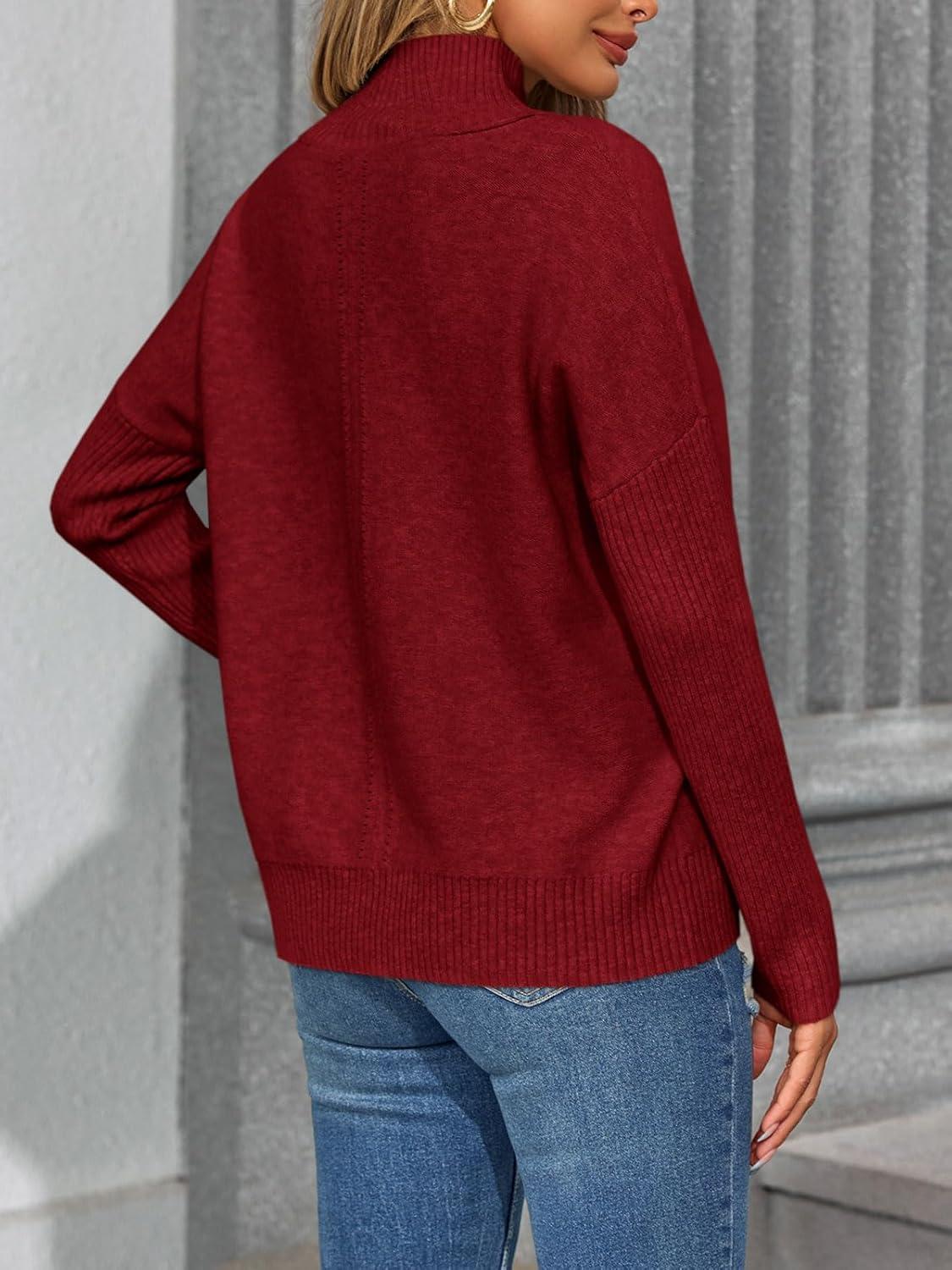 Saodimallsu Womens Mock Neck Sweater Tops Fall Long Sleeve Loose Casual Soft Knit Batwing Pullover Sweaters(Burgundy)