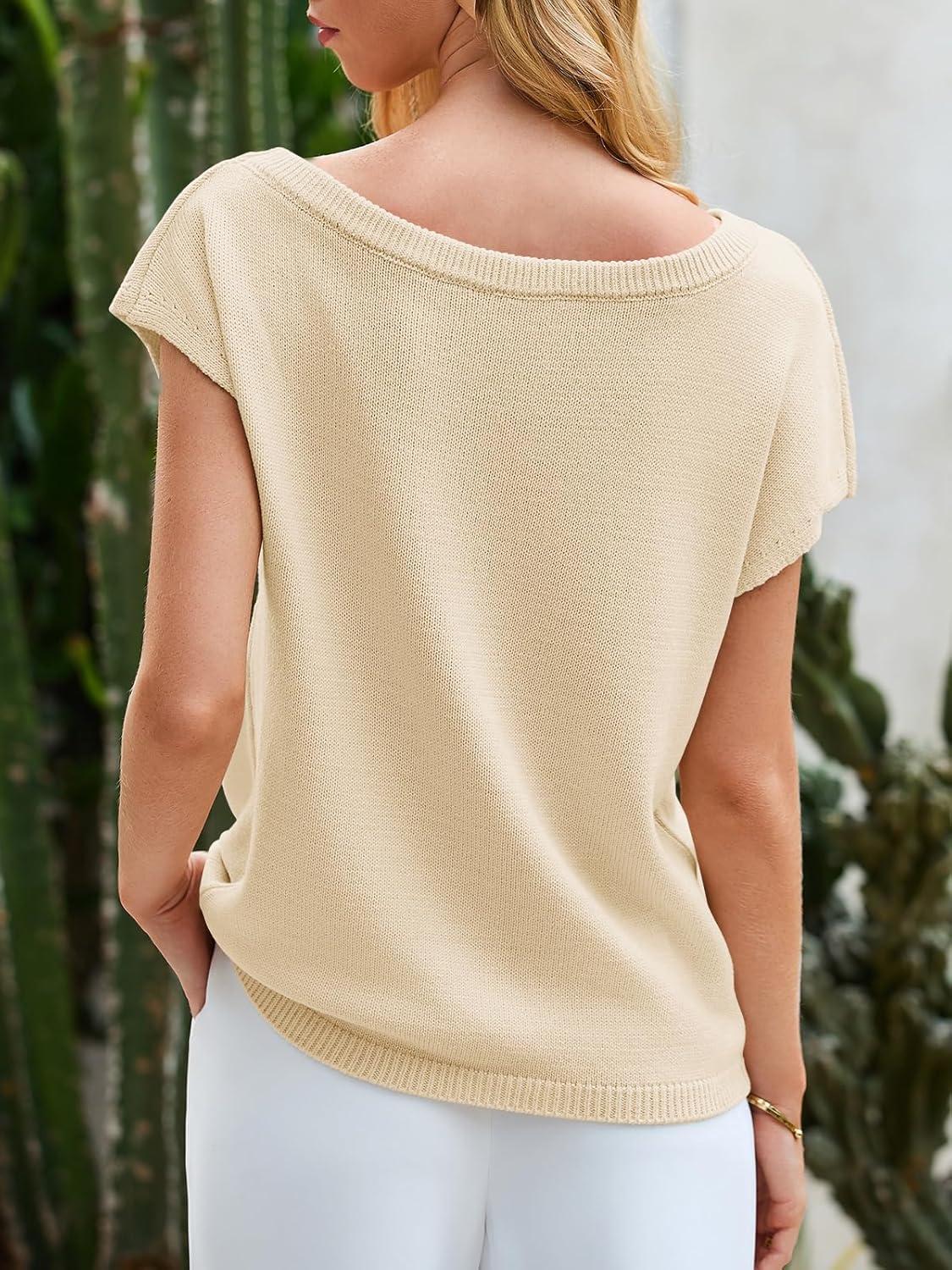 Saodimallsu Womens Off One Shoulder Sweater Tops Summer Short Sleeve Casual Loose Knit Trendy Going Out Tops(Beige)