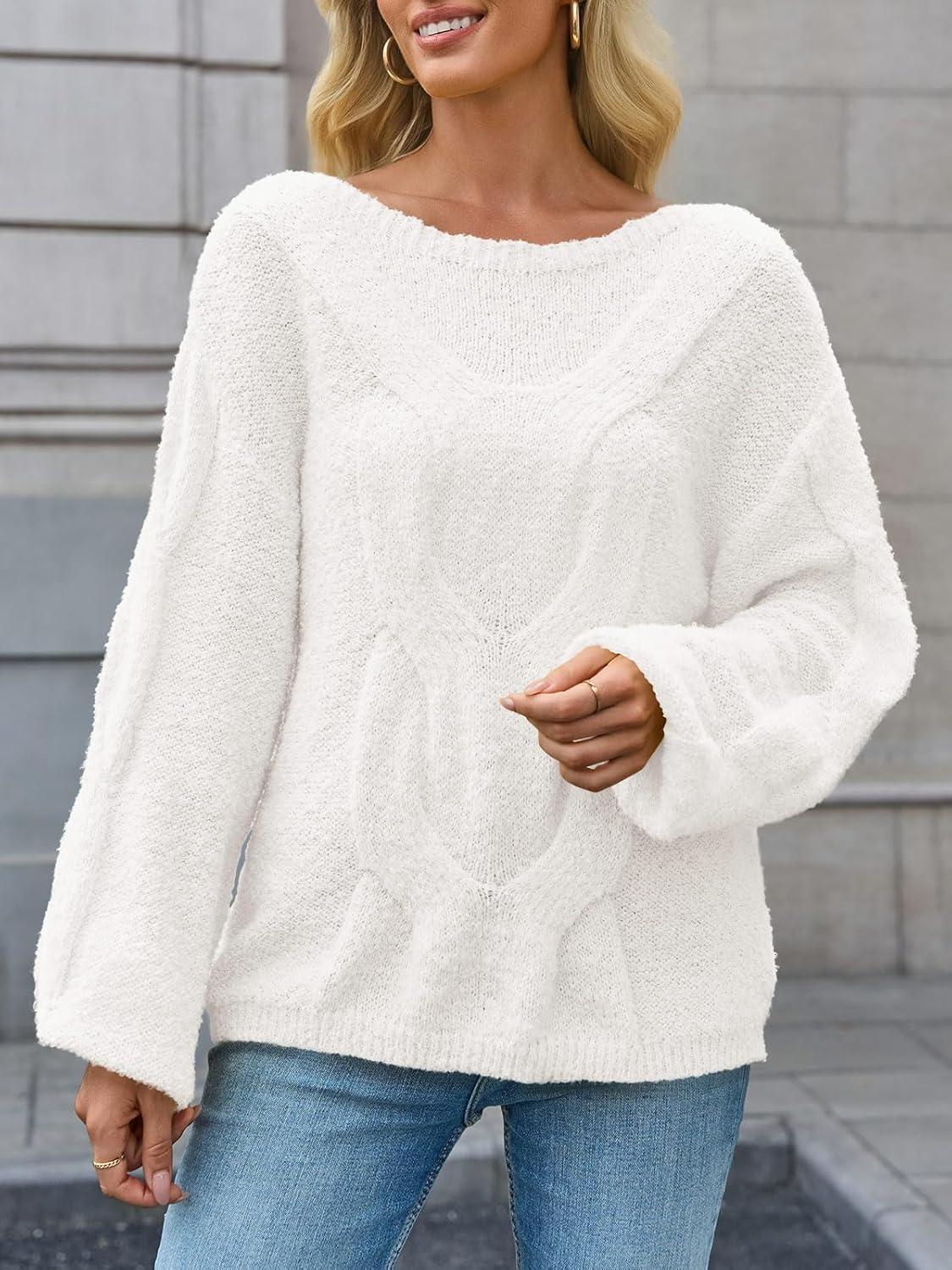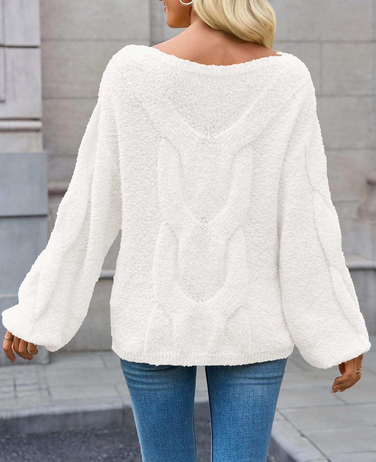 Saodimallsu Womens Off One Shoulder Sweaters Boat Neck Cable Knit Long Lantern Sleeve Loose Fall Trendy Pullover Tops(White)