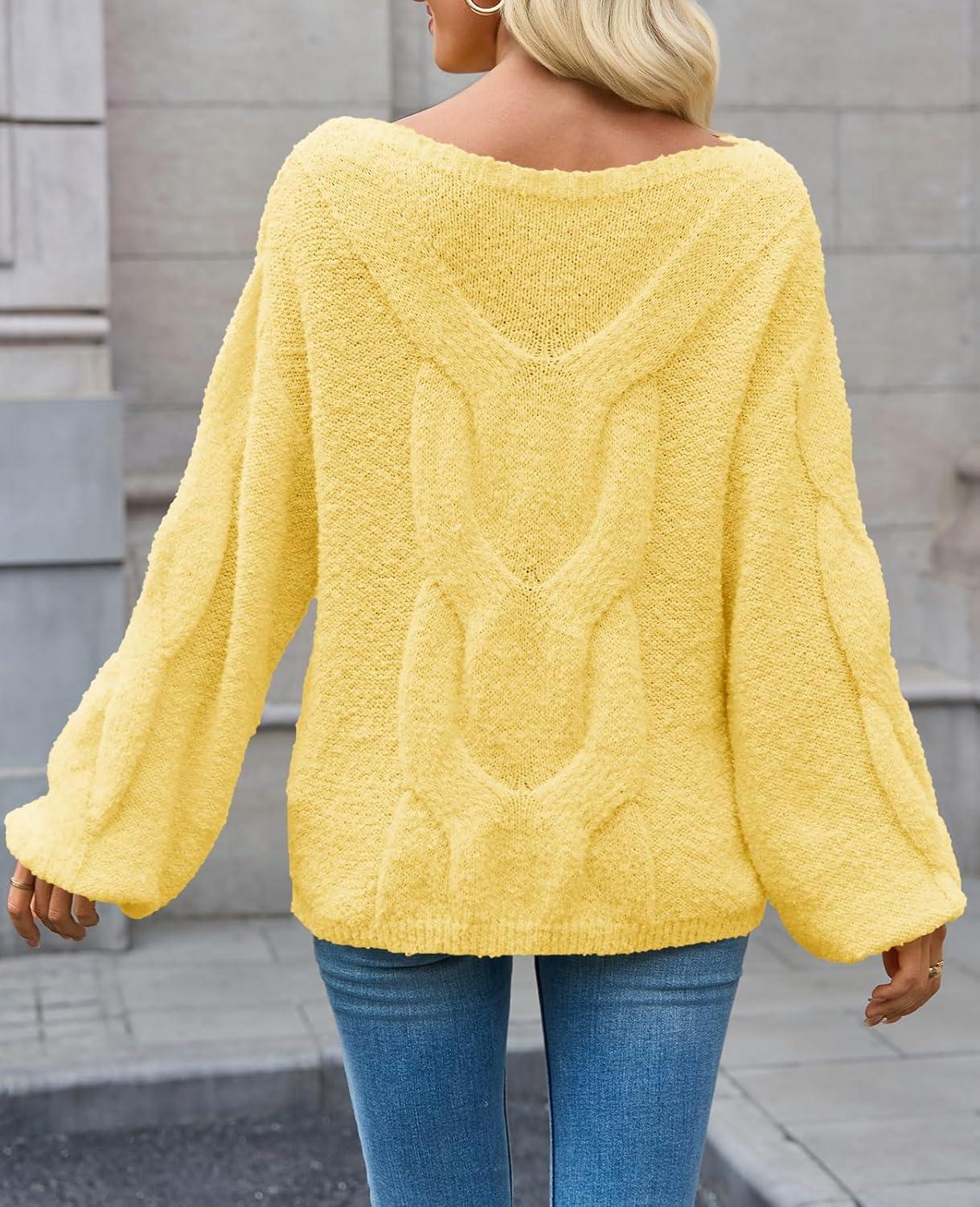 Saodimallsu Womens Off One Shoulder Sweaters Boat Neck Cable Knit Long Lantern Sleeve Loose Fall Trendy Pullover Tops(Yellow)