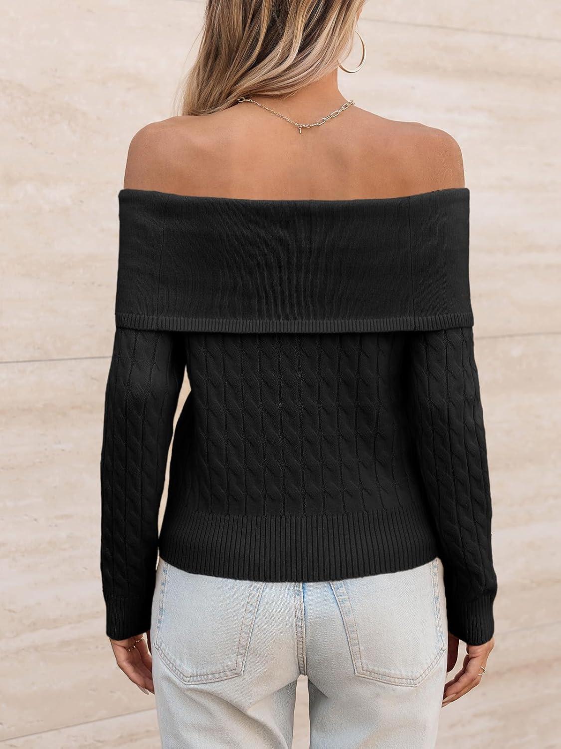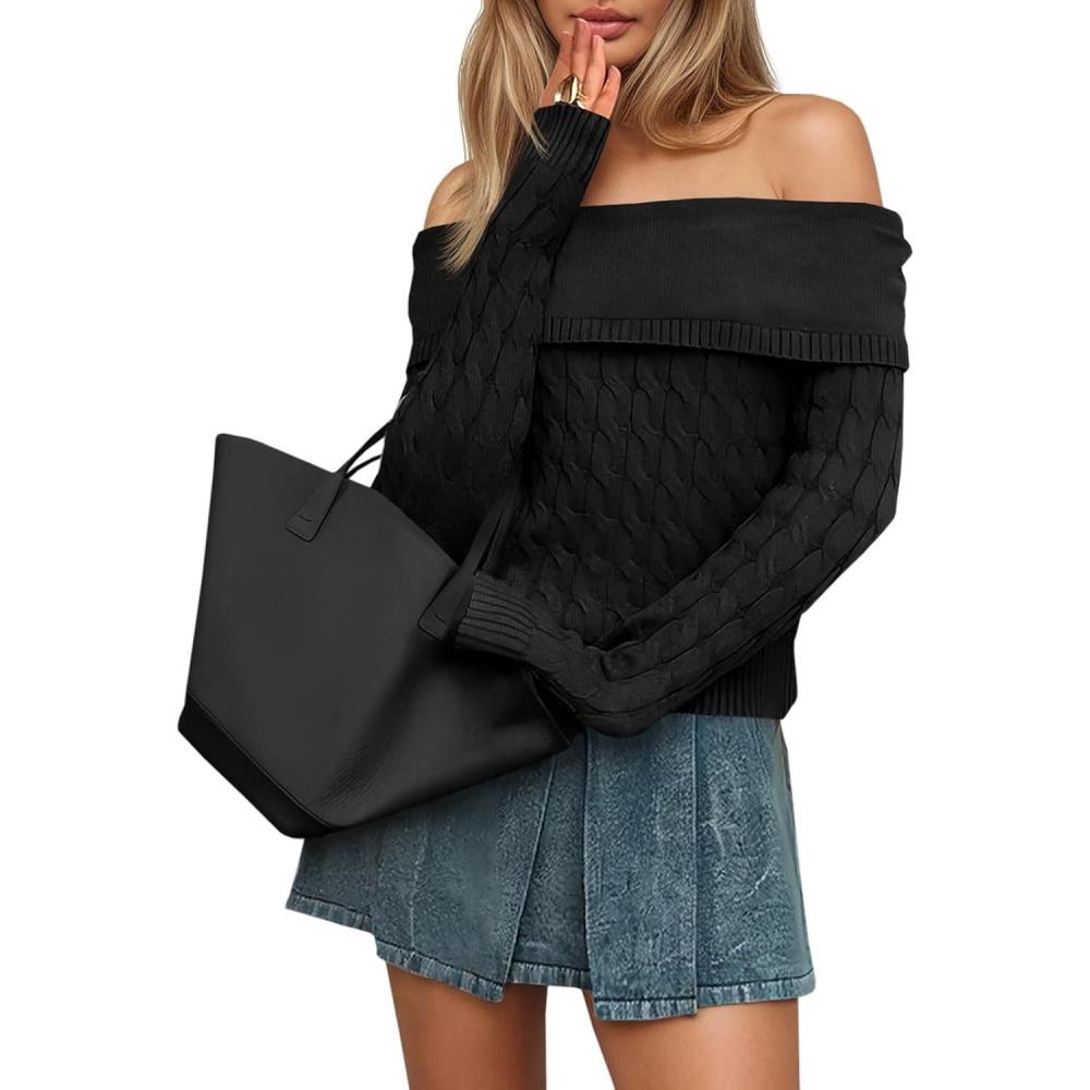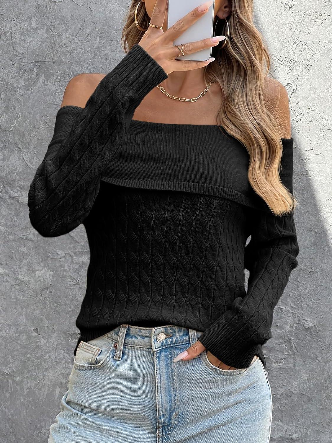 Saodimallsu Womens Off The Shoulder Sweaters Cable Knit Long Sleeve Sexy Fitted Fall Dressy Going Out Pullover Tops(Black)