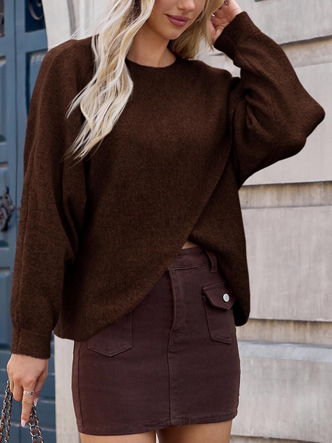 Saodimallsu Womens Oversized Batwing Sweaters Long Sleeve Crew Neck Poncho Slouchy Knit Asymmetrical Pullover Tops(Brown)