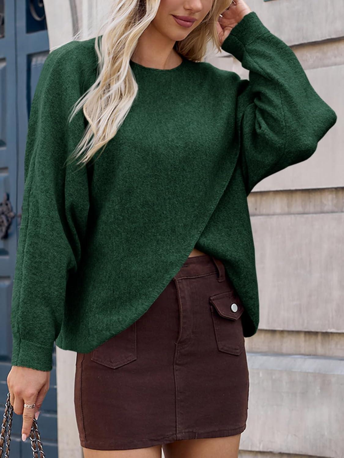 Saodimallsu Womens Oversized Batwing Sweaters Long Sleeve Crew Neck Poncho Slouchy Knit Asymmetrical Pullover Tops(Dark Green)