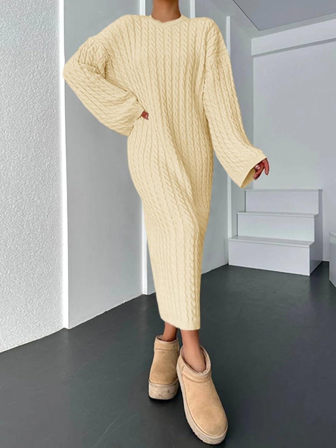 Saodimallsu Womens Oversized Cable Knit Sweater Dress Drop Shoulder Long Sleeve Loose Fall Midi Pullover Sweater Dresses(Beige)