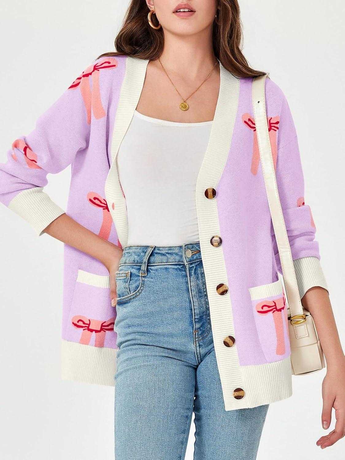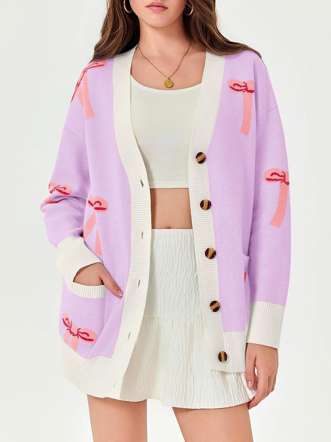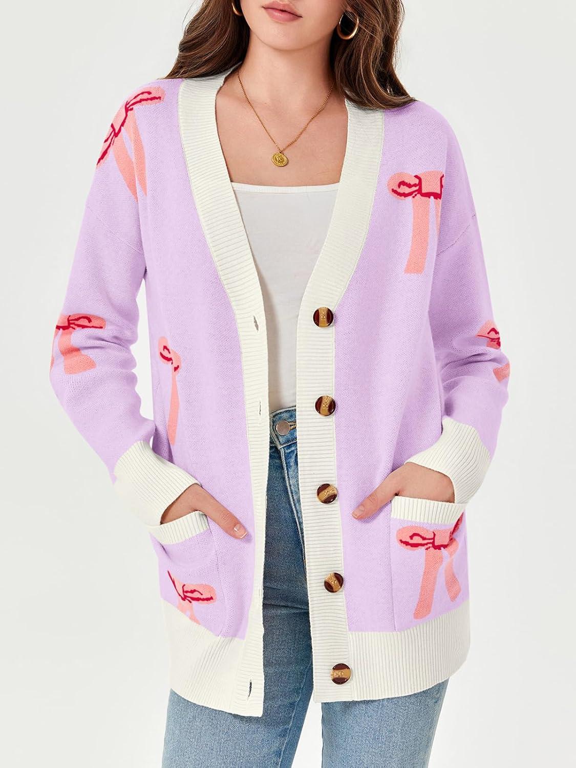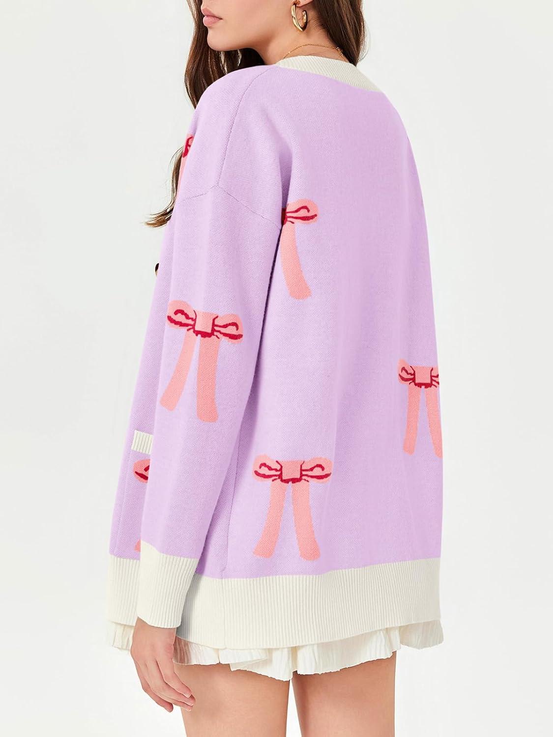 Saodimallsu Womens Oversized Cardigan Sweaters Bow Printed Button V Neck Long Sleeve Loose Knit Fall Trendy Coats(Light Purple)