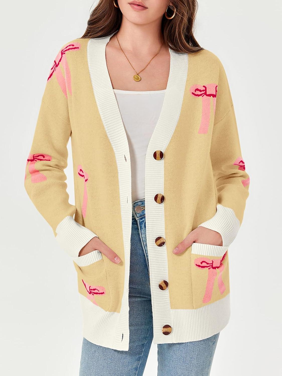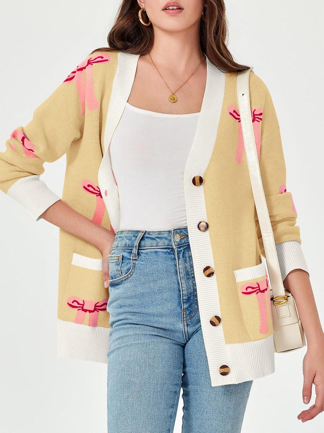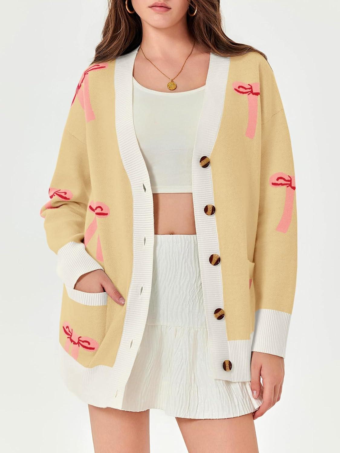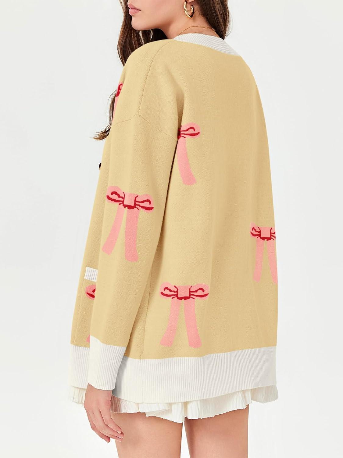 Saodimallsu Womens Oversized Cardigan Sweaters Bow Printed Button V Neck Long Sleeve Loose Knit Fall Trendy Coats(Yellow)