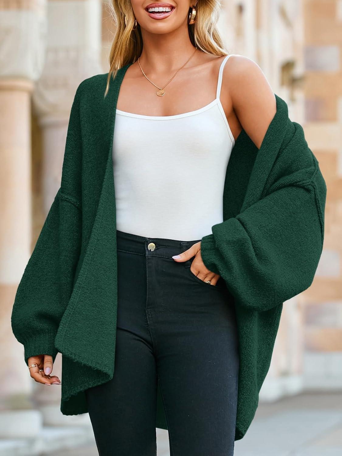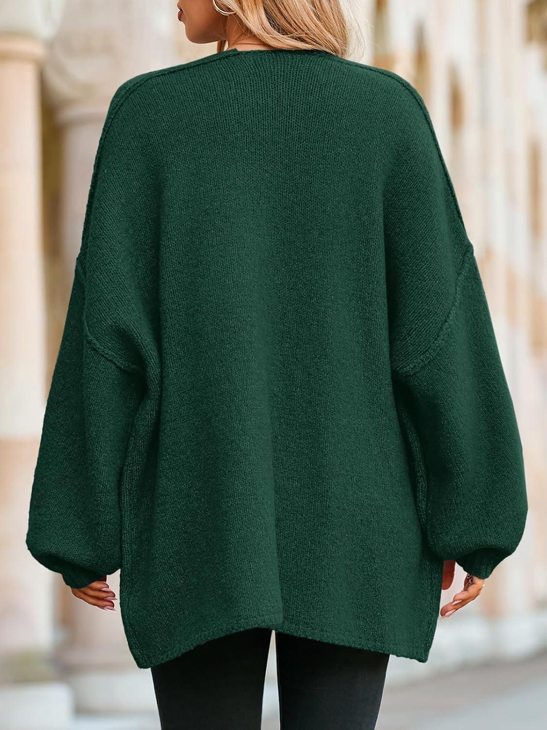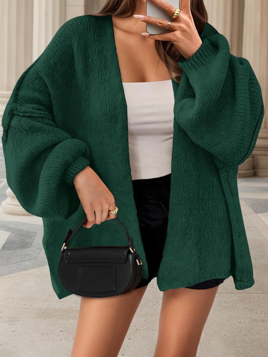 Saodimallsu Womens Oversized Cardigan Sweaters Open Front Chunky Knit Casual Long Lantern Sleeve Fall Sweater Coats(Dark Green)