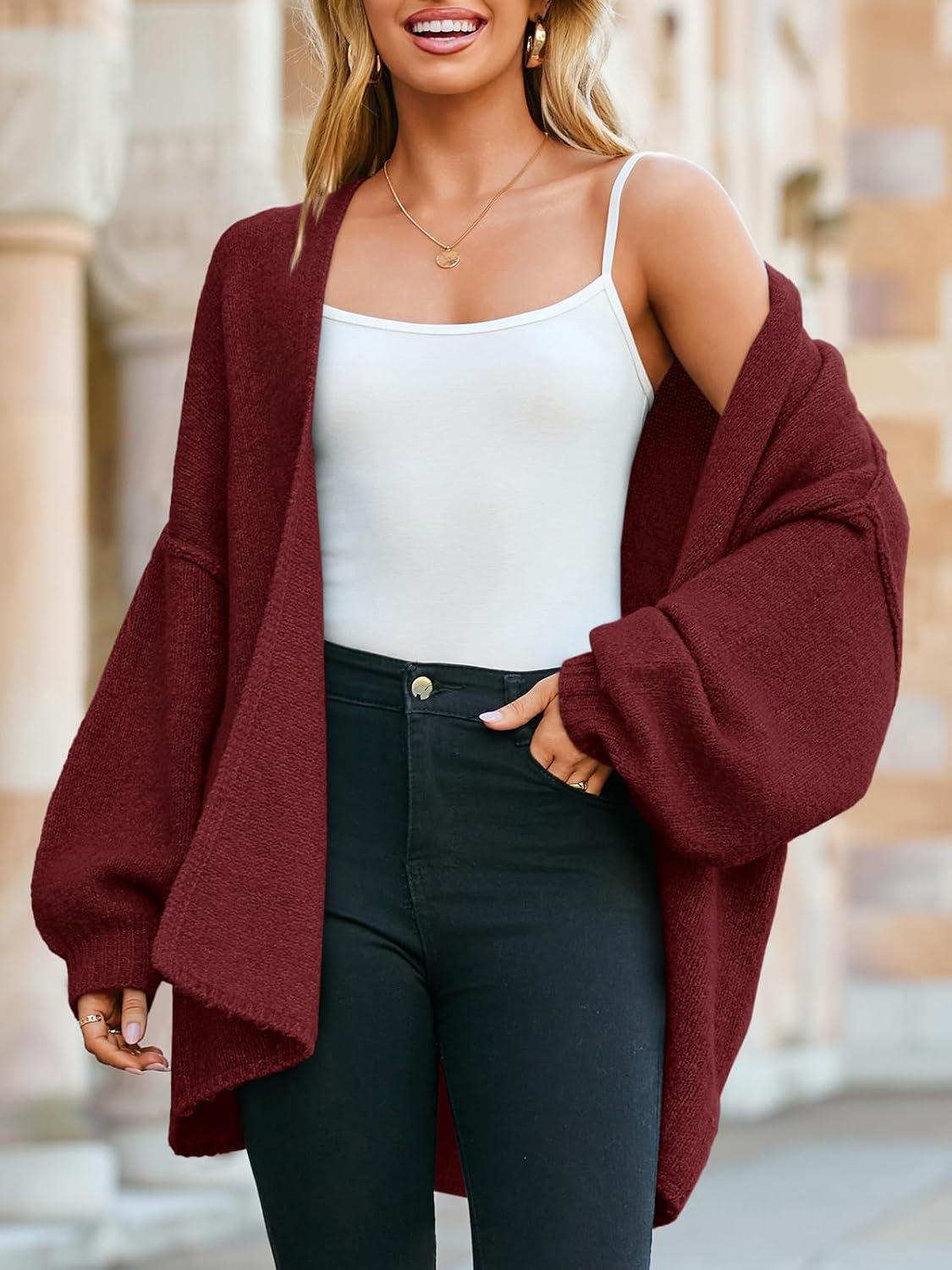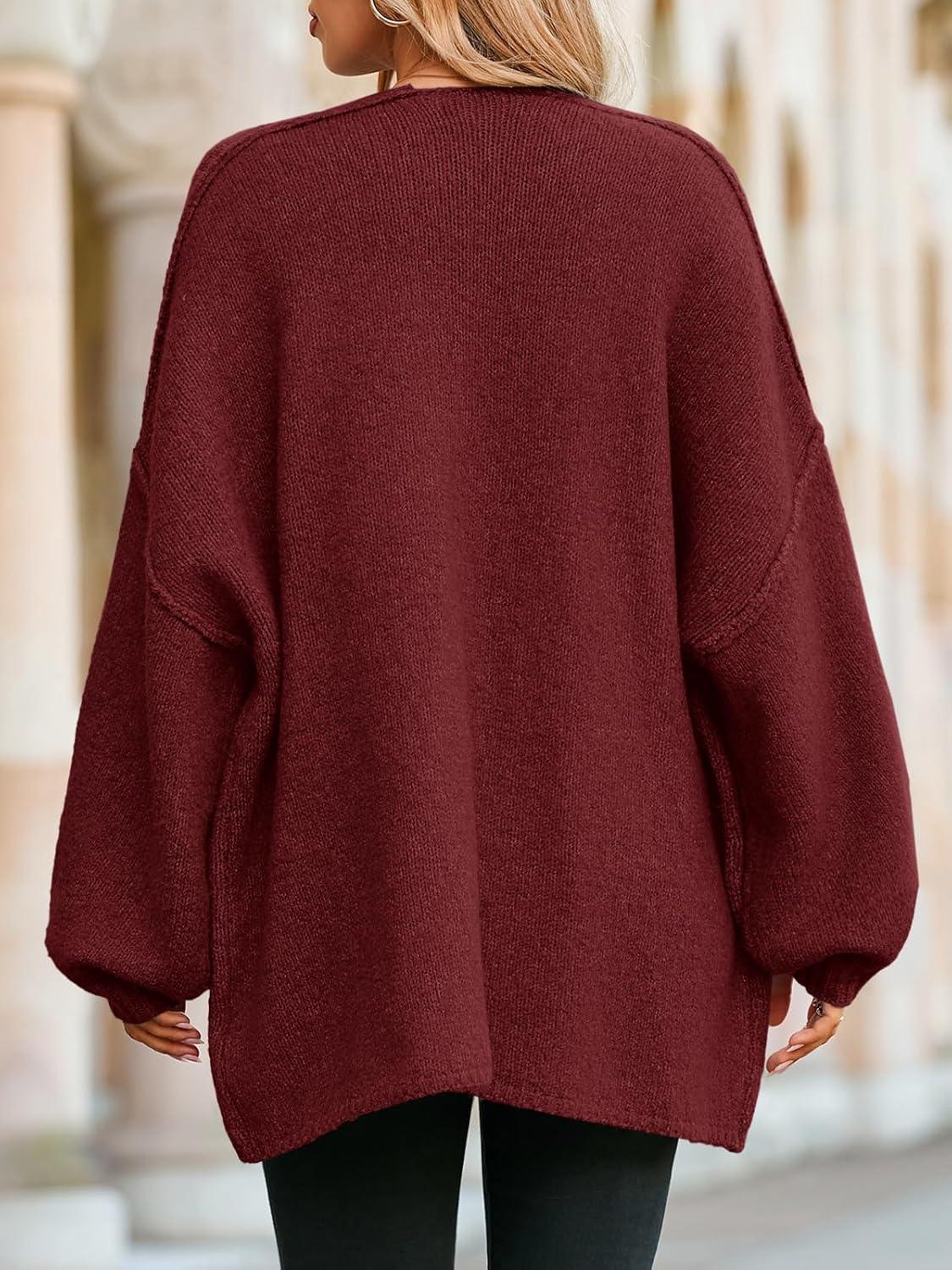 Saodimallsu Womens Oversized Cardigan Sweaters Open Front Chunky Knit Casual Long Lantern Sleeve Fall Sweater Coats(Wine Red)