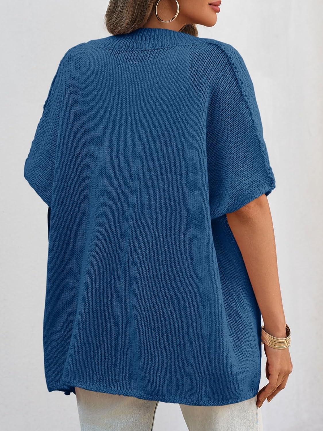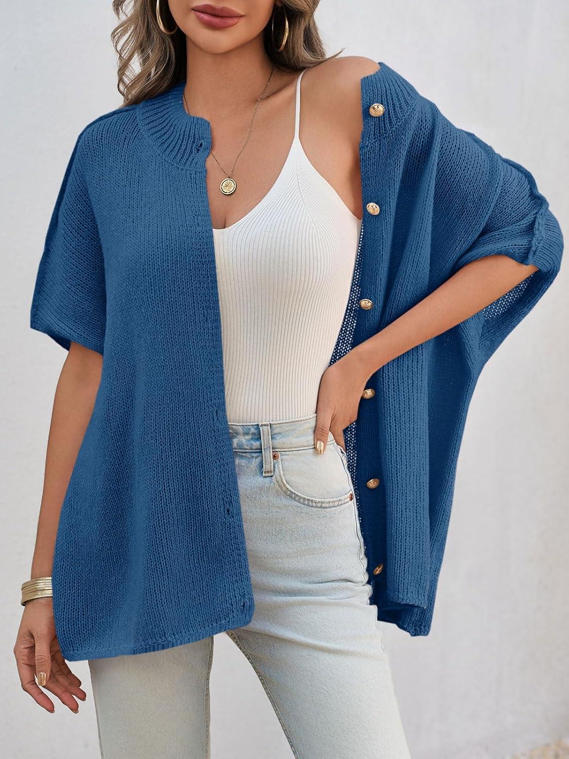 Saodimallsu Womens Oversized Cardigan Sweaters Short Sleeve Button Down Casual Lightweight Loose Knit Trendy Cardigans(Navy Blue)