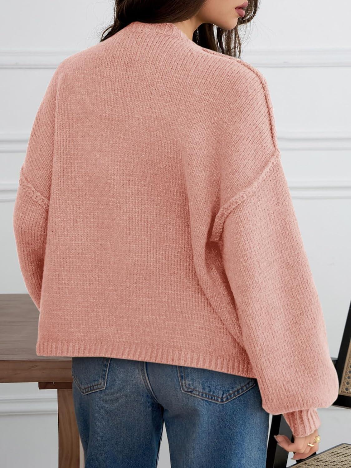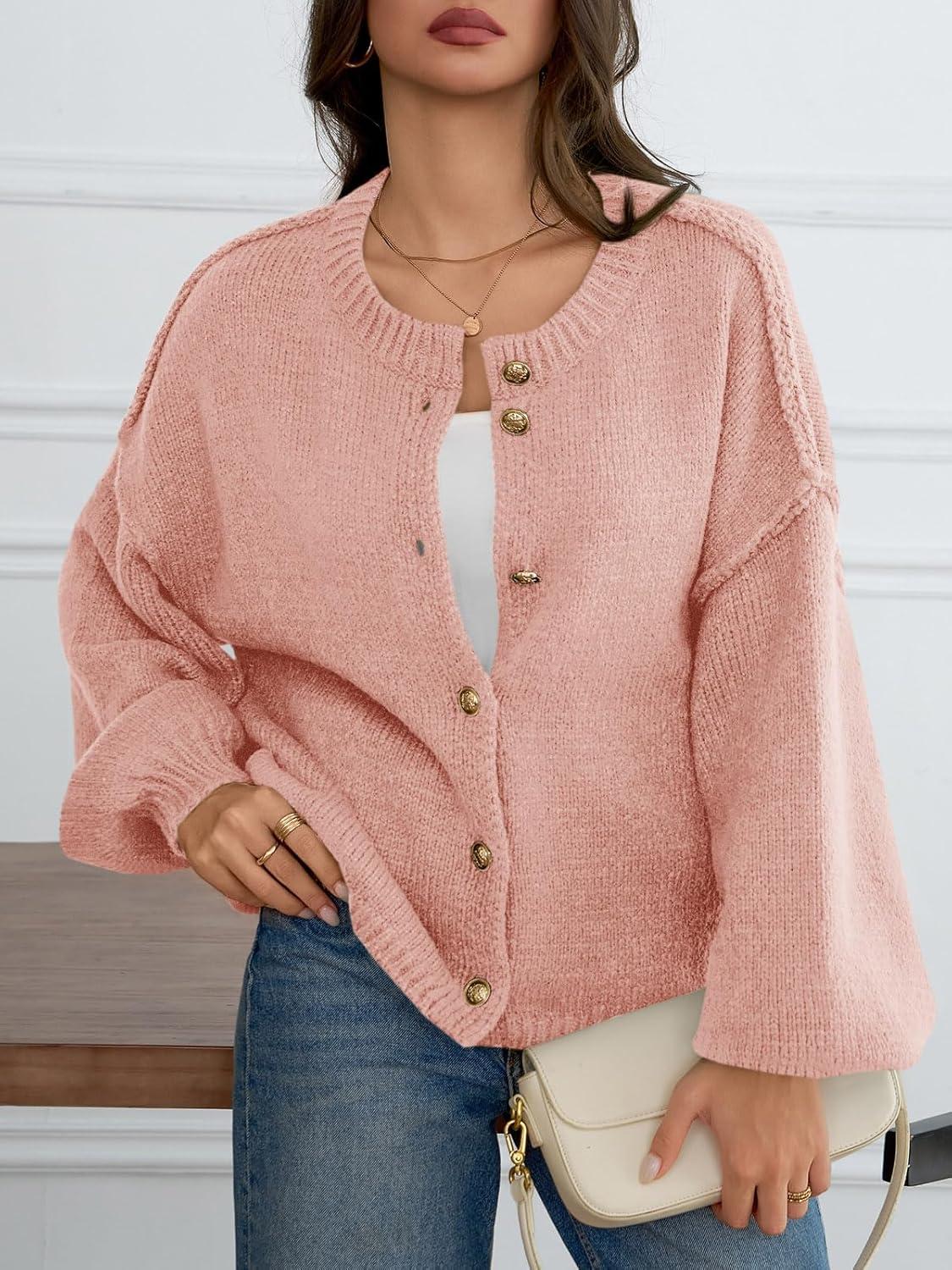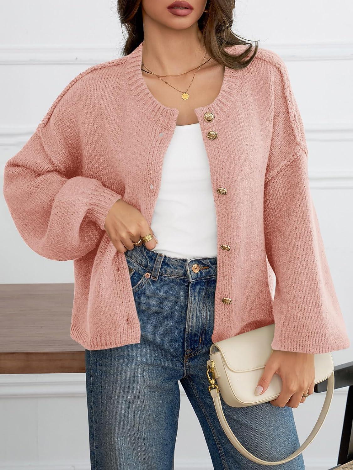 Saodimallsu Womens Oversized Cardigans Button Up Long Lantern Sleeve Chunky Knit Casual Soft Fall Sweater Coats(Pink)