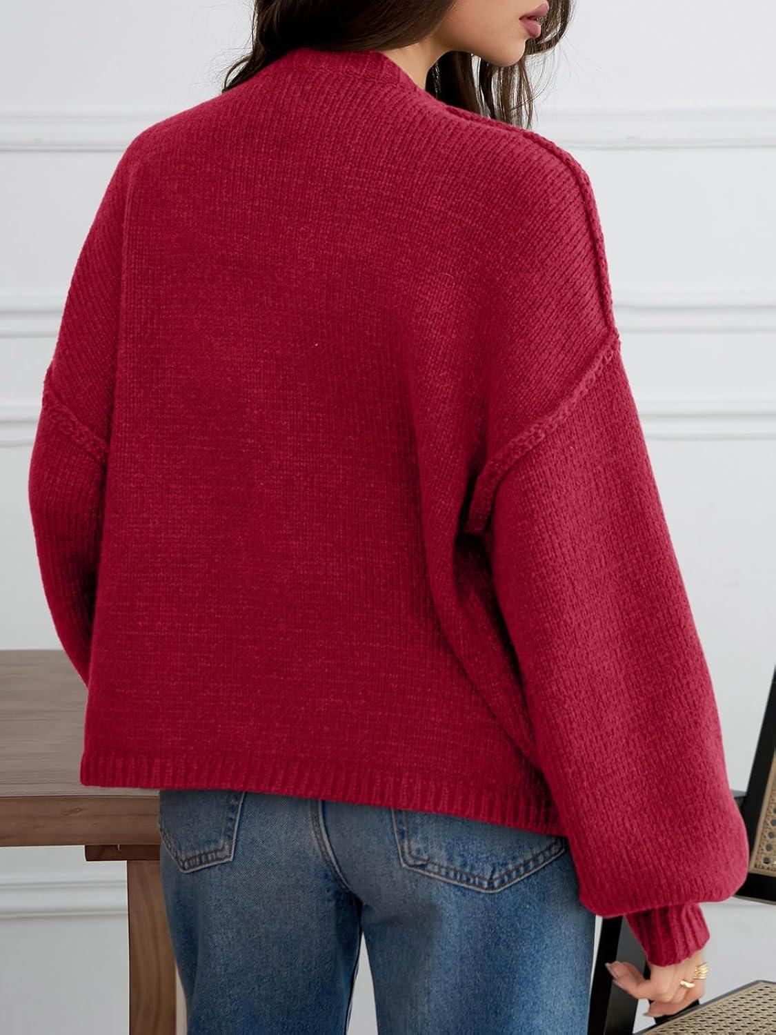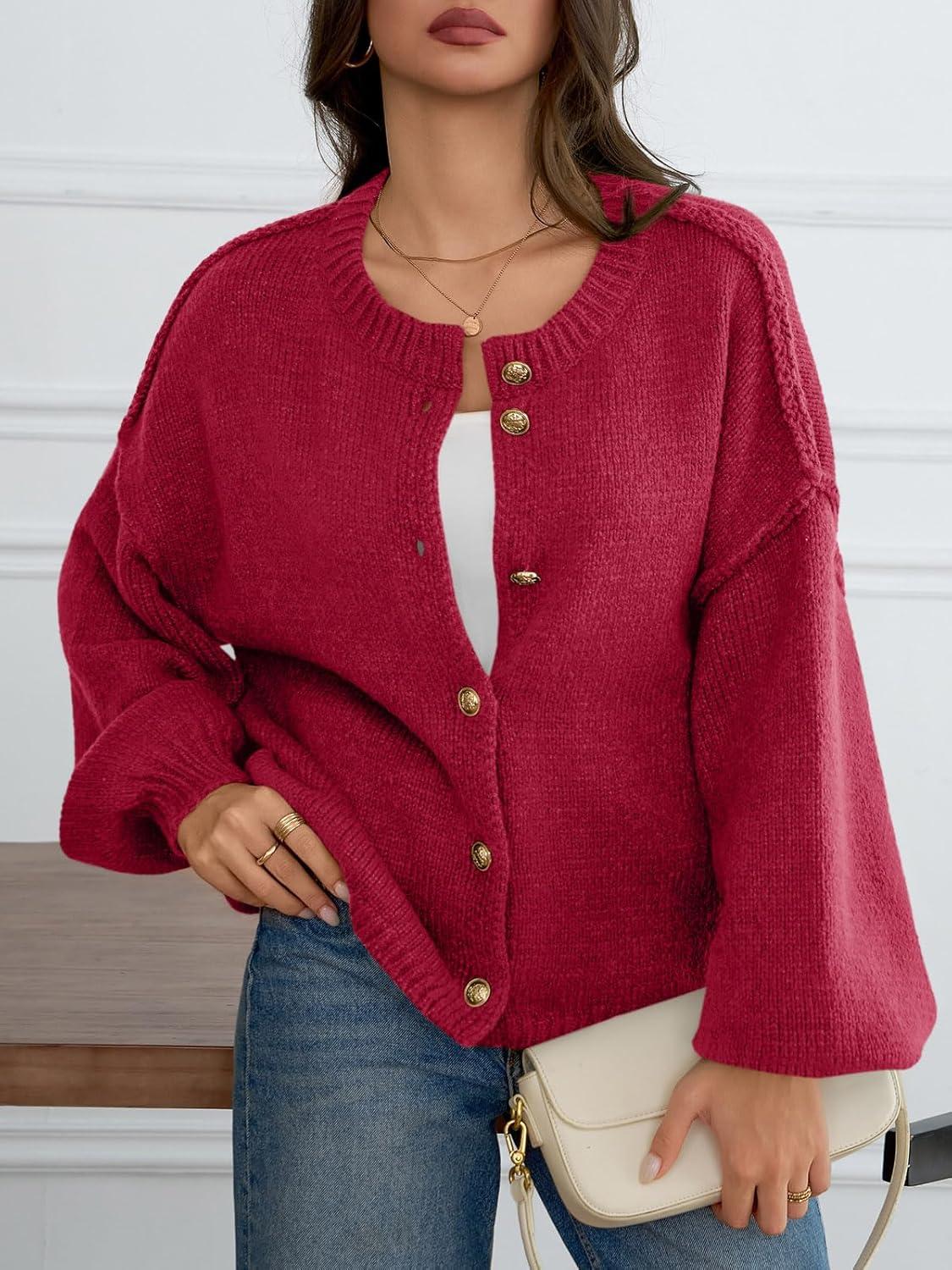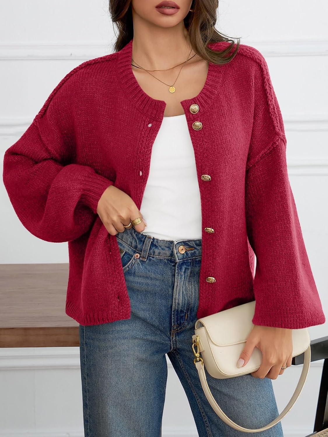 Saodimallsu Womens Oversized Cardigans Button Up Long Lantern Sleeve Chunky Knit Casual Soft Fall Sweater Coats(Wine Red)