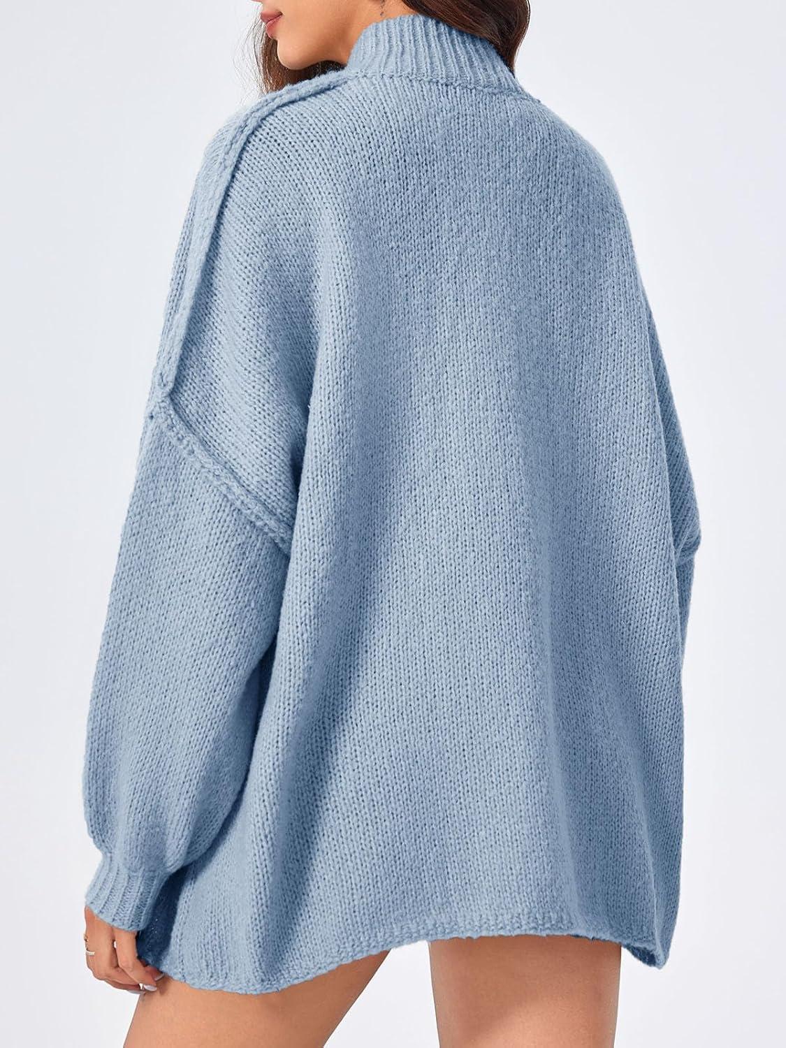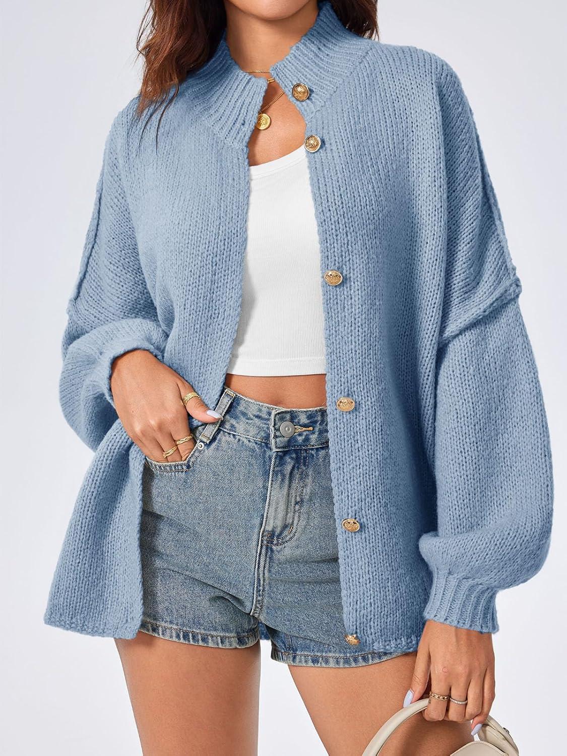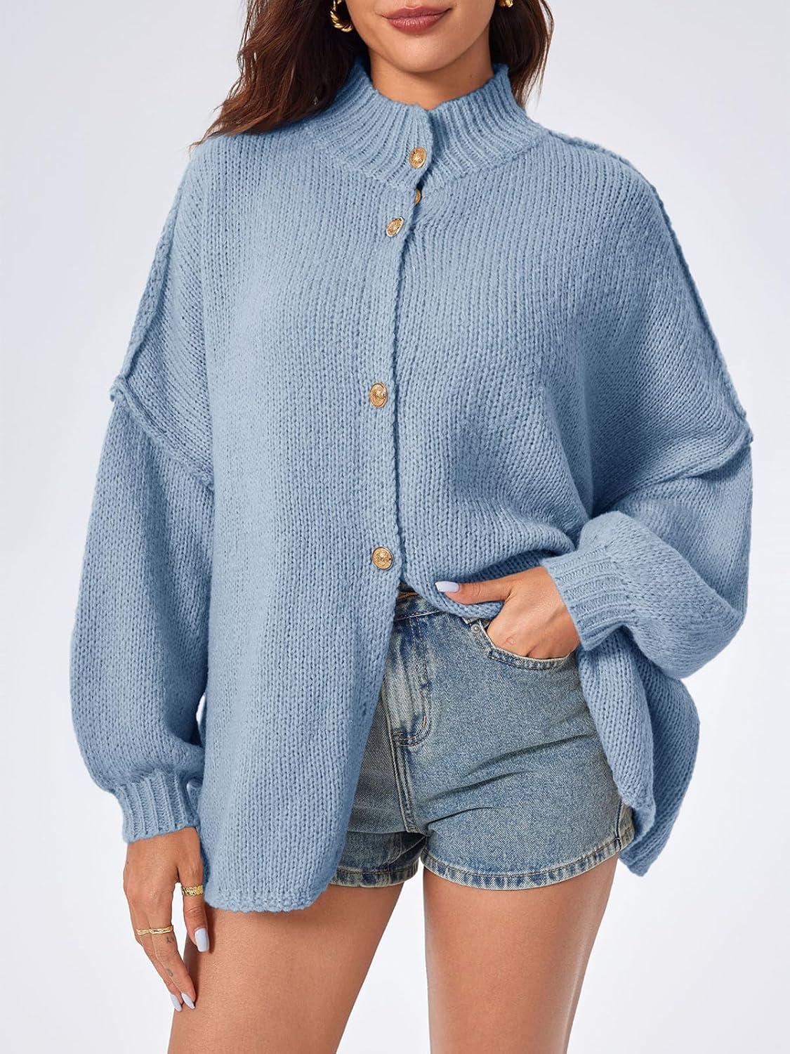 Saodimallsu Womens Oversized Cardigans Long Lantern Sleeve Button Down Chunky Knit Loose Fall Sweater Coats(Blue)