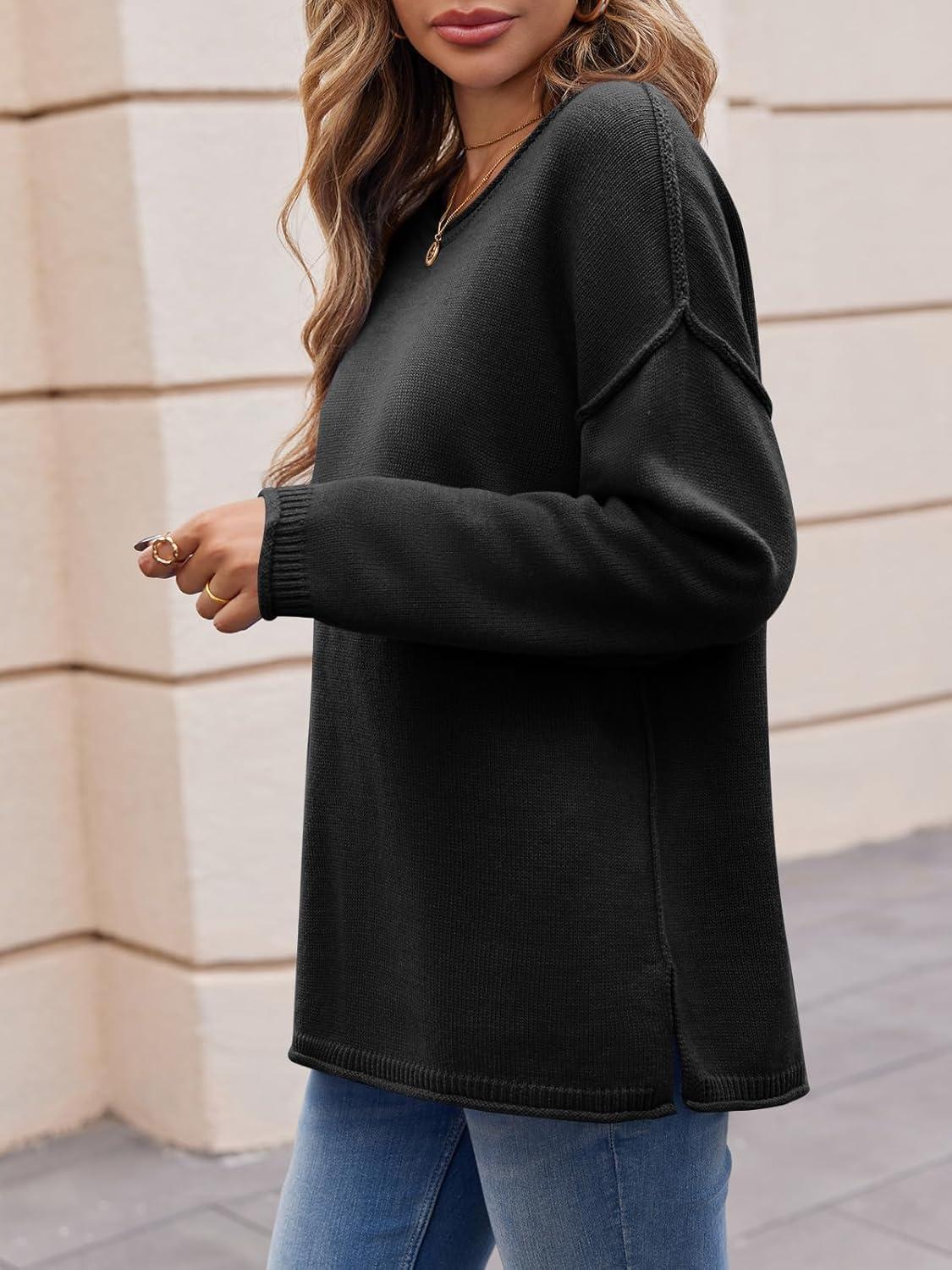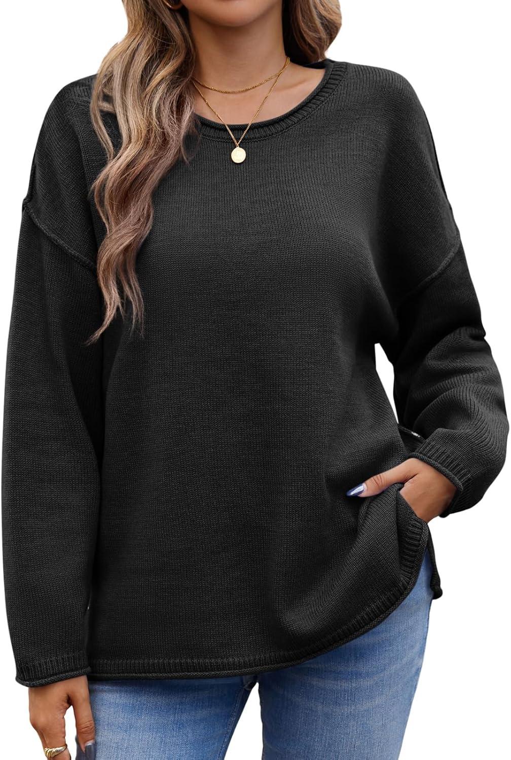 Saodimallsu Womens Oversized Crew Neck Sweaters Long Sleeve Slouchy Knit Fall Casual Loose Side Split Pullover Tops(Black)