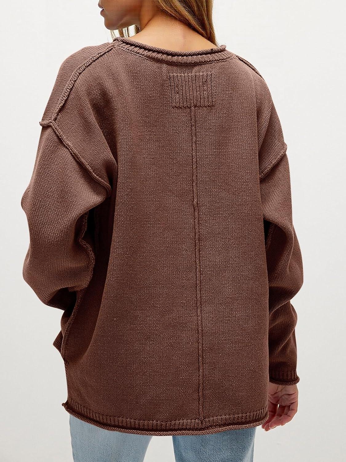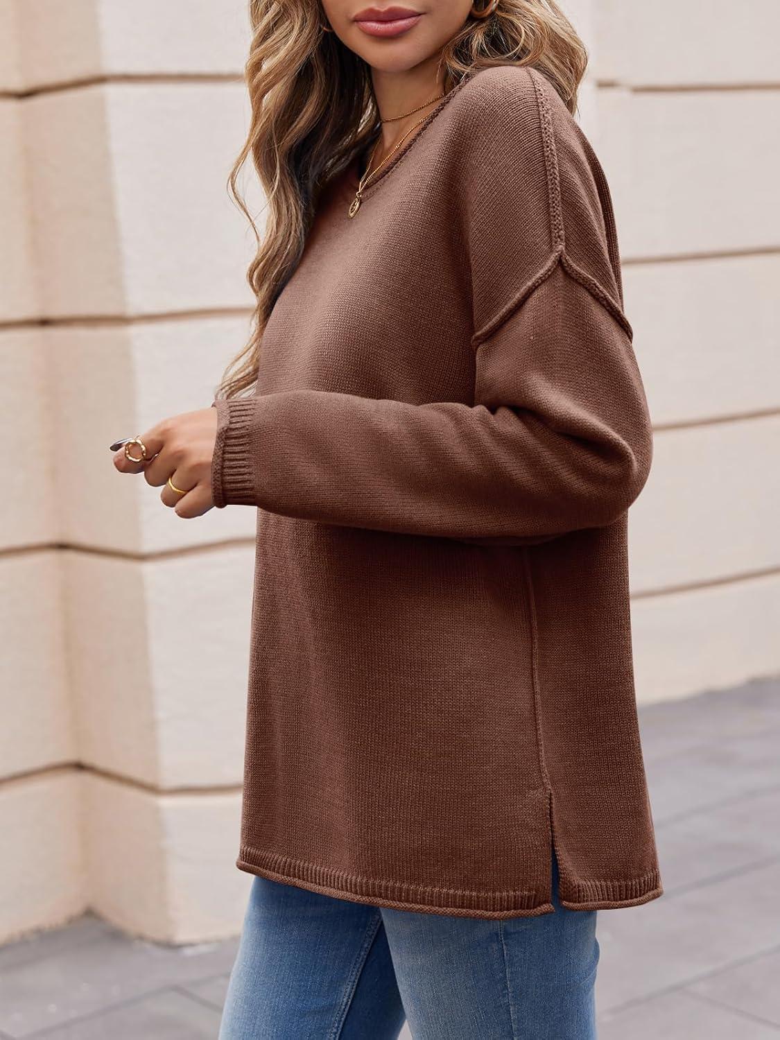Saodimallsu Womens Oversized Crew Neck Sweaters Long Sleeve Slouchy Knit Fall Casual Loose Side Split Pullover Tops(Brown)