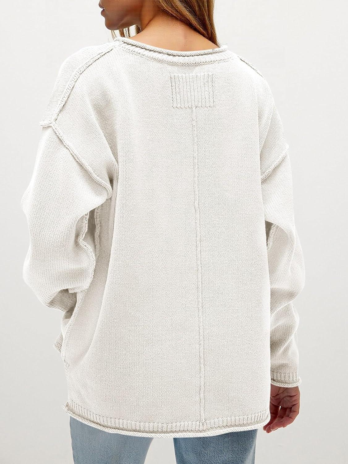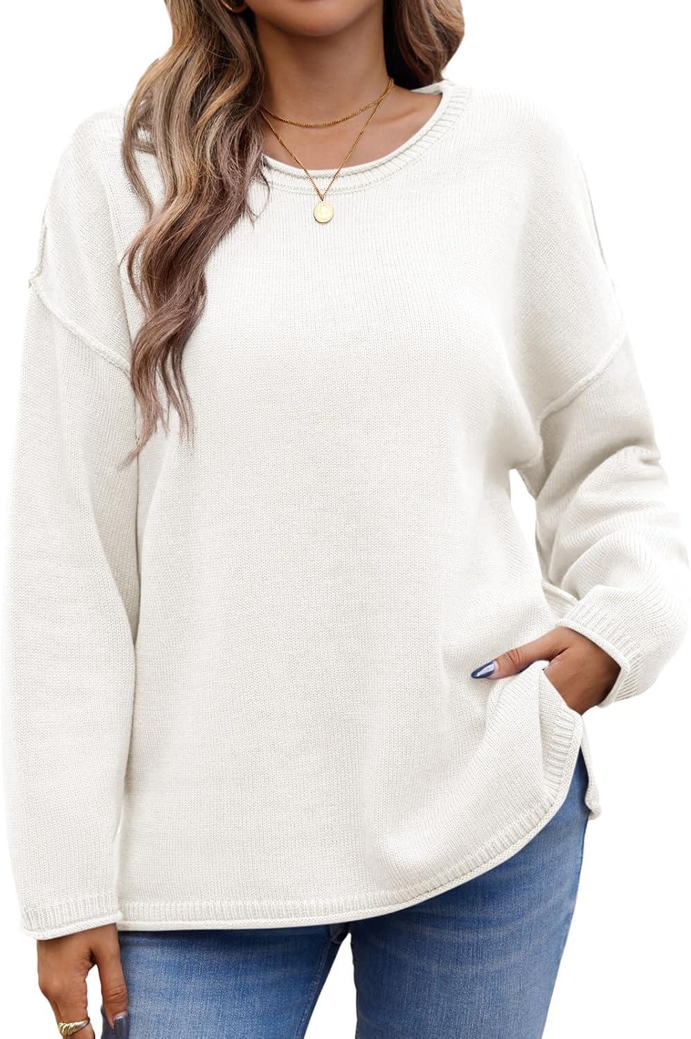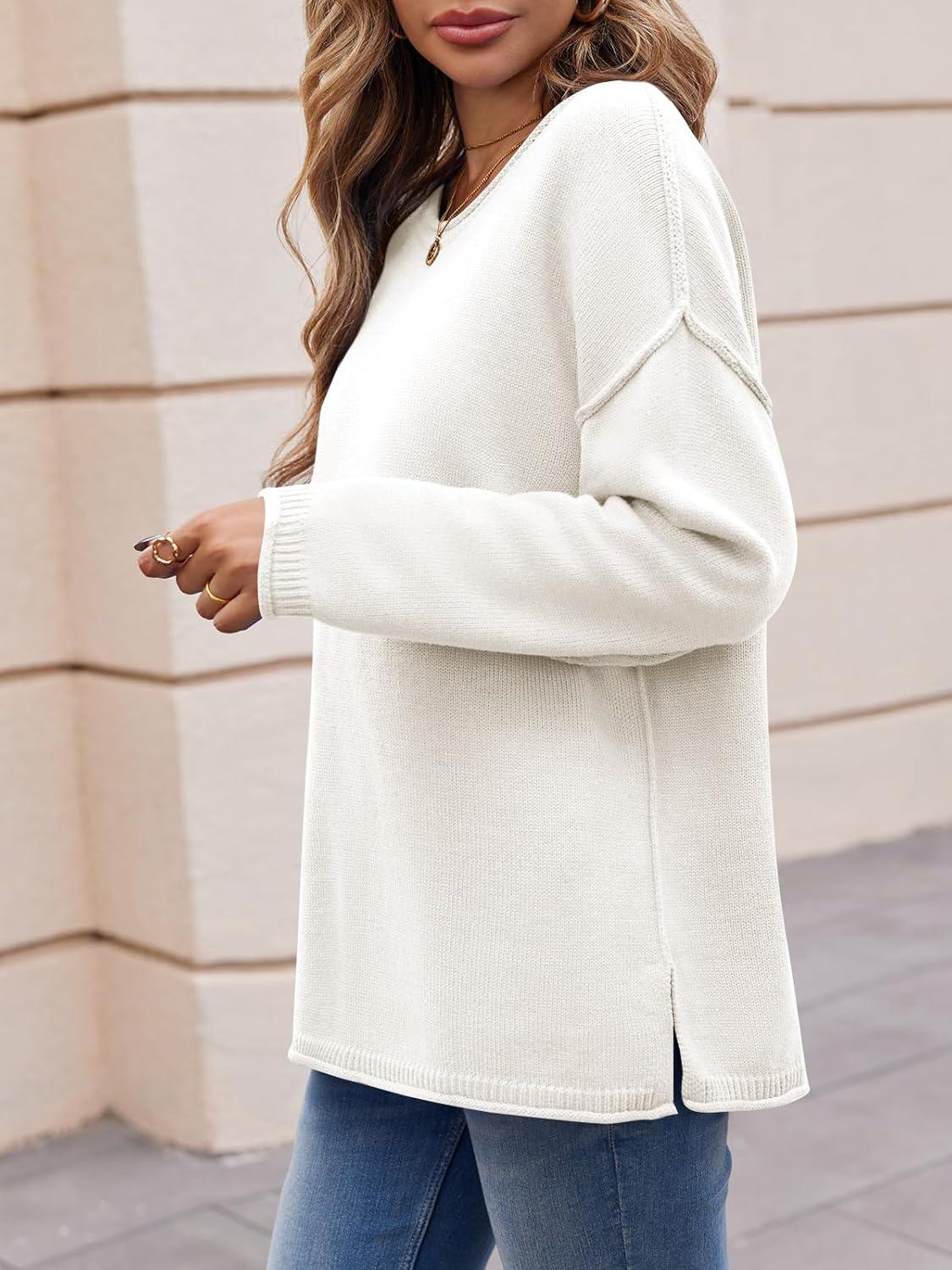 Saodimallsu Womens Oversized Crew Neck Sweaters Long Sleeve Slouchy Knit Fall Casual Loose Side Split Pullover Tops(White)