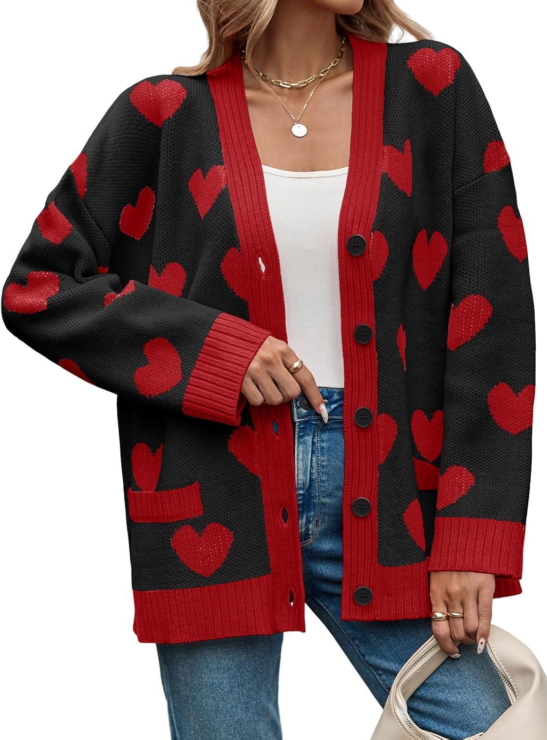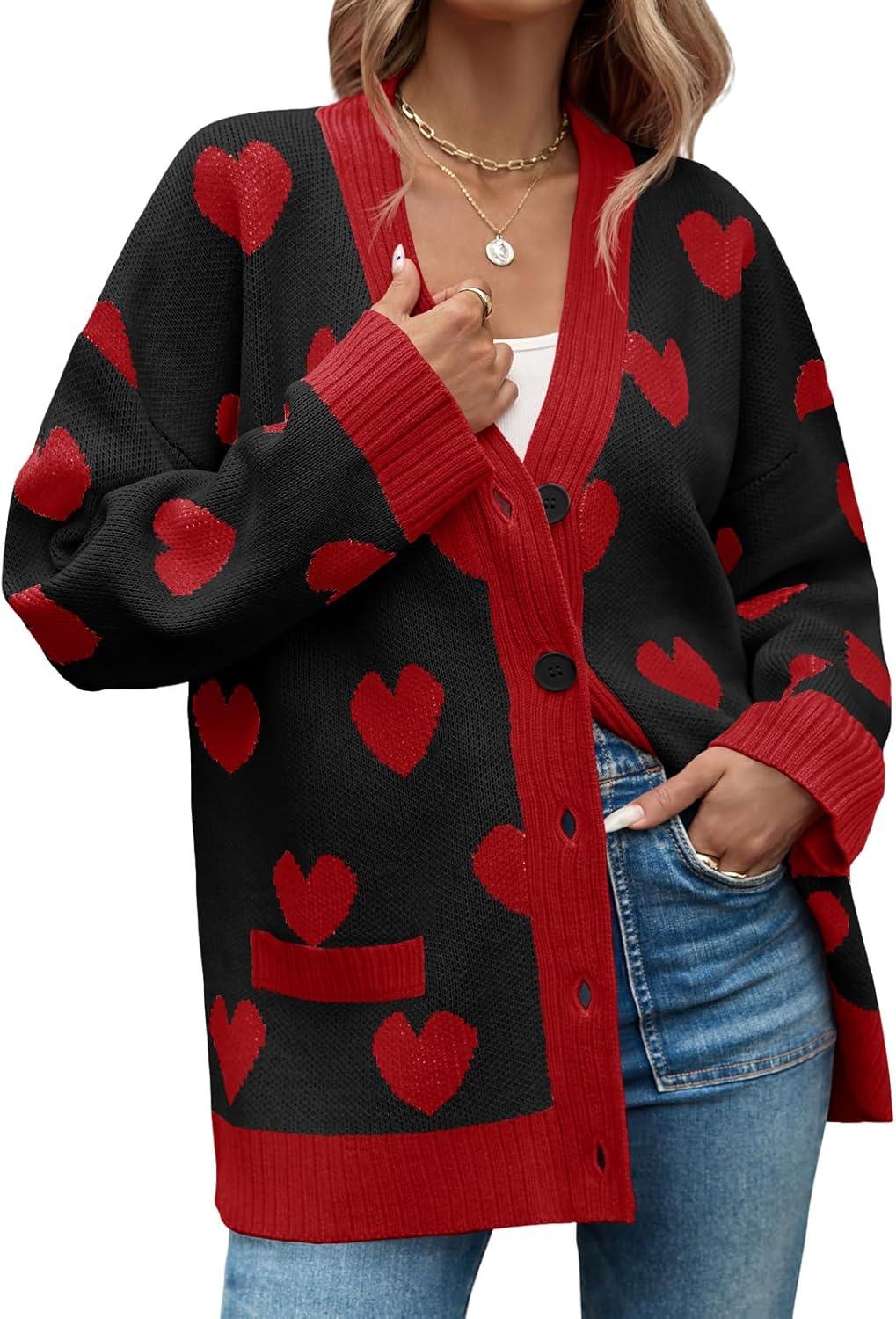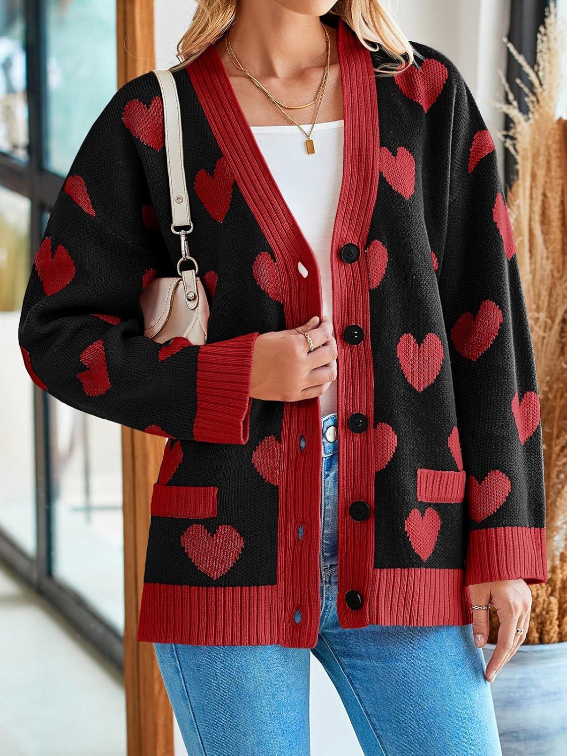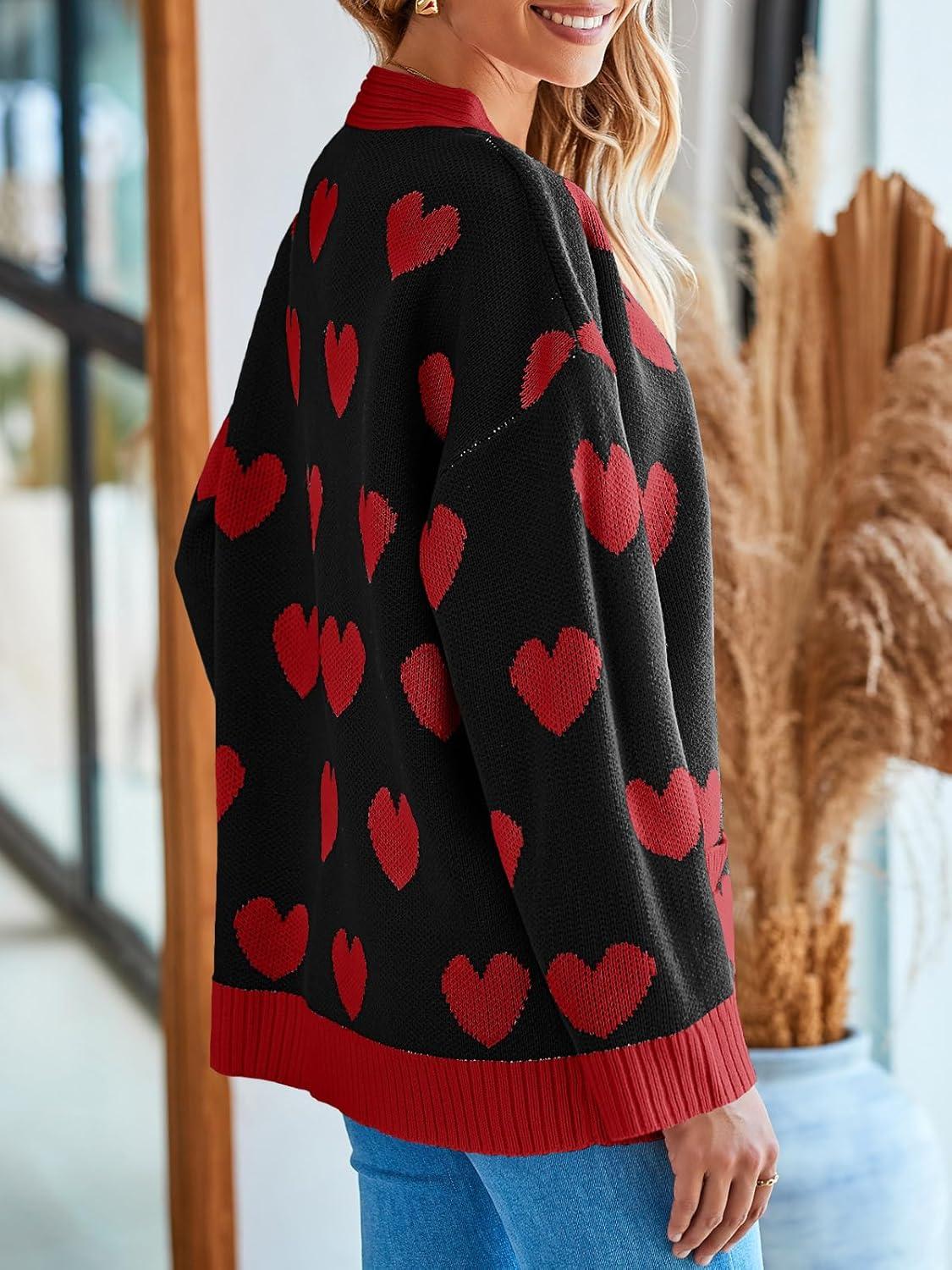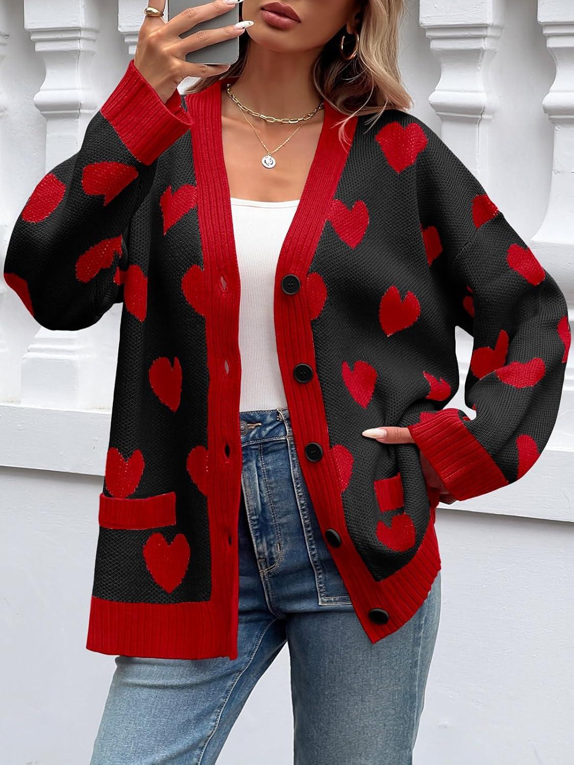 Saodimallsu Womens Oversized Heart Cardigan Color Block V Neck Button Long Sleeve Chunky Valentines Sweaters(Black)