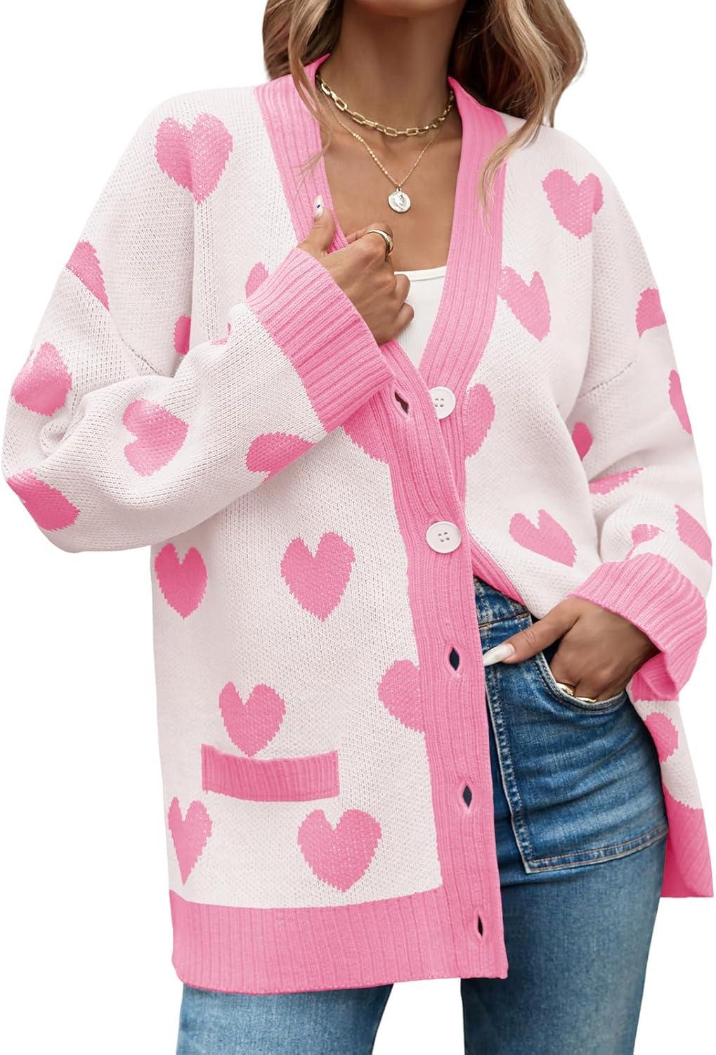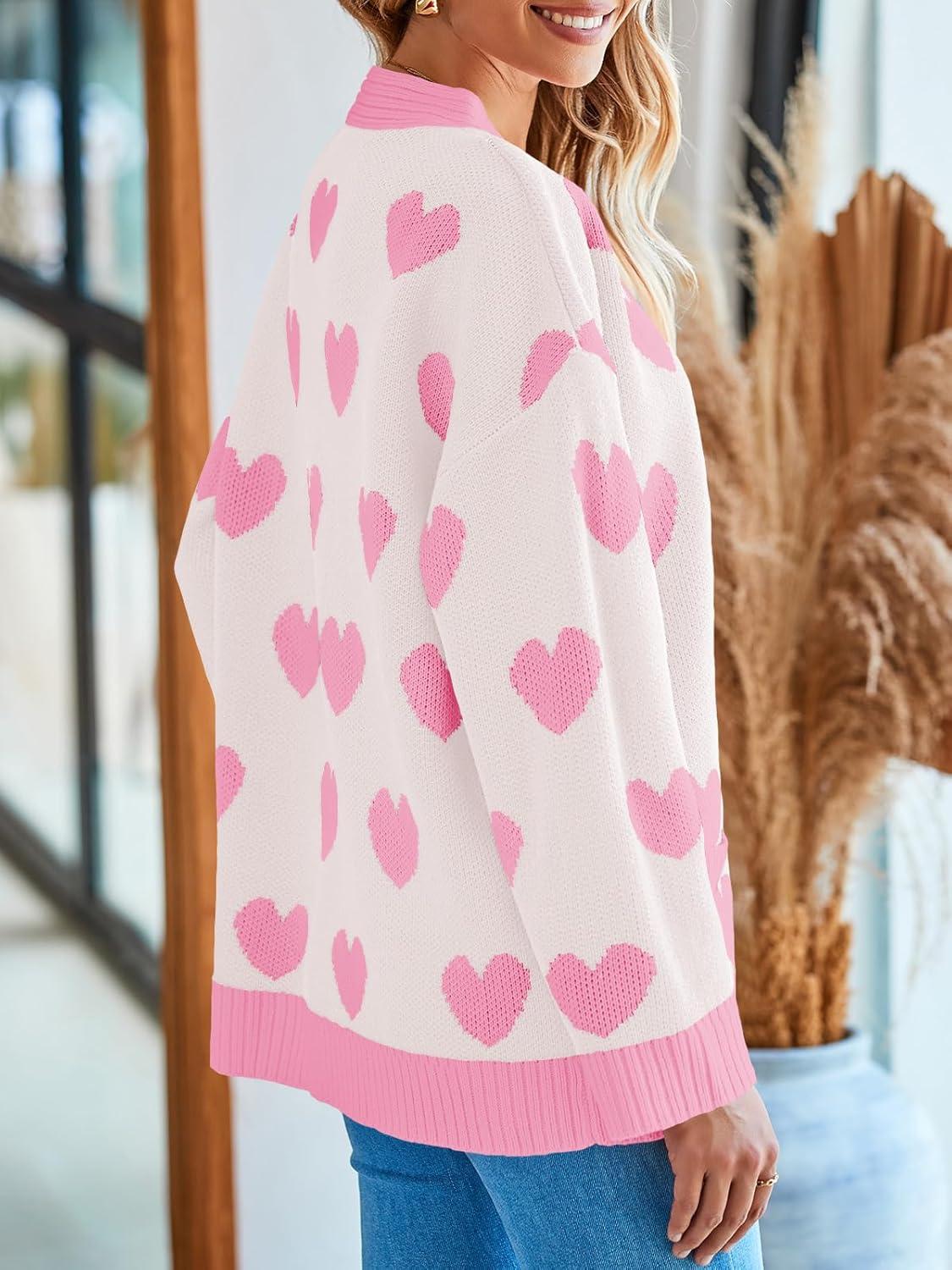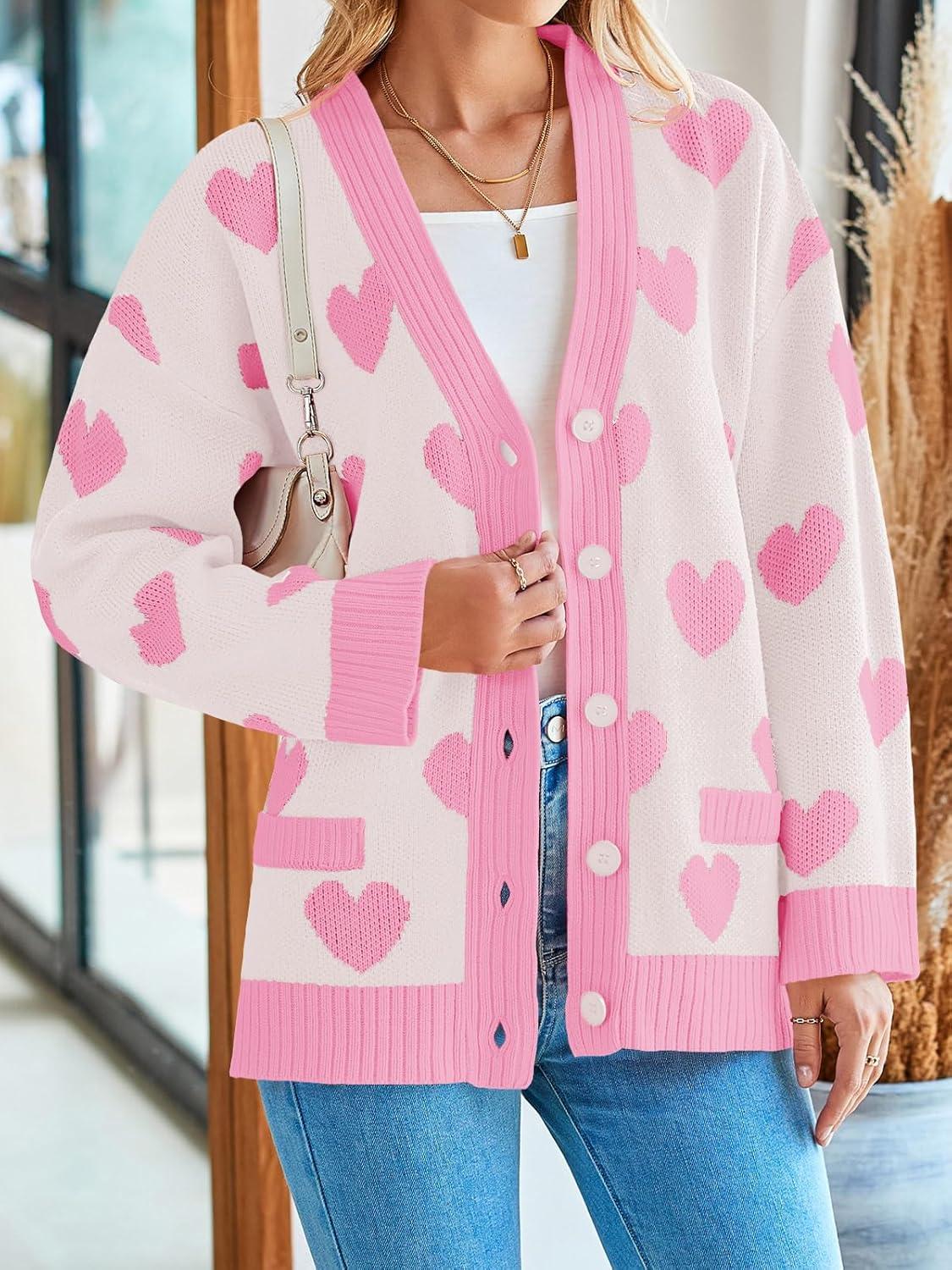 Saodimallsu Womens Oversized Heart Cardigan Color Block V Neck Button Long Sleeve Chunky Valentines Sweaters(Light Pink)
