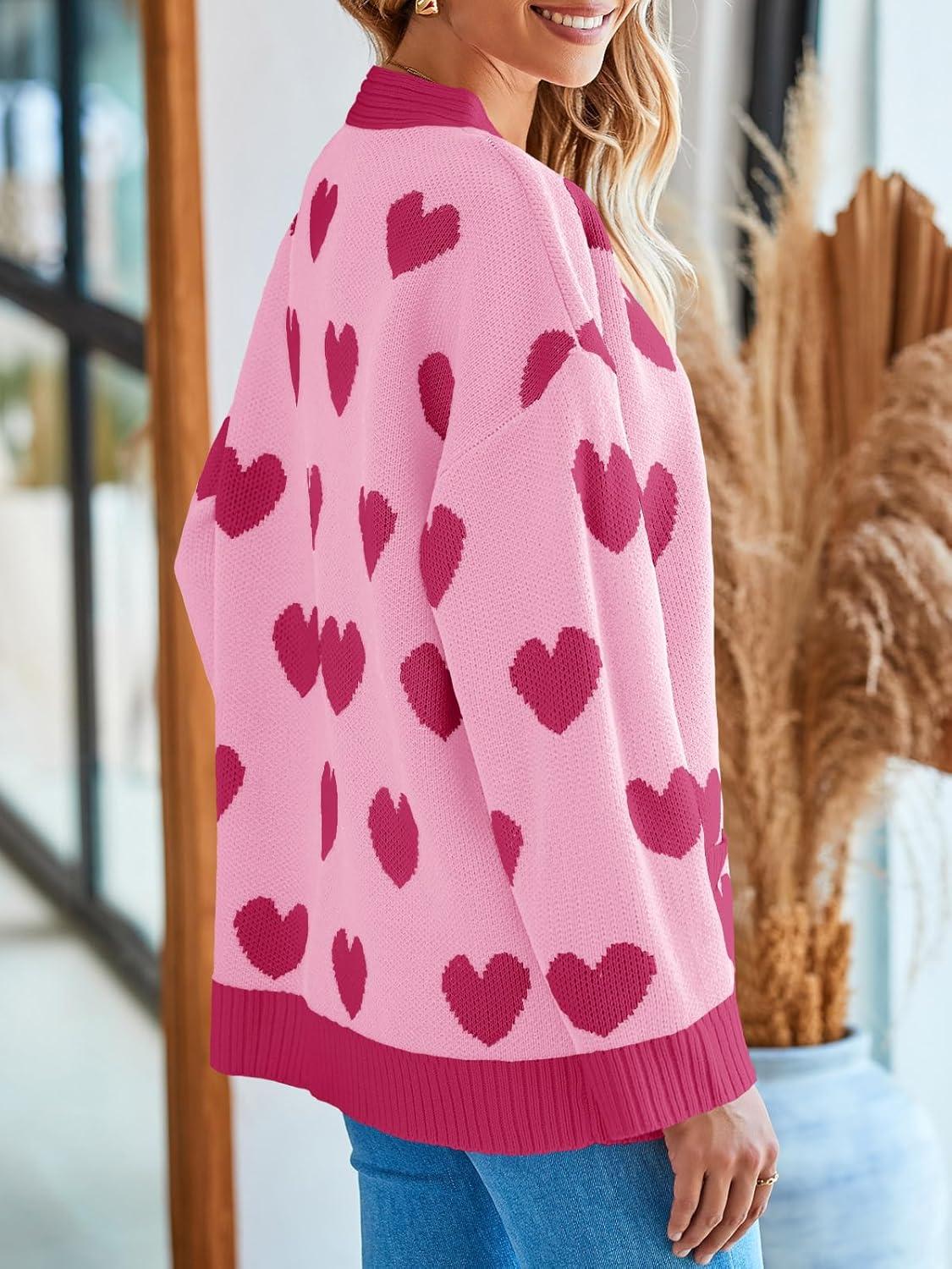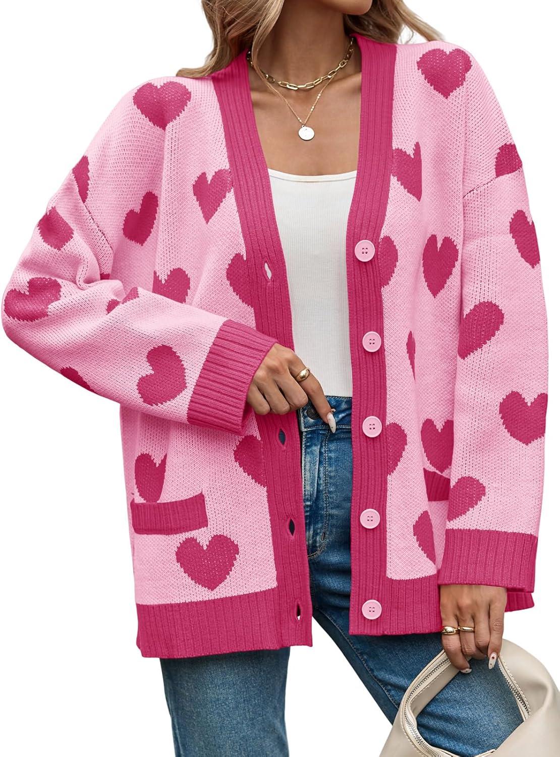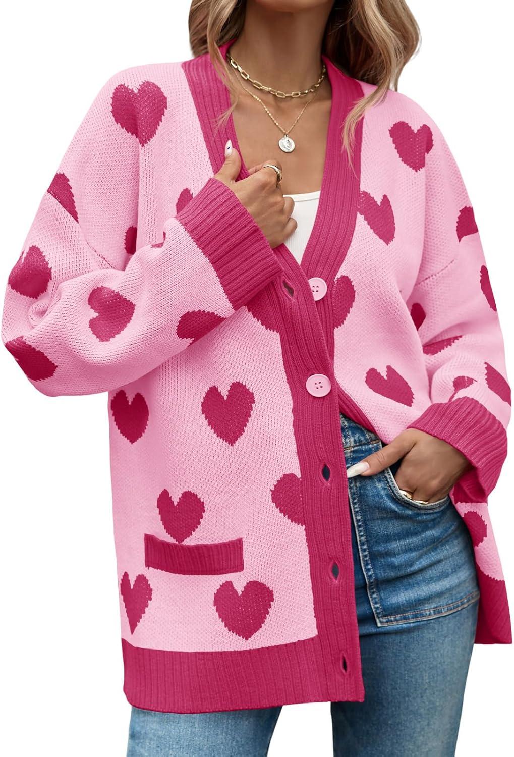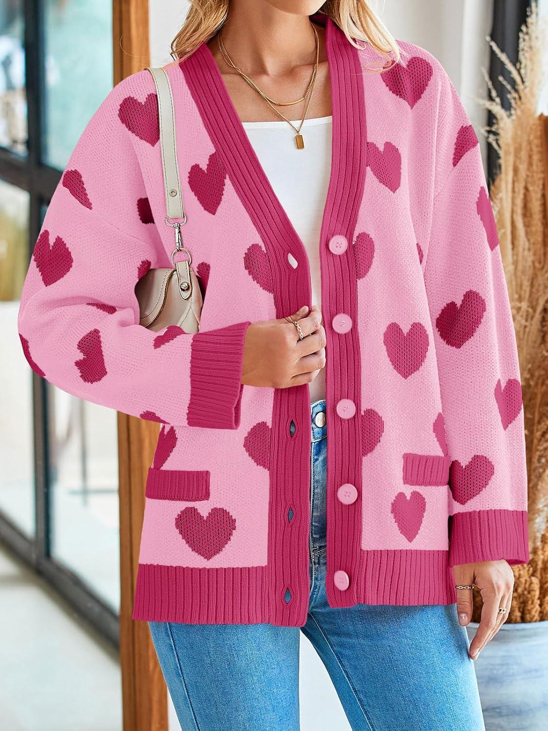 Saodimallsu Womens Oversized Heart Cardigan Color Block V Neck Button Long Sleeve Chunky Valentines Sweaters(Pink&red)