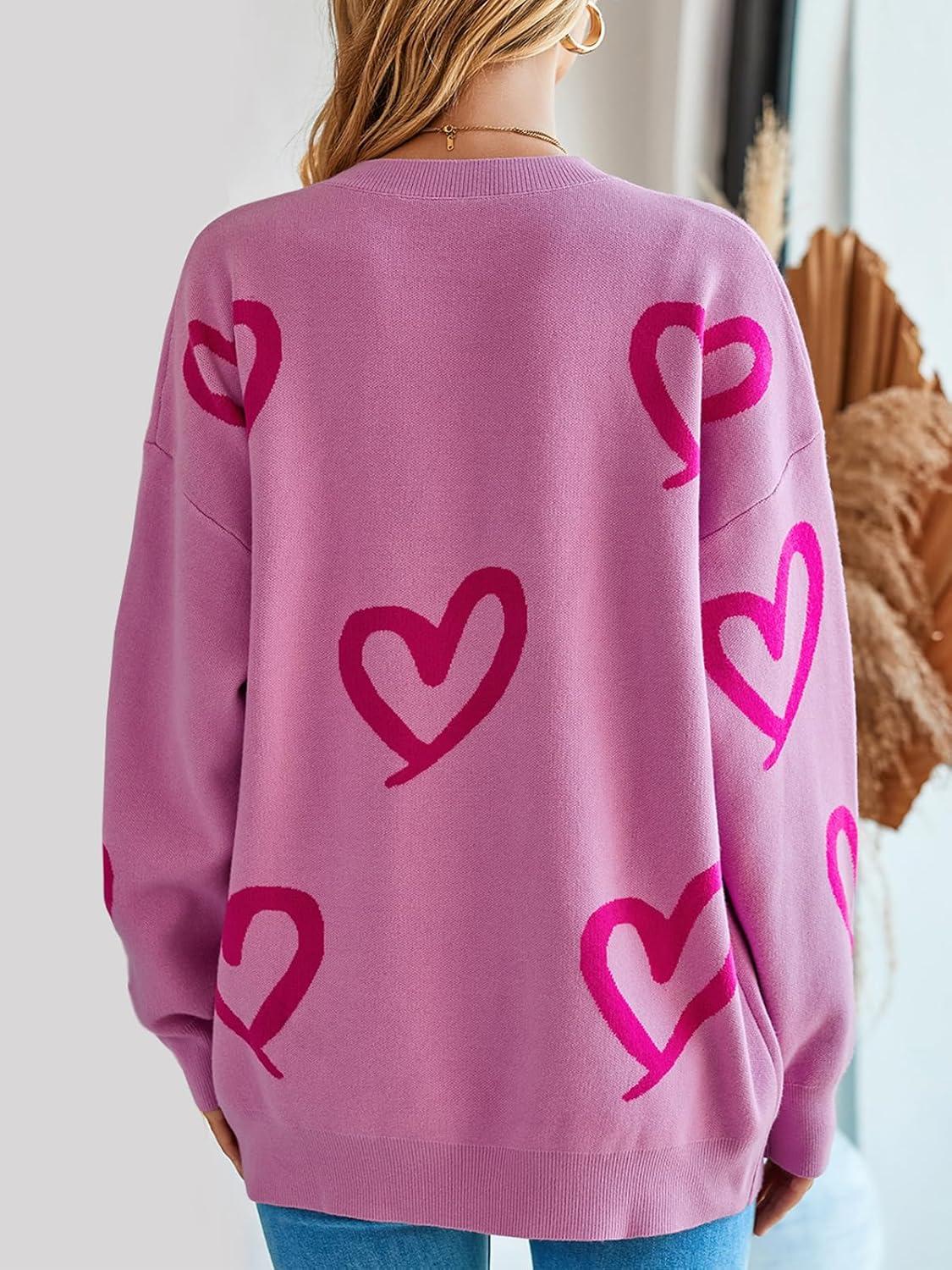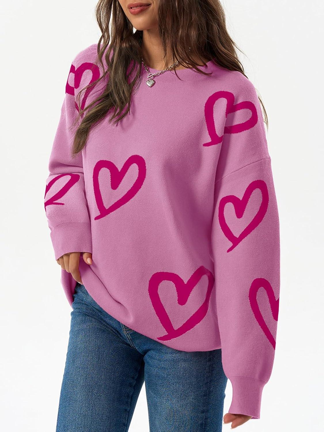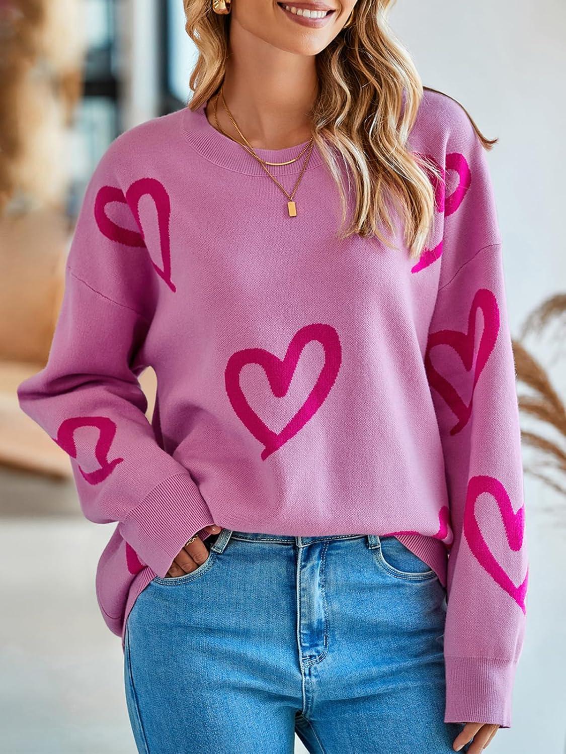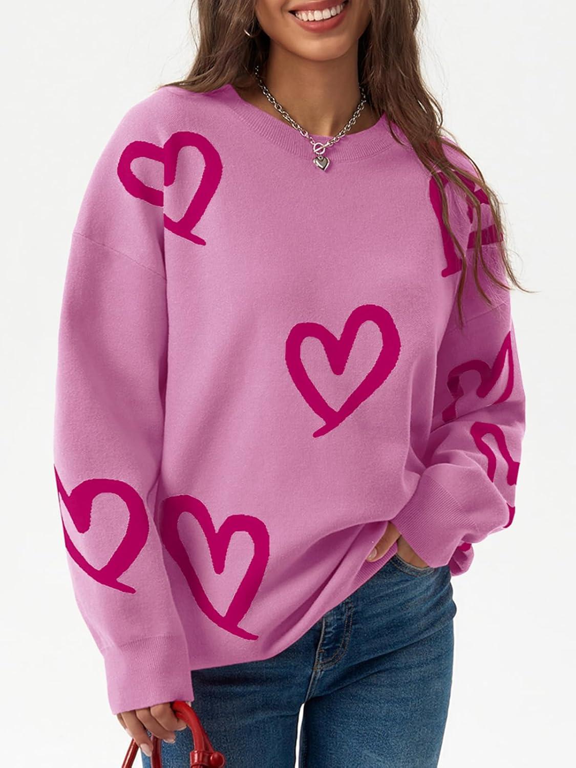 Saodimallsu Womens Oversized Heart Sweater Crew Neck Long Sleeve Knit Cute Valentines Pullover Sweaters(Pink Red)
