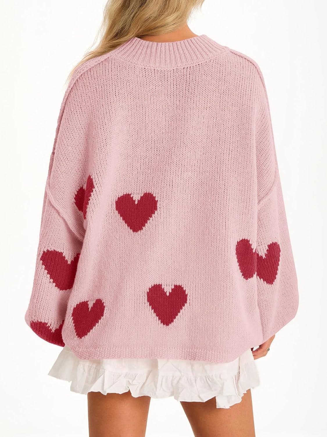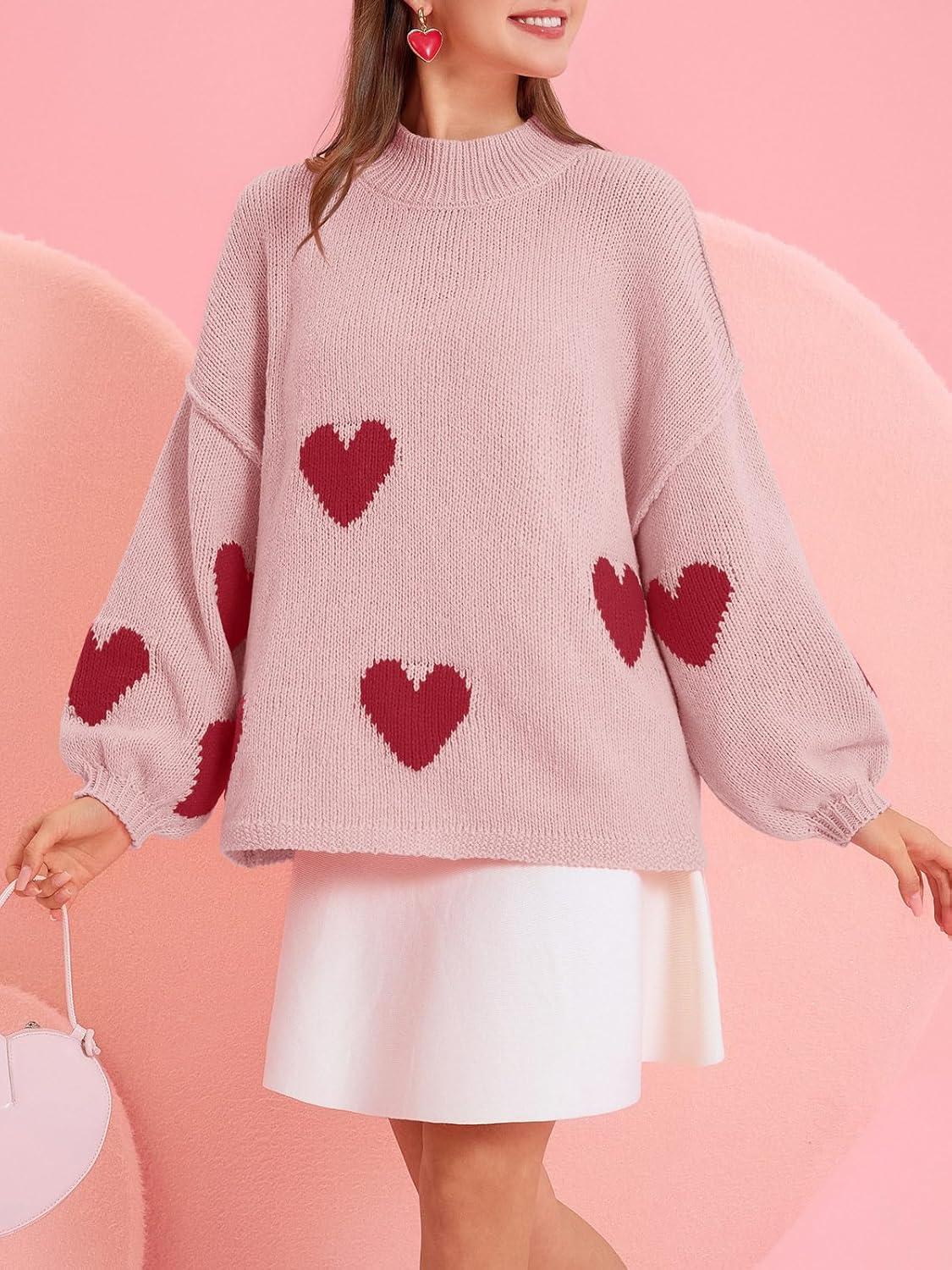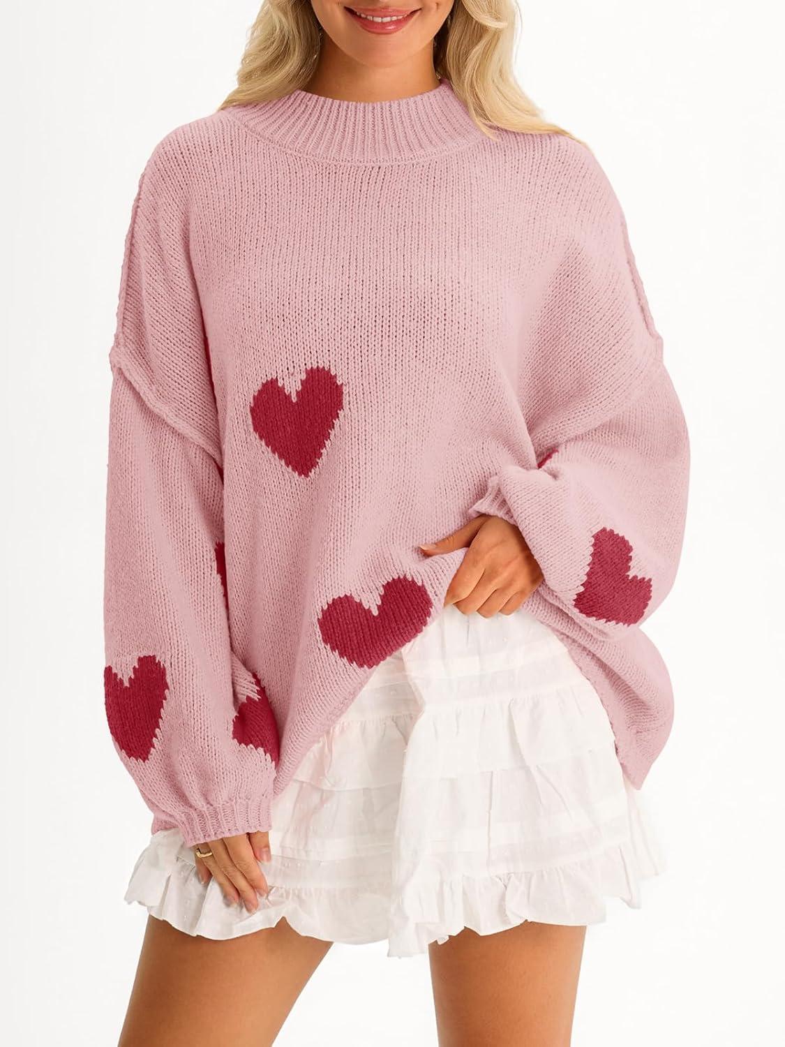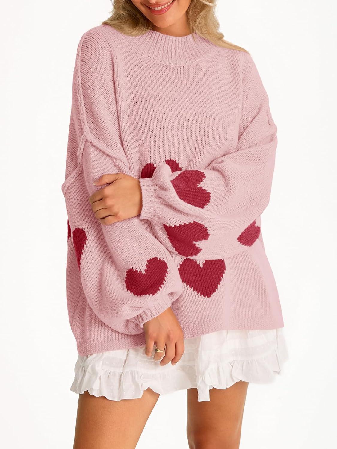 Saodimallsu Womens Oversized Heart Sweater Valentines Cute Mock Neck Chunky Knit Long Sleeve Tunic Sweaters(Pink)