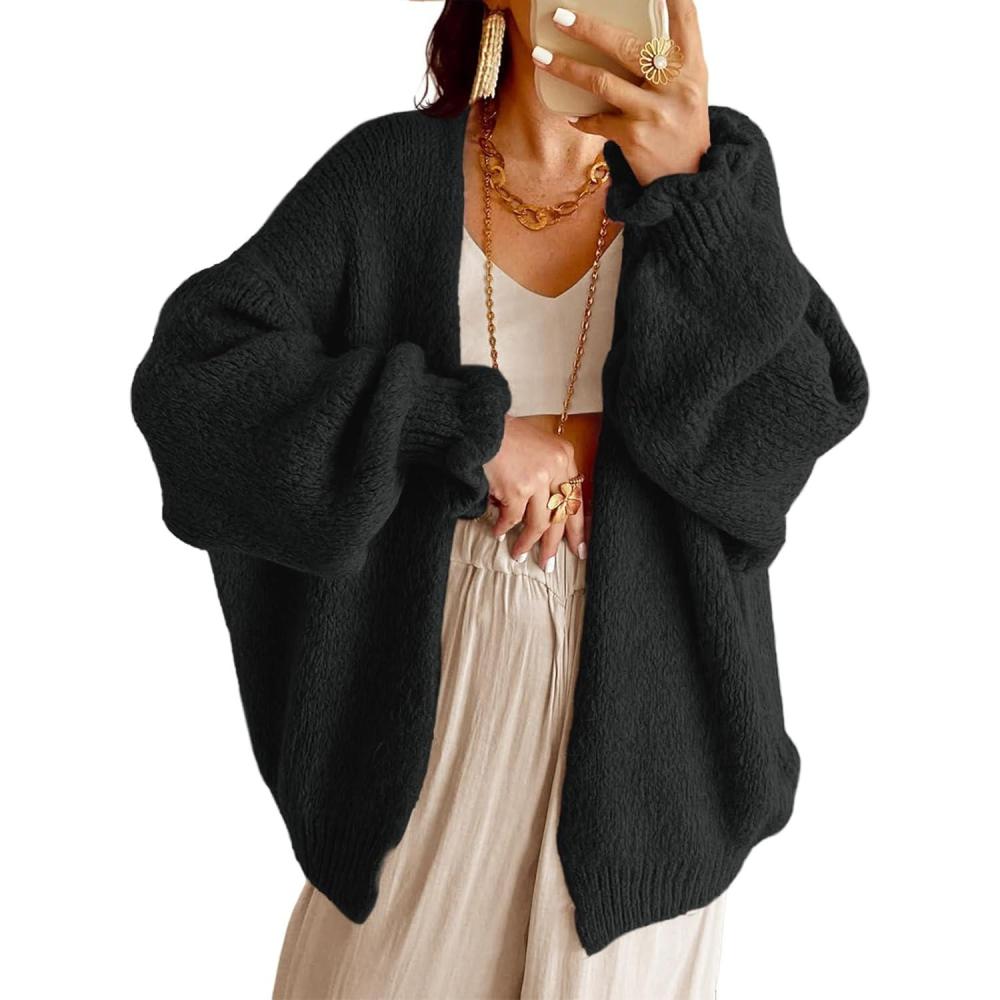 Saodimallsu Womens Oversized Open Front Cardigan Fall Ruffle Lantern Long Sleeve Chunky Knit Loose Sweater Coats(Black)