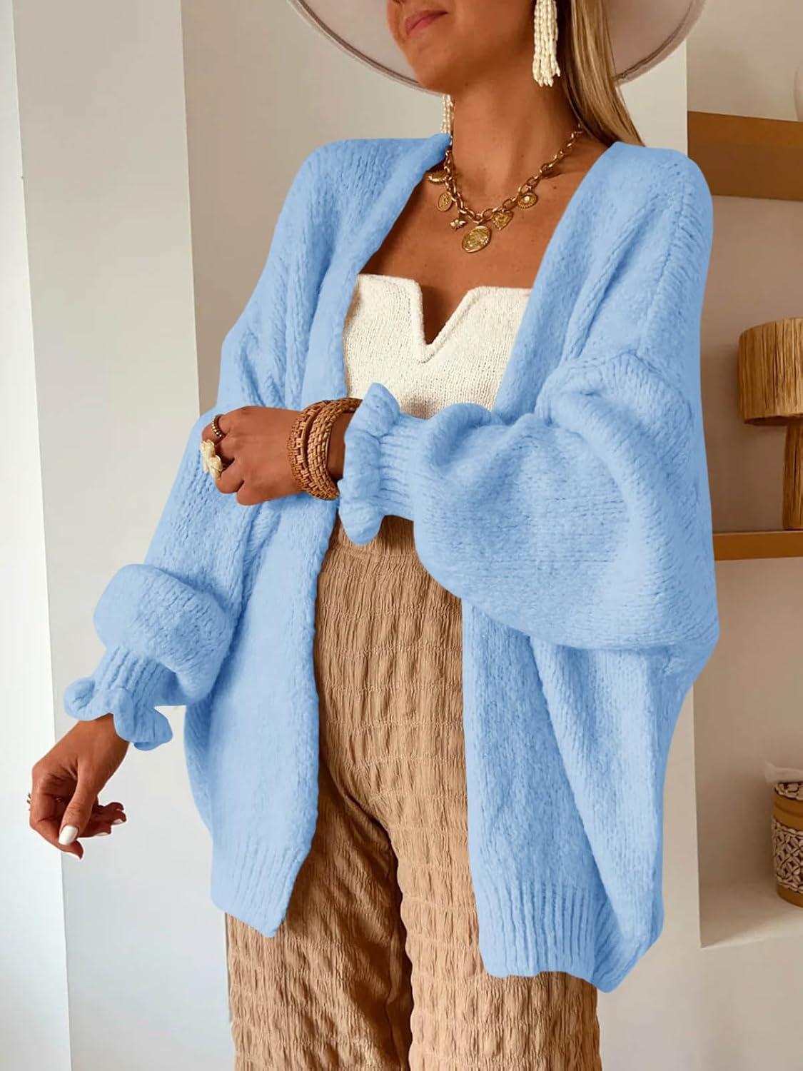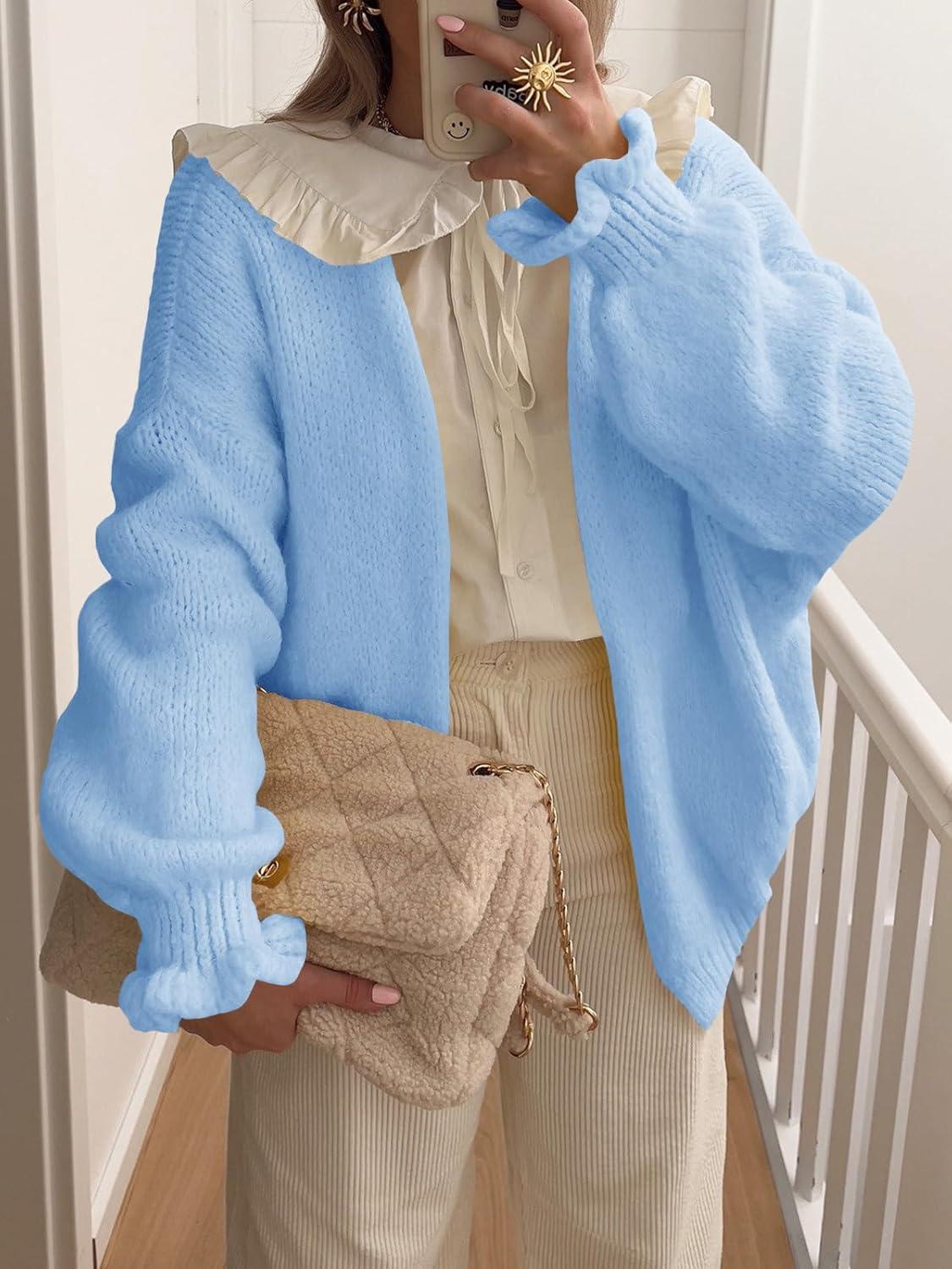 Saodimallsu Womens Oversized Open Front Cardigan Fall Ruffle Lantern Long Sleeve Chunky Knit Loose Sweater Coats(Light Blue)