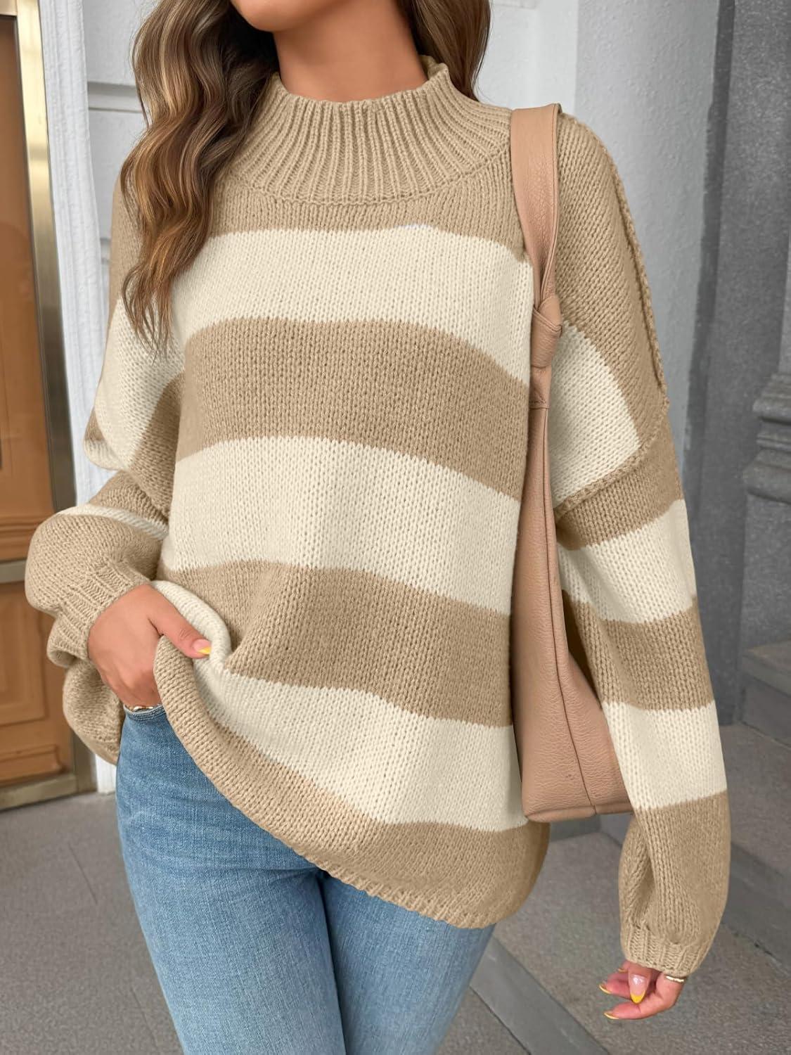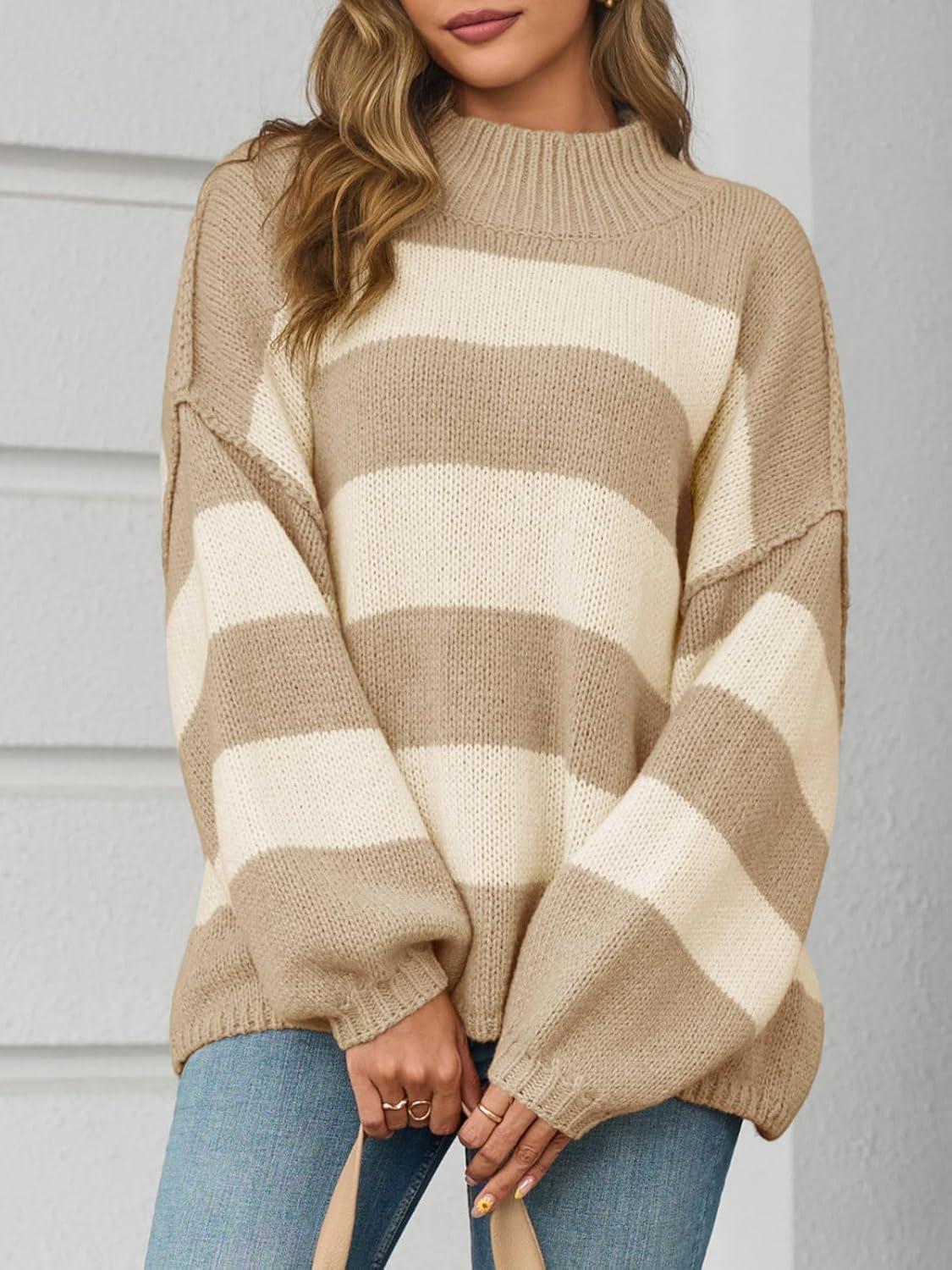 Saodimallsu Womens Oversized Striped Sweater Mock Neck Chunky Knit Lantern Long Sleeve Fall Trendy Tunic Sweaters Top(Light Khaki)