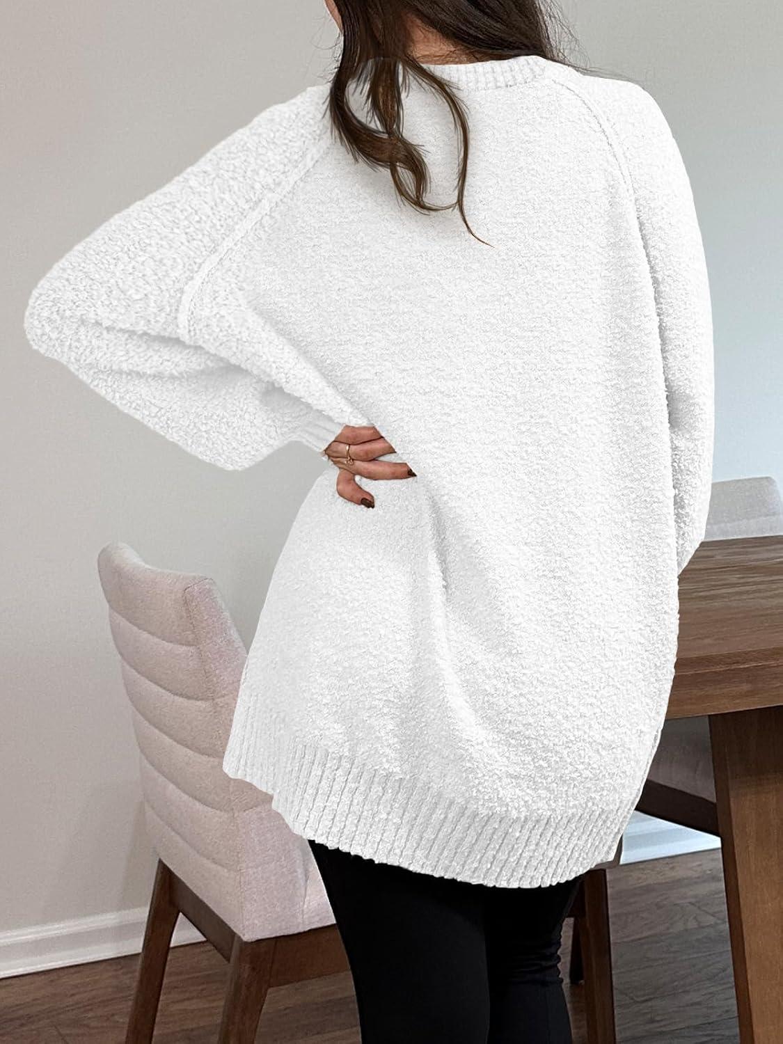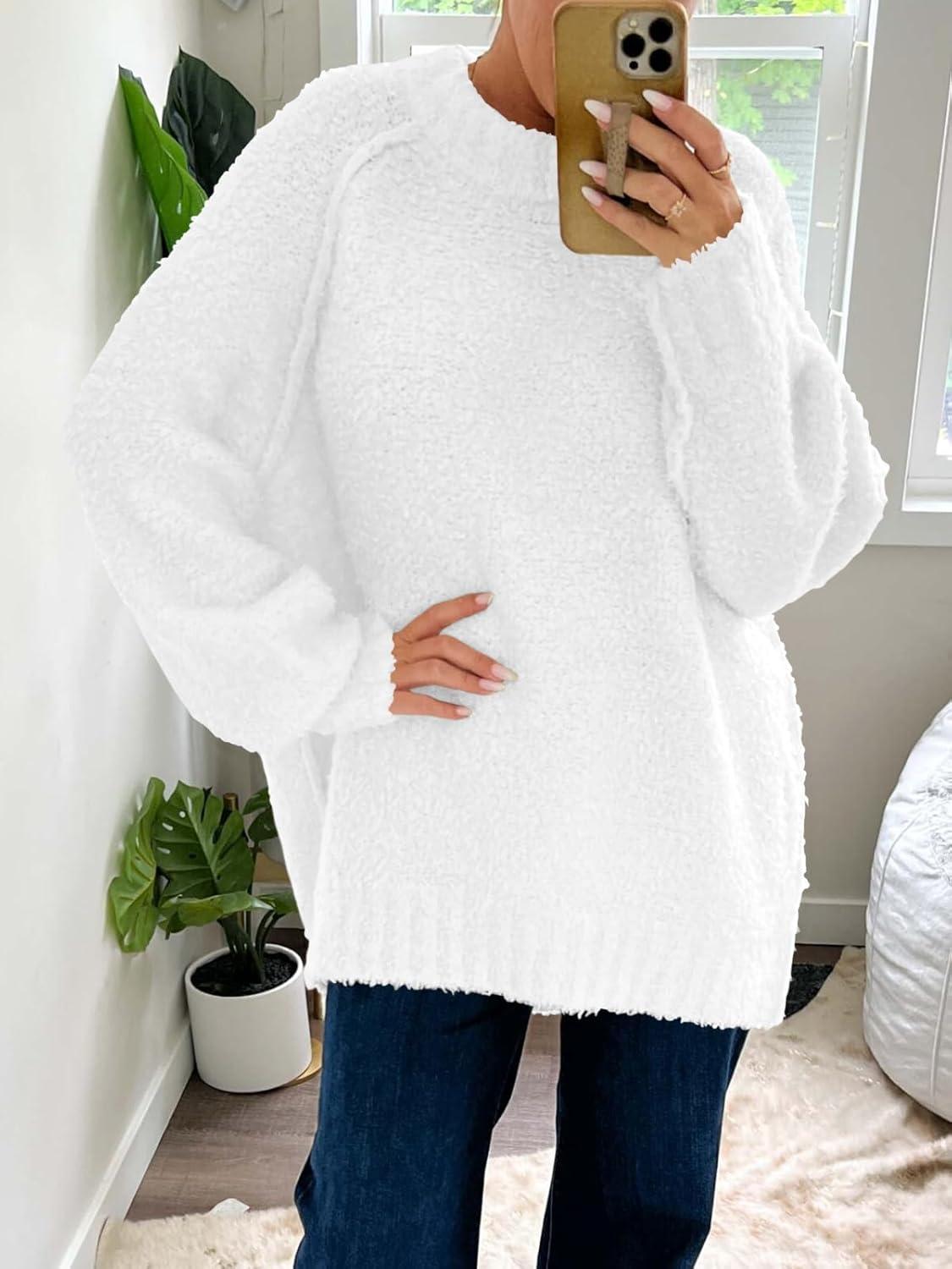 Saodimallsu Womens Oversized Sweater 2025 Fall Trendy Fuzzy Crew Neck Long Sleeve Casual Tunic Sweaters(White)