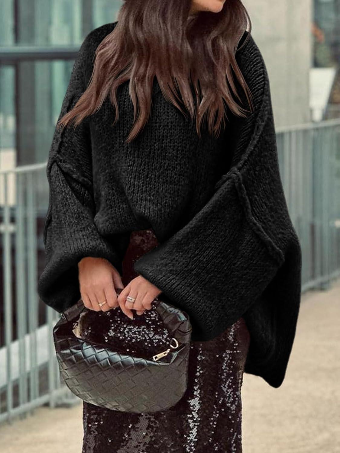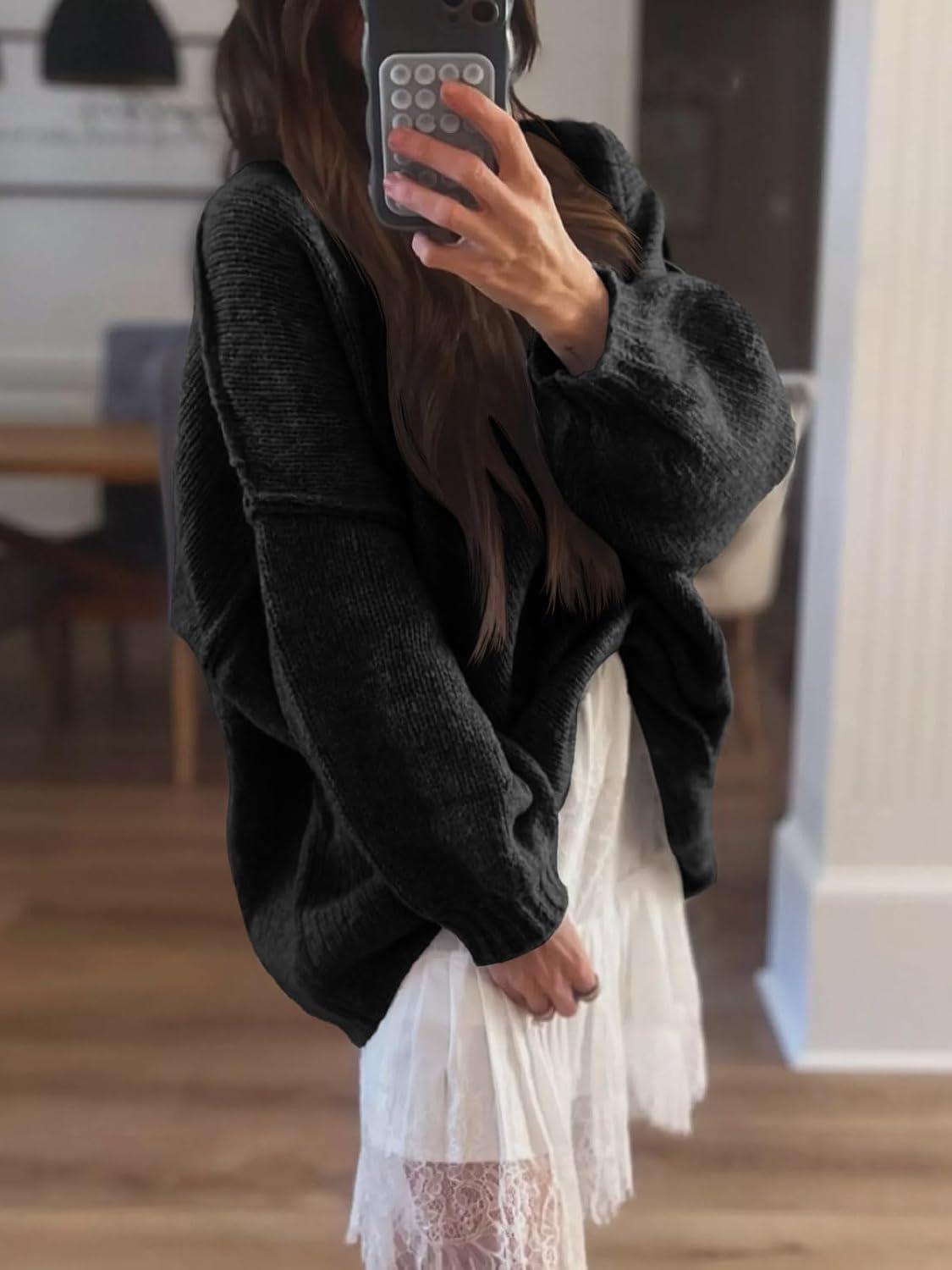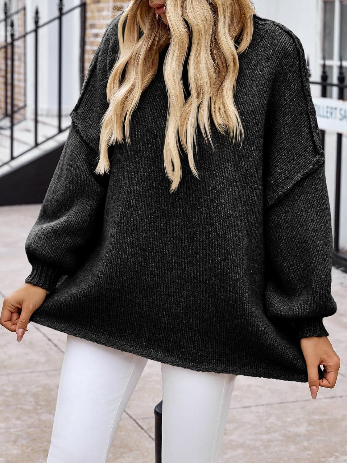 Saodimallsu Womens Oversized Sweater Chunky Crew Neck Long Lantern Sleeve Knit Fall Trendy Tunic Sweaters Top(Black)