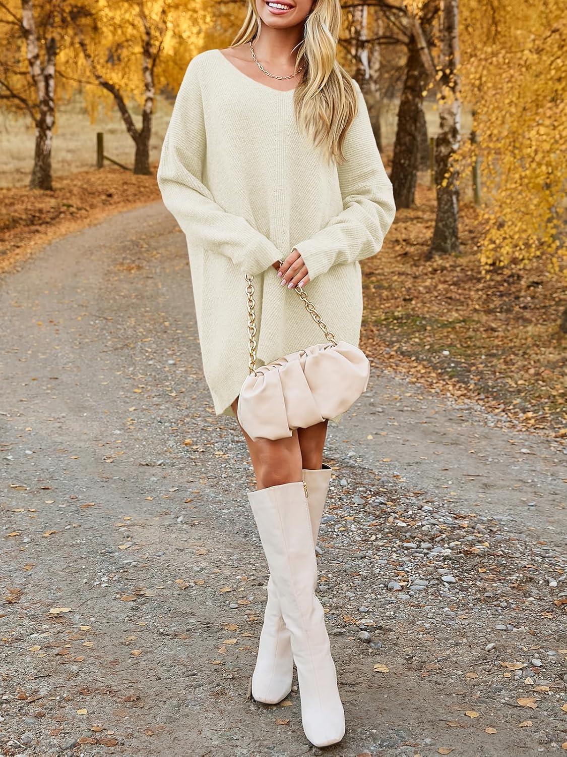 Saodimallsu Womens Oversized Sweater Dress Fall V Neck Ribbed Knit Long Sleeve Casual Loose Mini Pullover Dresses(Beige)