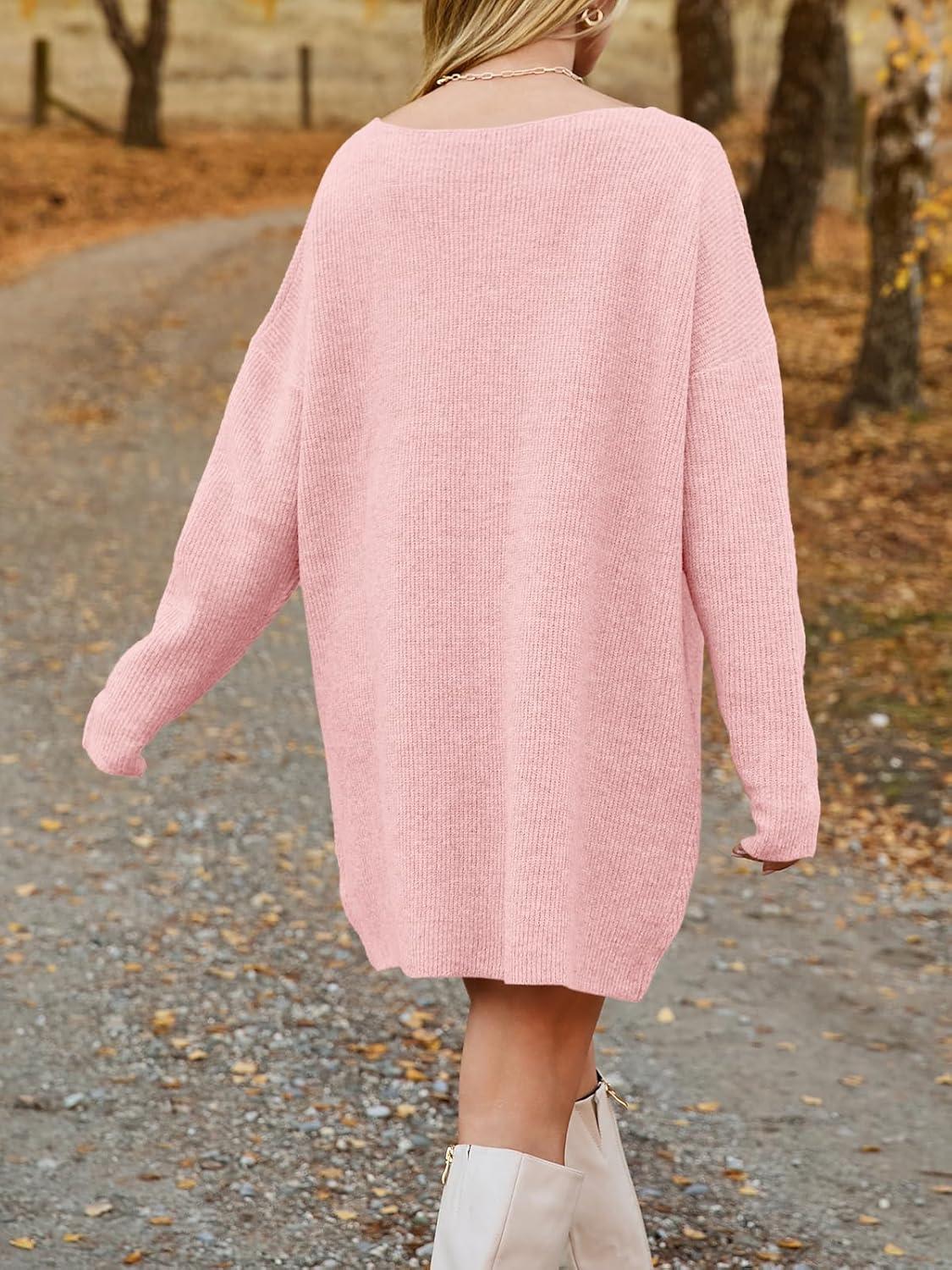 Saodimallsu Womens Oversized Sweater Dress Fall V Neck Ribbed Knit Long Sleeve Casual Loose Mini Pullover Dresses(Pink)