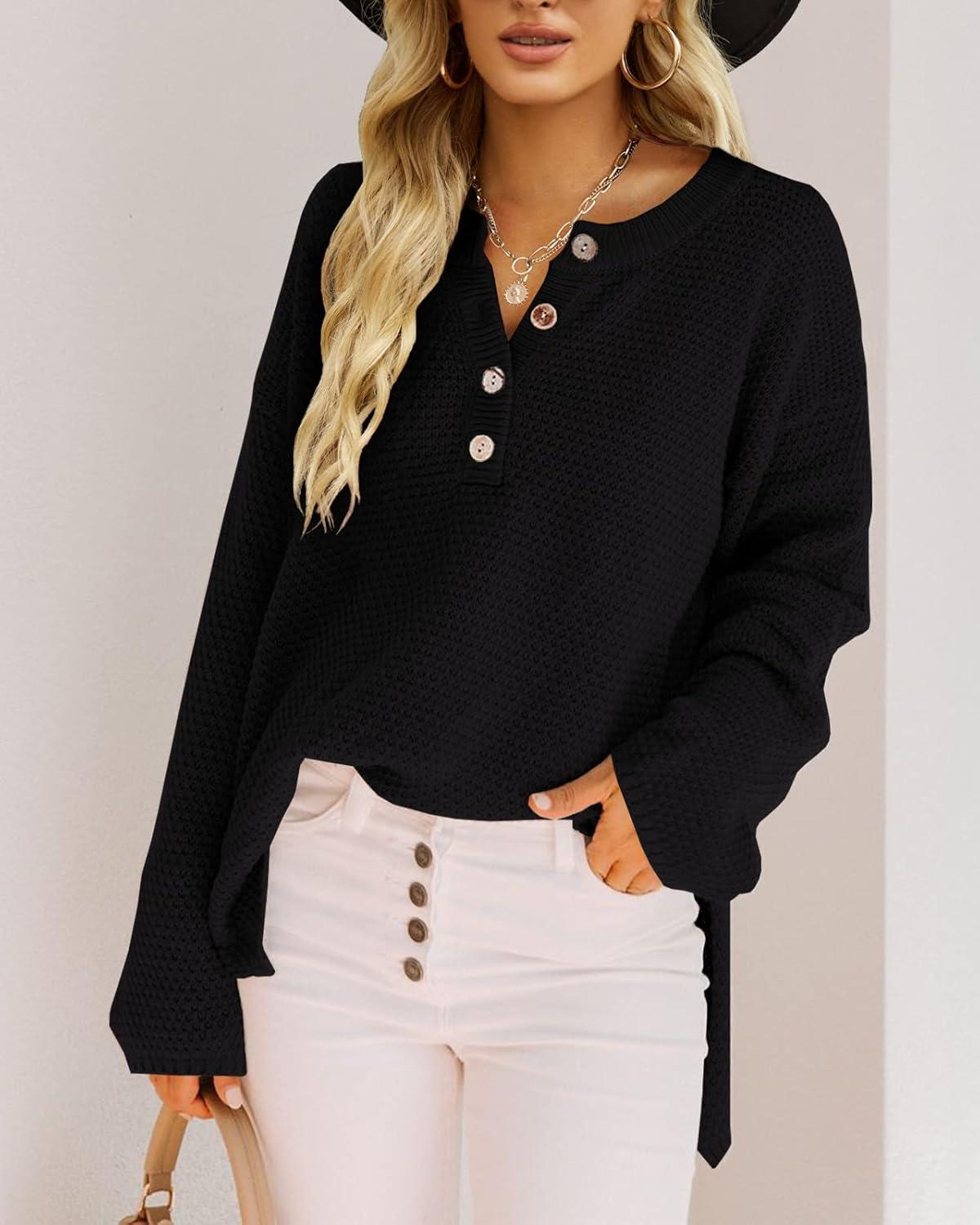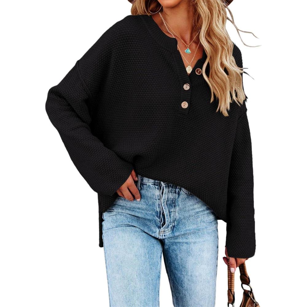 Saodimallsu Women’s Oversized Sweaters Batwing Long Sleeve Loose V Neck Button Henley Tops Pullover Knit Jumper(Black)