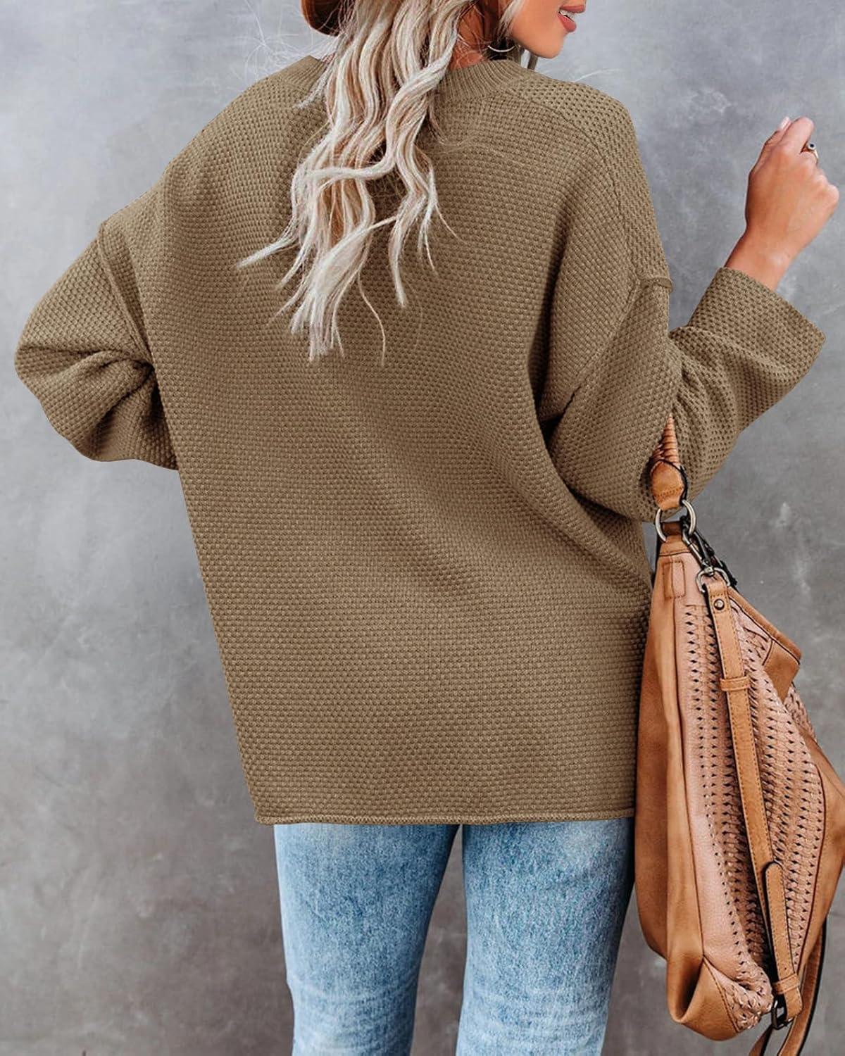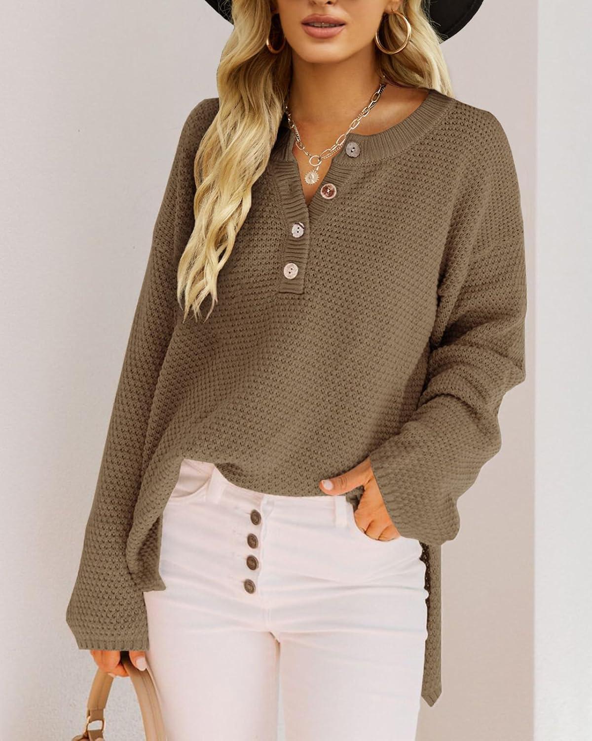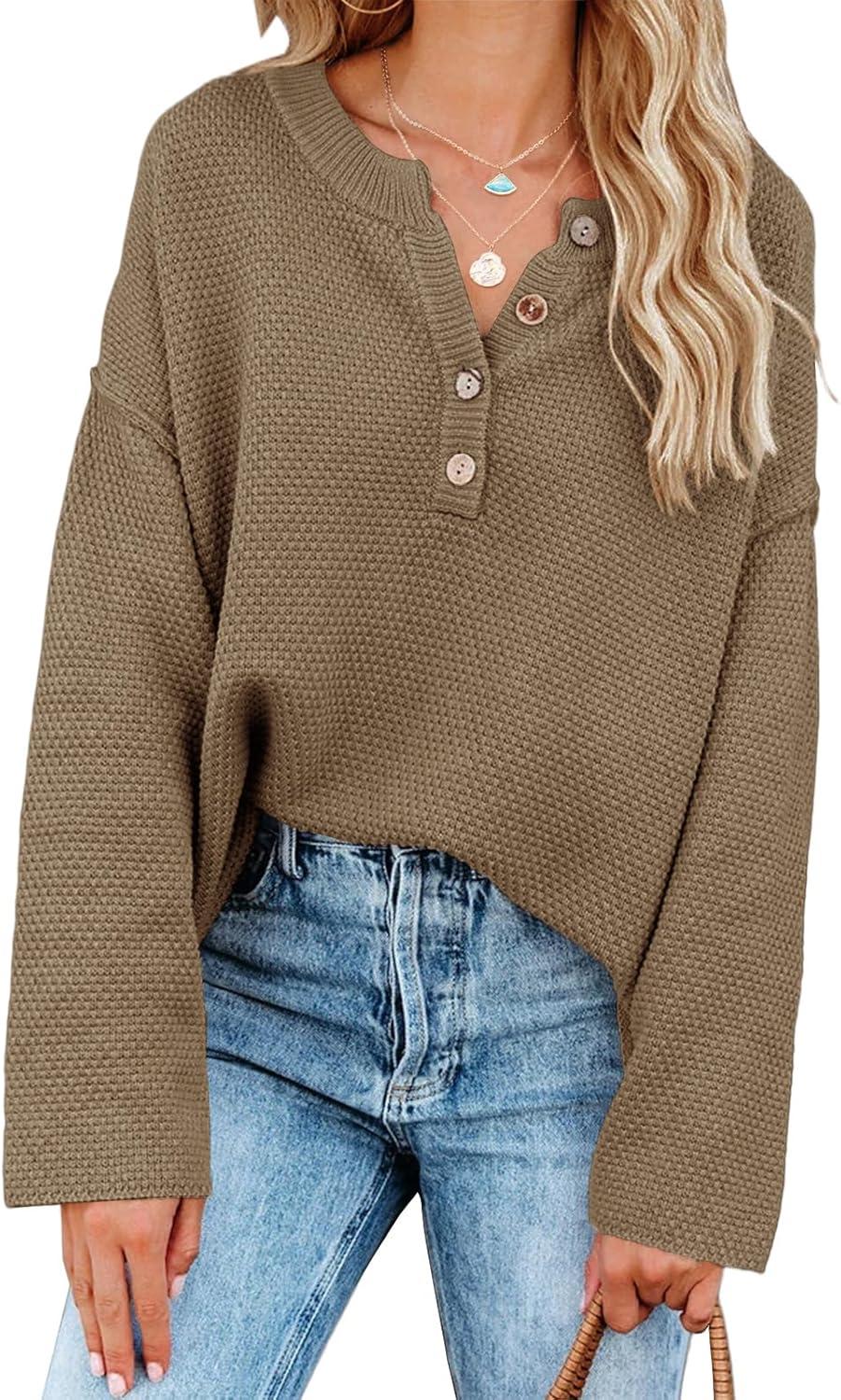 Saodimallsu Women’s Oversized Sweaters Batwing Long Sleeve Loose V Neck Button Henley Tops Pullover Knit Jumper(Z1 Coffee)