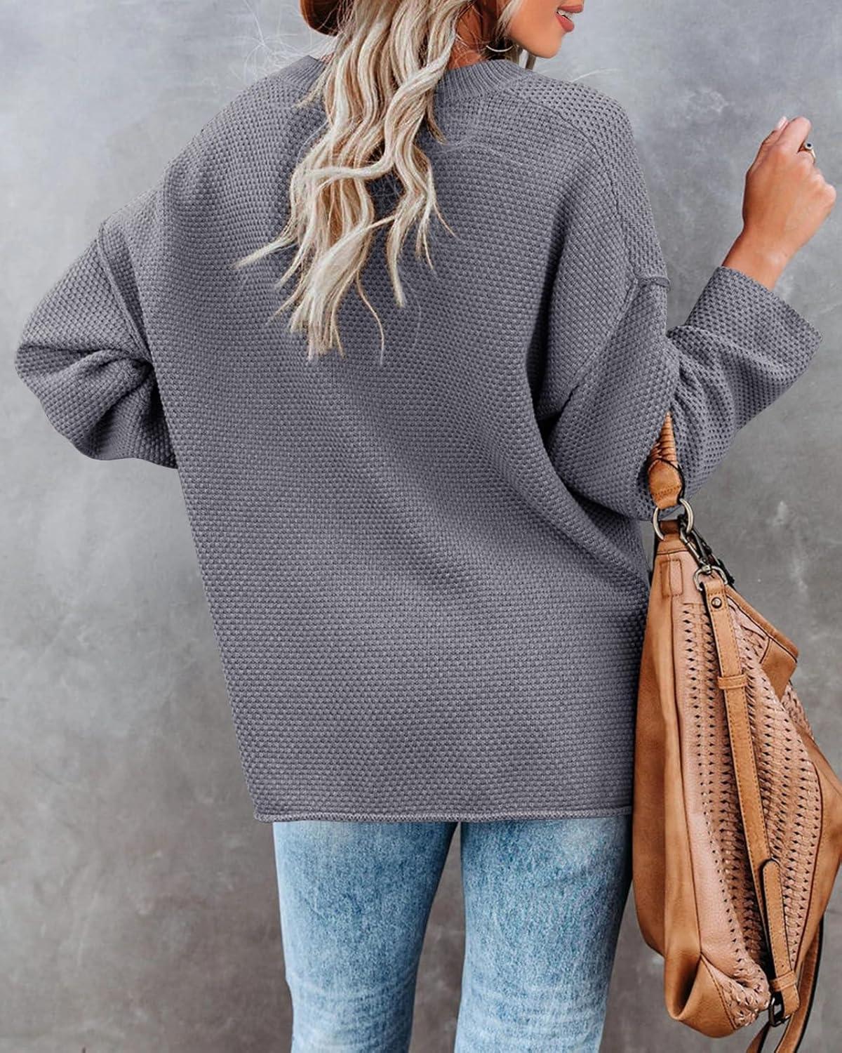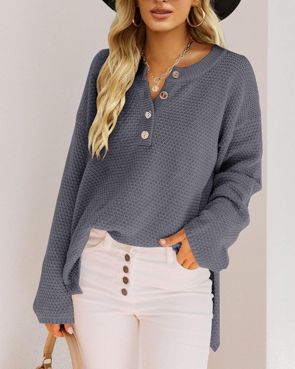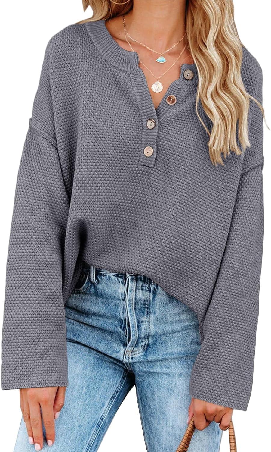 Saodimallsu Women’s Oversized Sweaters Batwing Long Sleeve Loose V Neck Button Henley Tops Pullover Knit Jumper(Z1 Dark Grey)